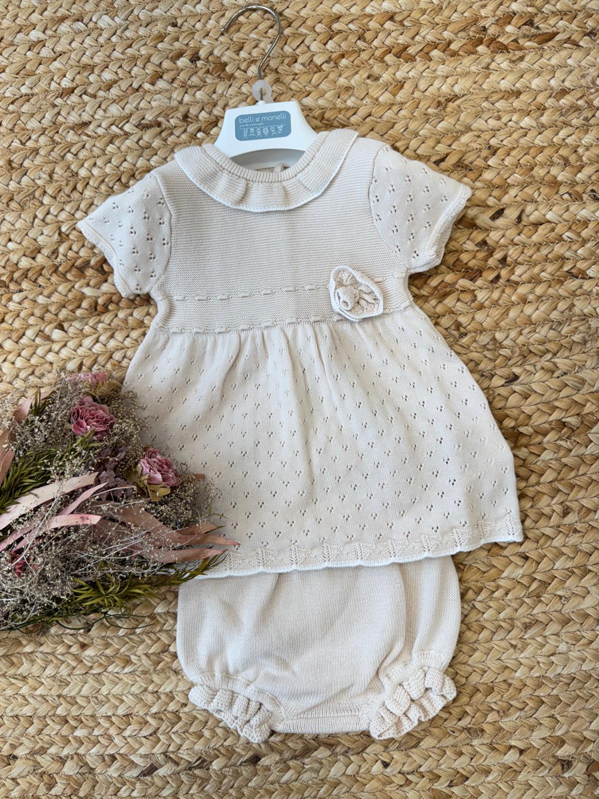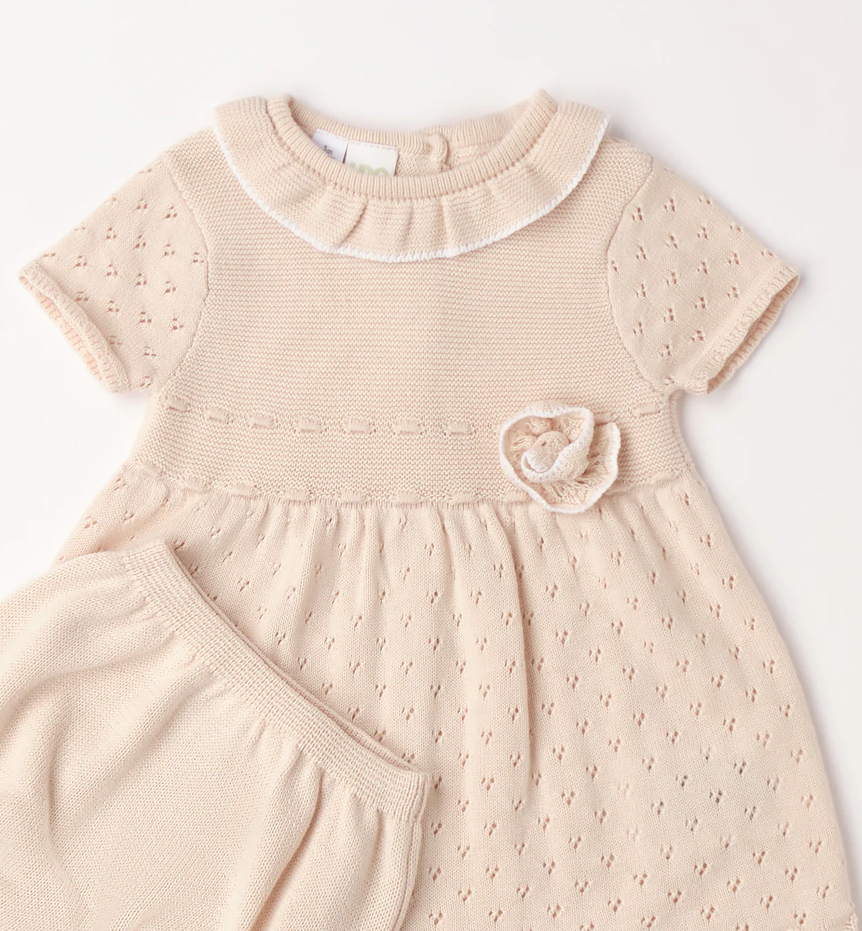 Un completo delicato e raffinato per neonata in 100% cotone , composto da abitino a manica corta con lavorazione traforata e culotte coordinata. Il colletto con ruches, il fiore applicato in vita e il bordo smerlato sul fondo donano un’eleganza sobria, perfetta per le prime uscite e le occasioni speciali.