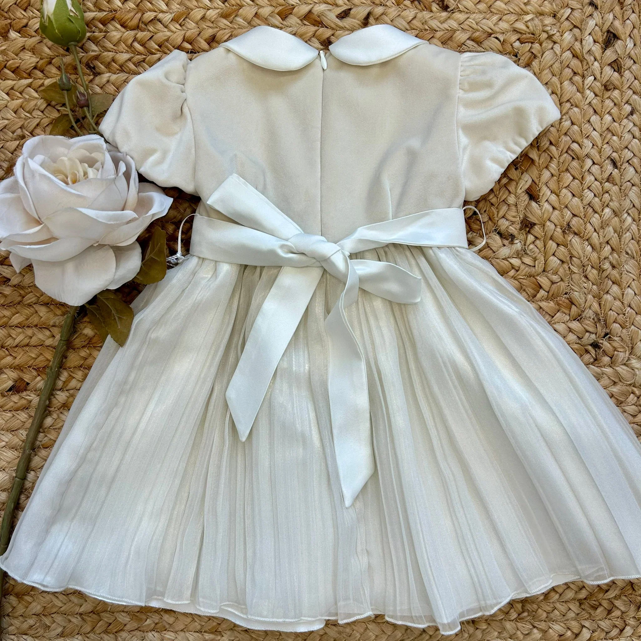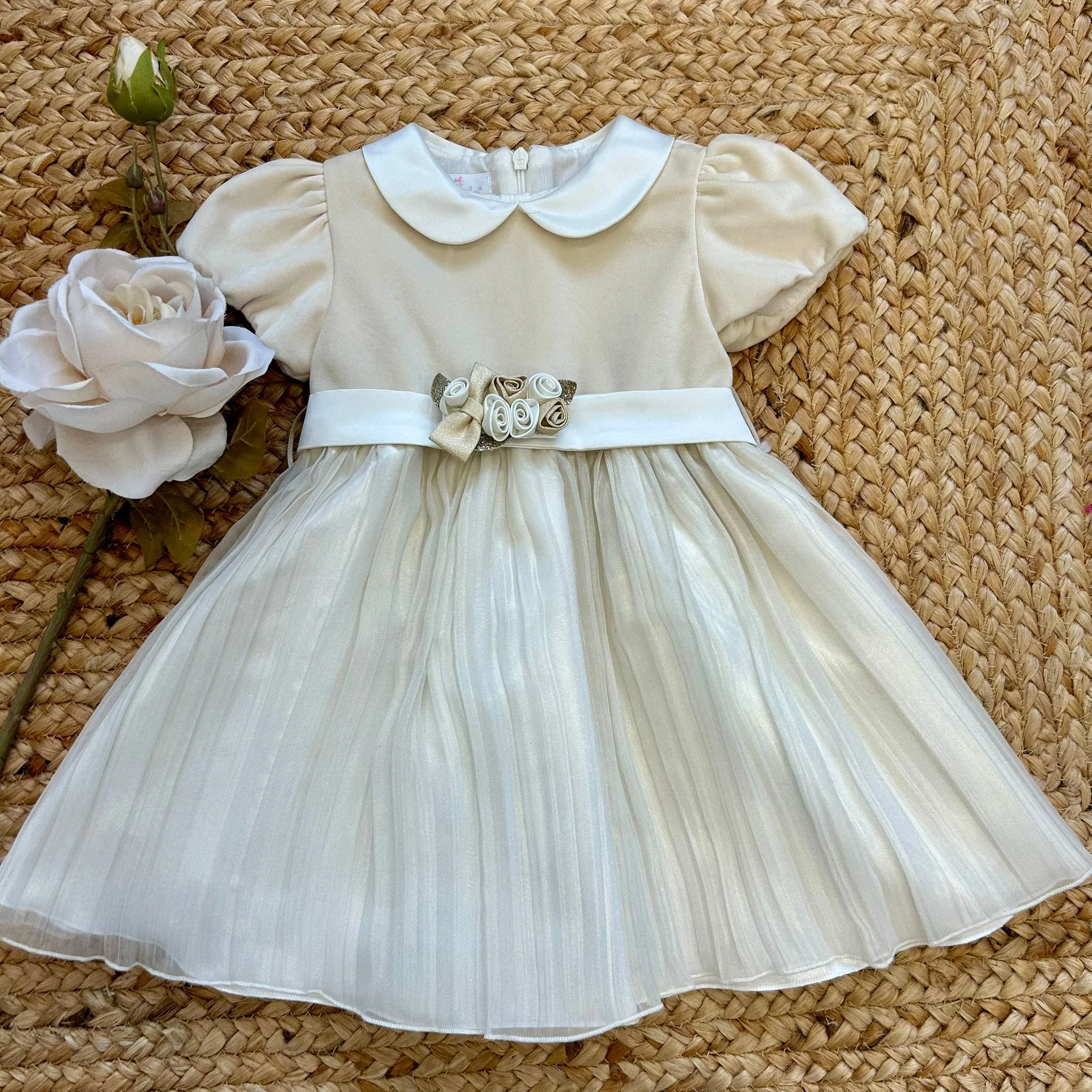 Abito elegante con corpetto in velluto beige e gonna plissé effetto dorato. Il punto vita è impreziosito da un raffinato bouquet di roselline e fiocco centrale. Maniche a sbuffo, colletto rotondo e chiusura con zip sul retro. Perfetto per il giorno del battesimo.