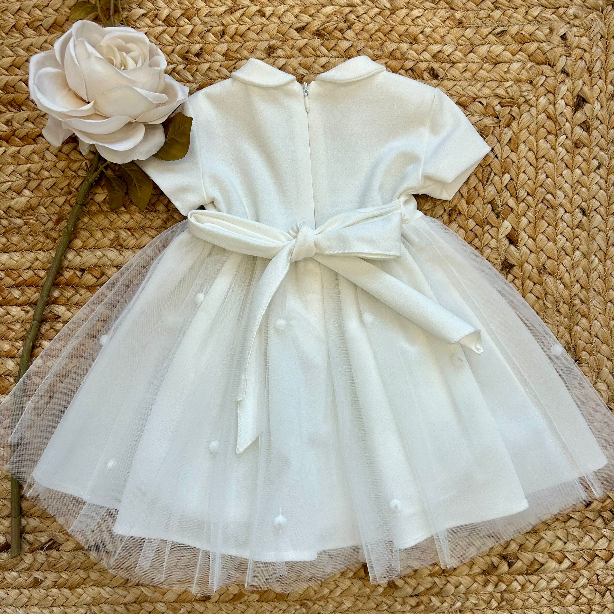 Abito panna con corpetto liscio e gonna in tulle leggero impreziosita da piccoli pois in rilievo. Colletto rotondo e maniche corte per un’eleganza delicata e raffinata. Fiocco sul retro e chiusura con zip invisibile. Perfetto per il giorno del battesimo.