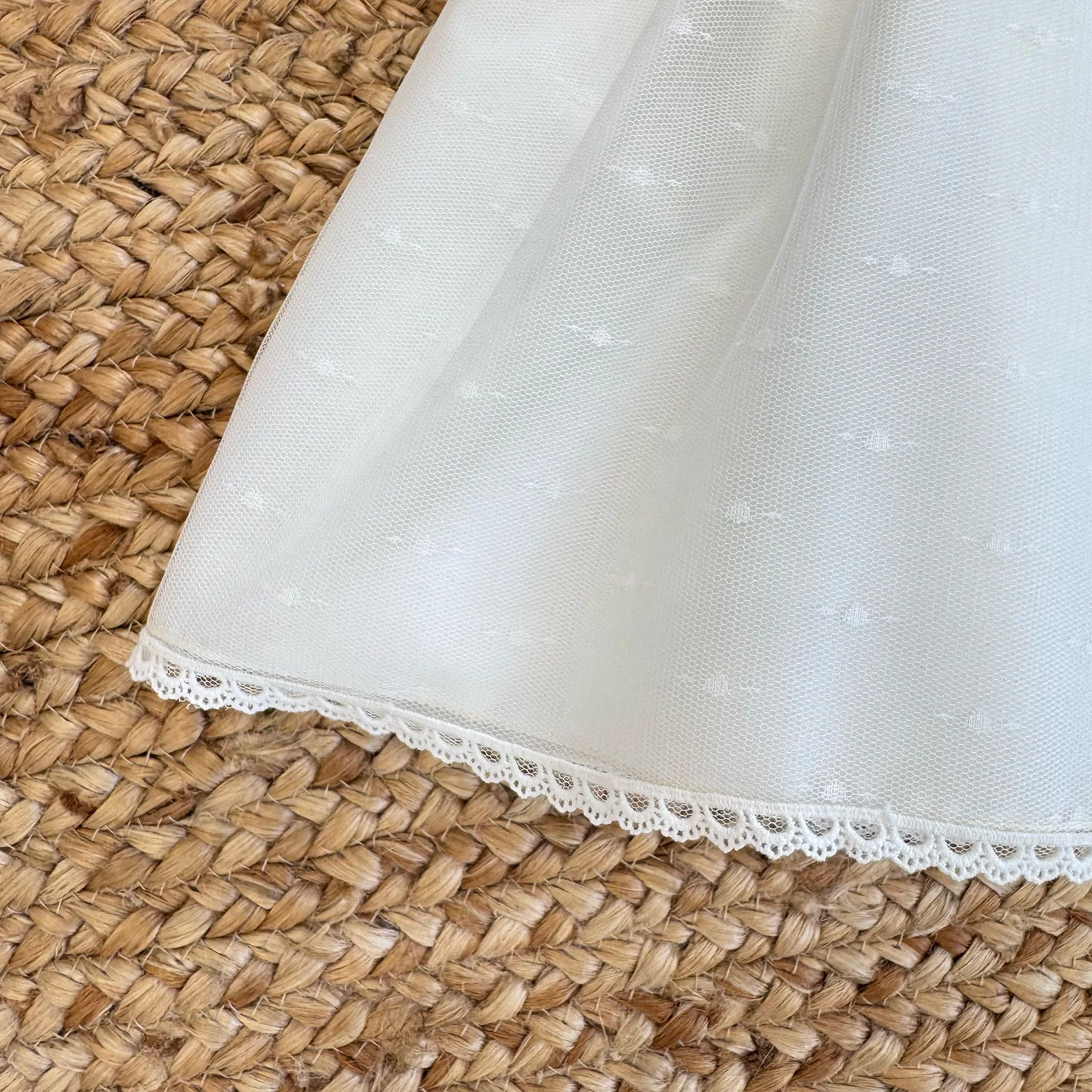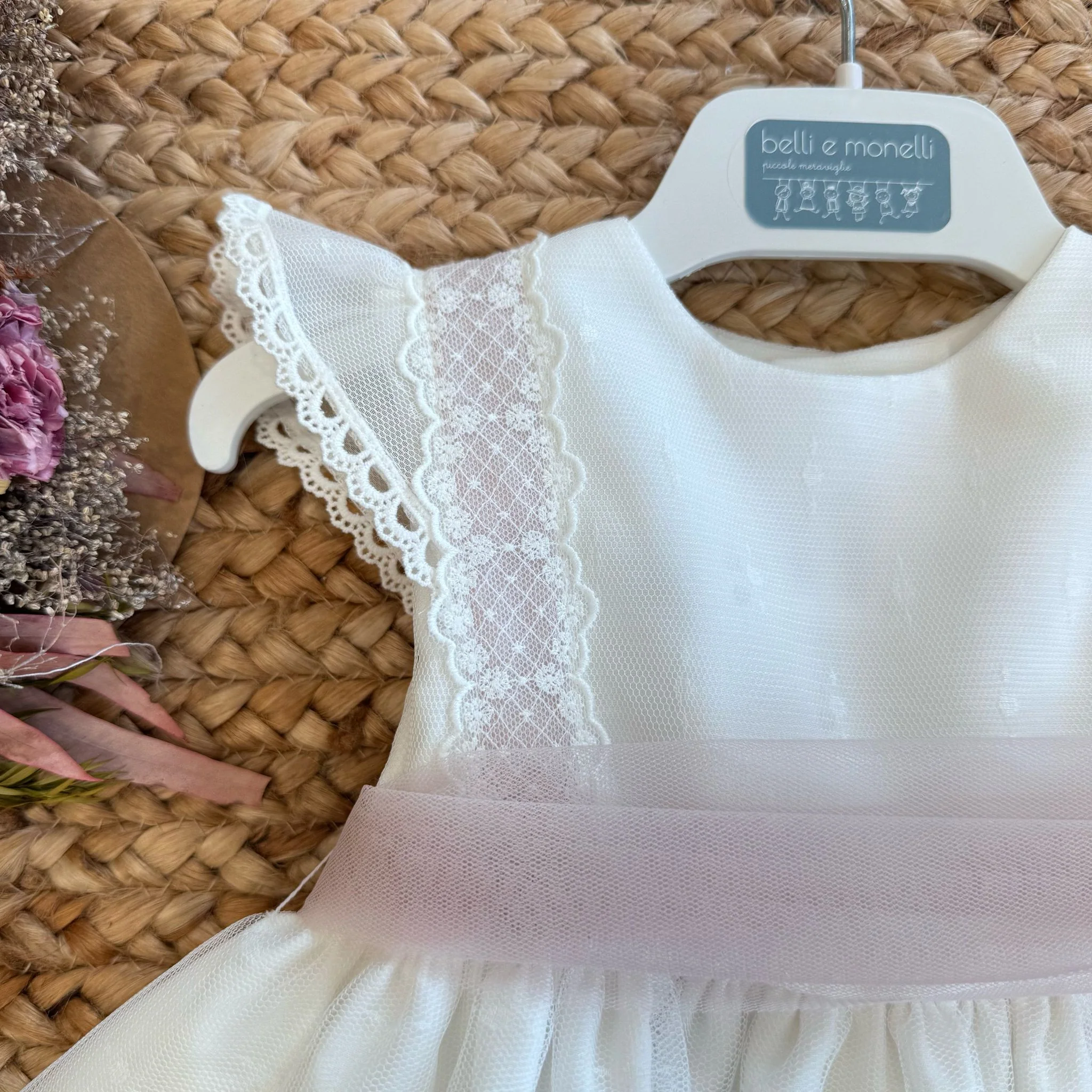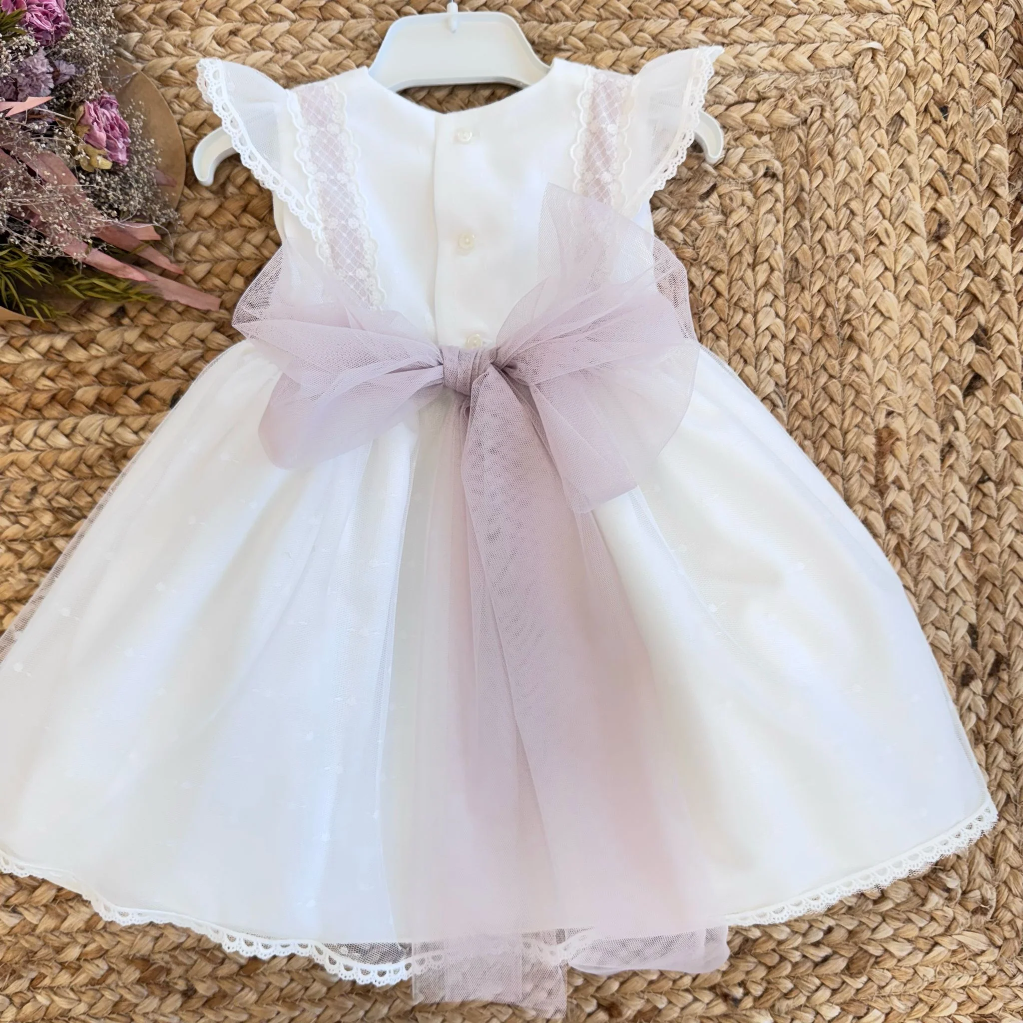 Un abito bianco che conquista al primo sguardo. Le spalline in pizzo, la linea morbida e il maxi fiocco rosa cipria sul retro lo rendono perfetto per un battesimo o una cerimonia indimenticabile. Un look romantico, delicato e luminoso per la tua neonata.