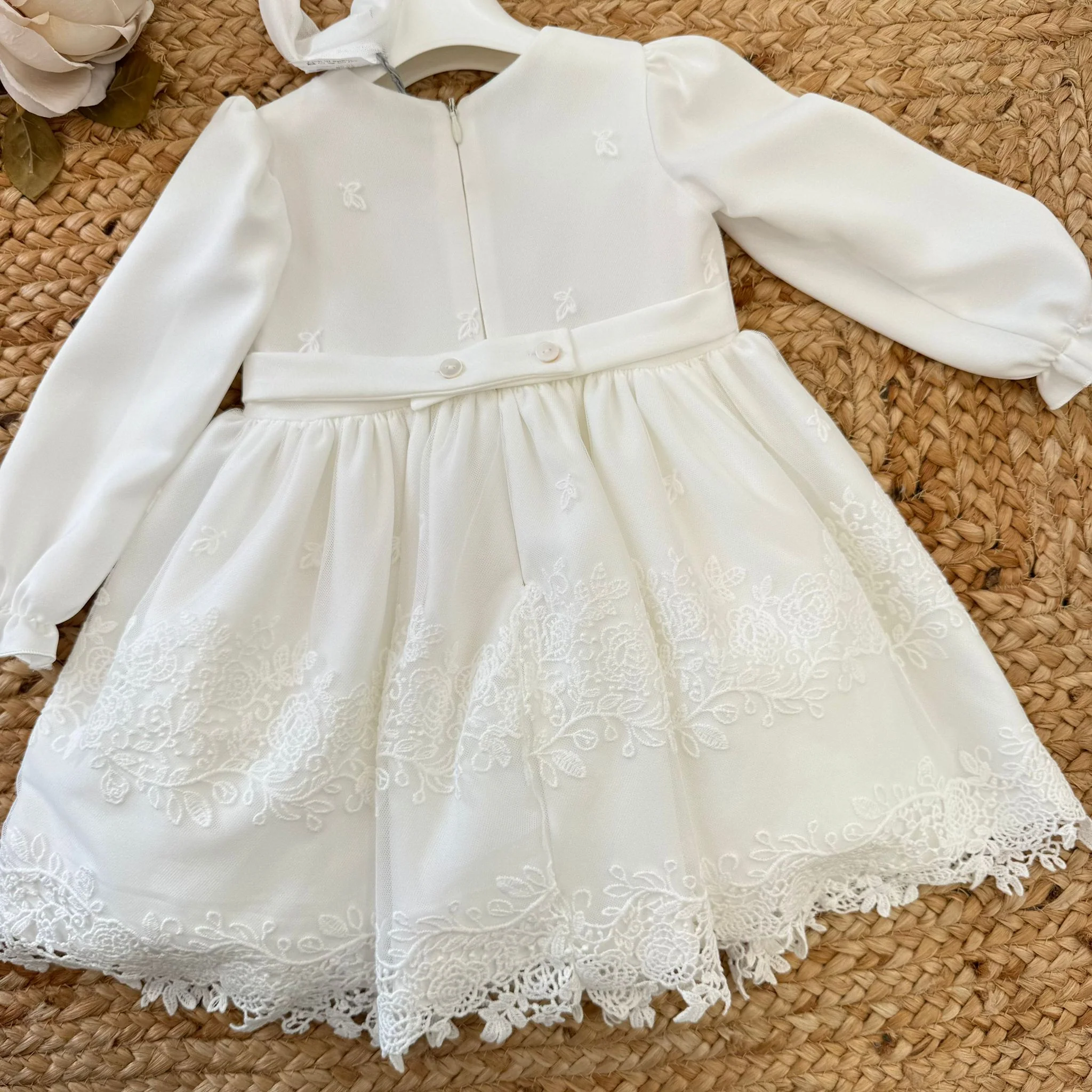 Abito da battesimo total white per bimba, dedicato alle mamme che amano la purezza del bianco. Realizzato in tessuto leggero con maniche lunghe, fiocco centrale e ricami in macramè sul fondo. Completo di fascia coordinata con fiocco. Un modello elegante, raffinato e senza tempo, perfetto per il giorno del battesimo.