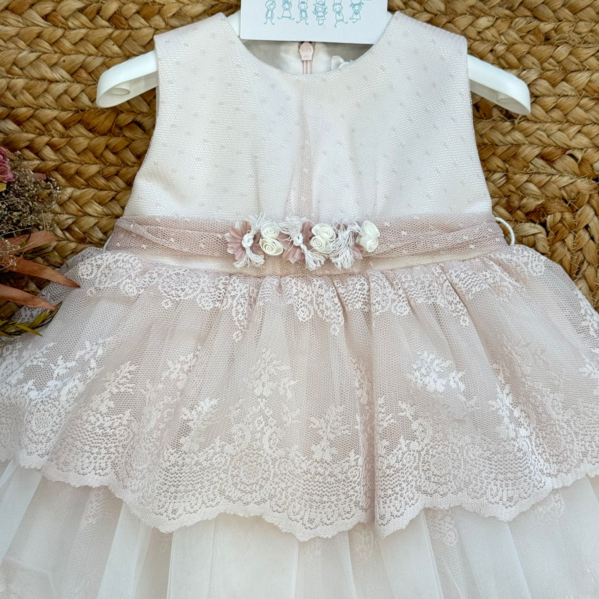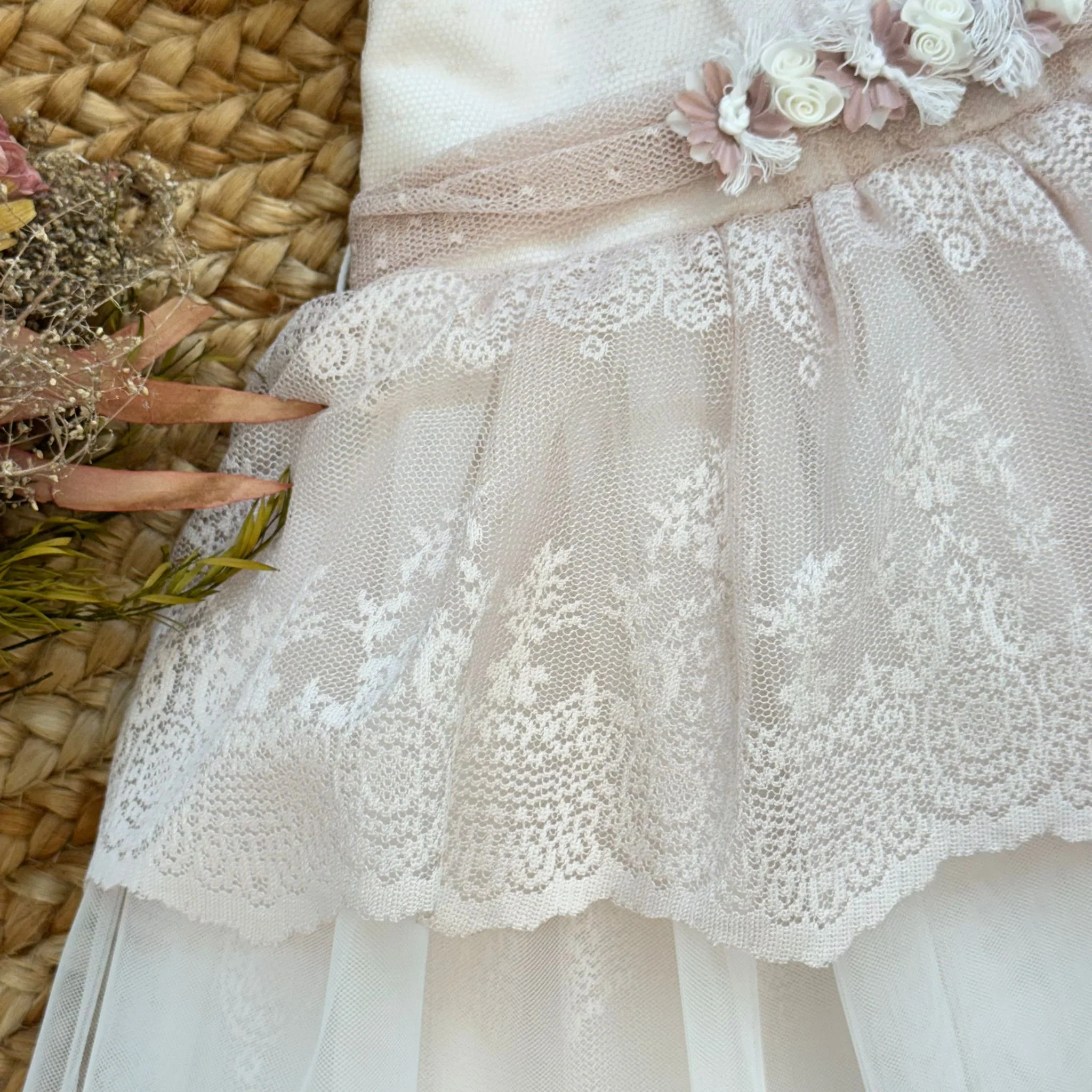 Il corpetto presenta una raffinata lavorazione con piccoli rilievi che donano luce e texture al tessuto, creando un effetto elegante e sofisticato. La vita è impreziosita da una delicata fascia in tulle cipria decorata con piccoli fiori applicati che aggiungono un tocco romantico e femminile.