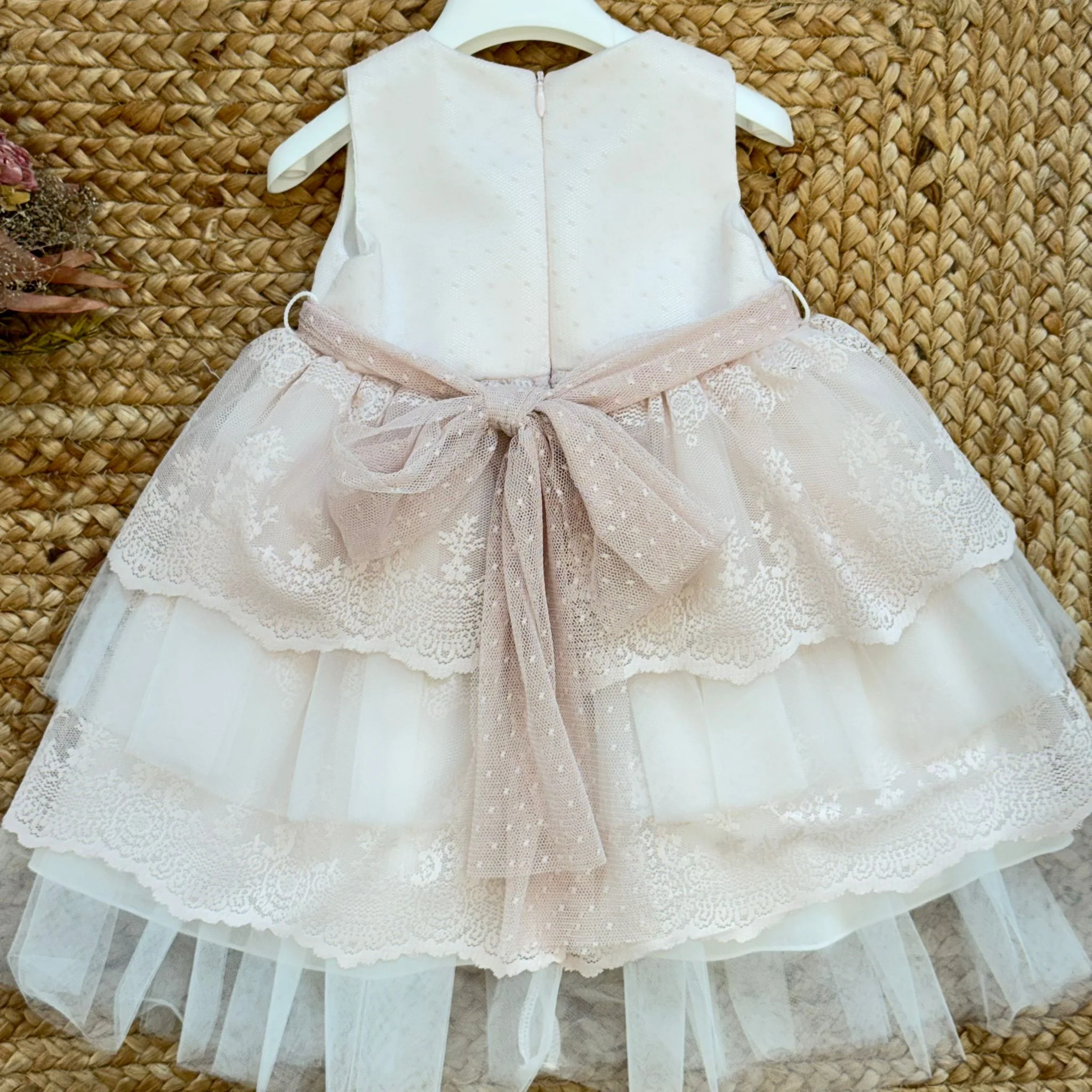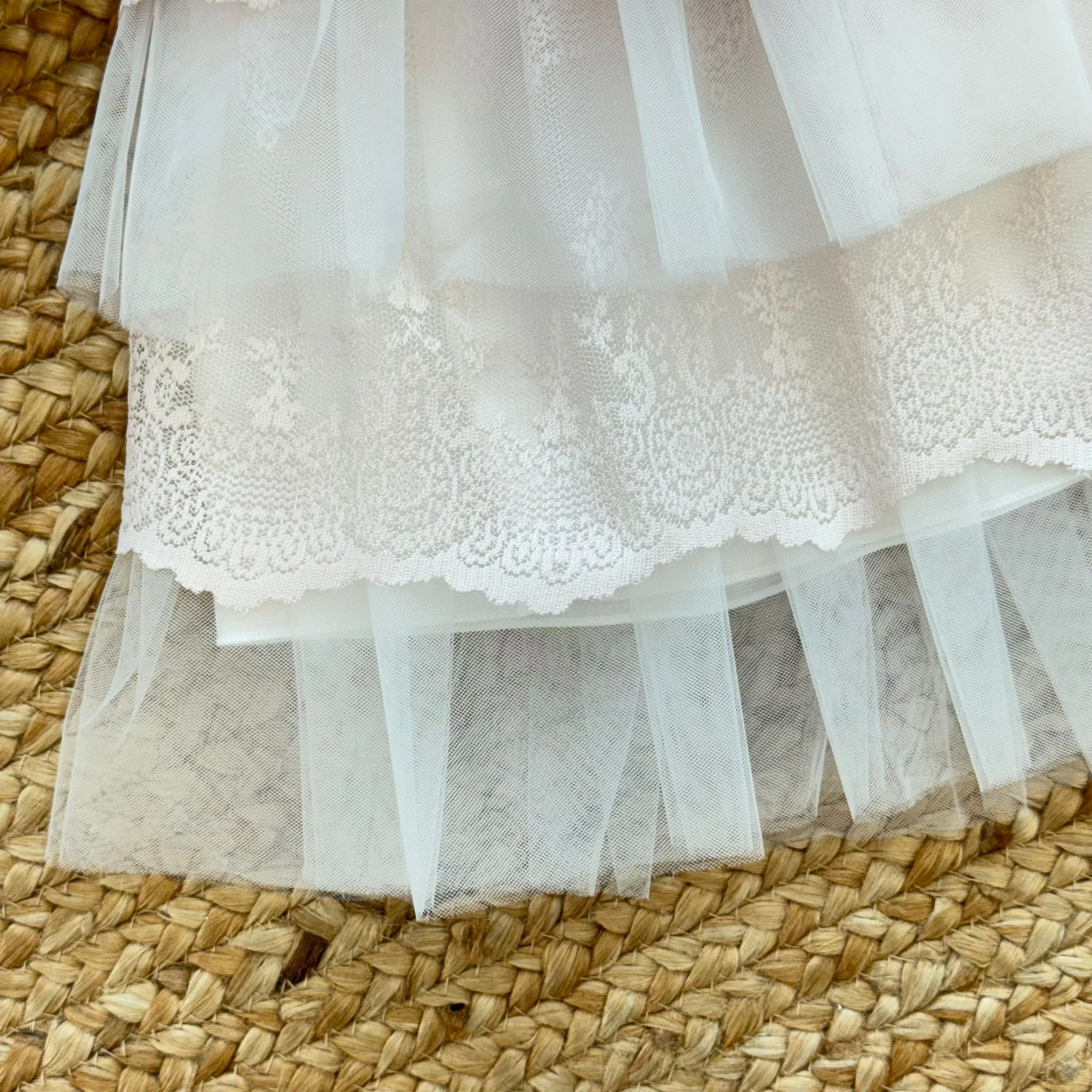 Abito battesimo bimba con pizzo ricamato e gonna a balze in tulle