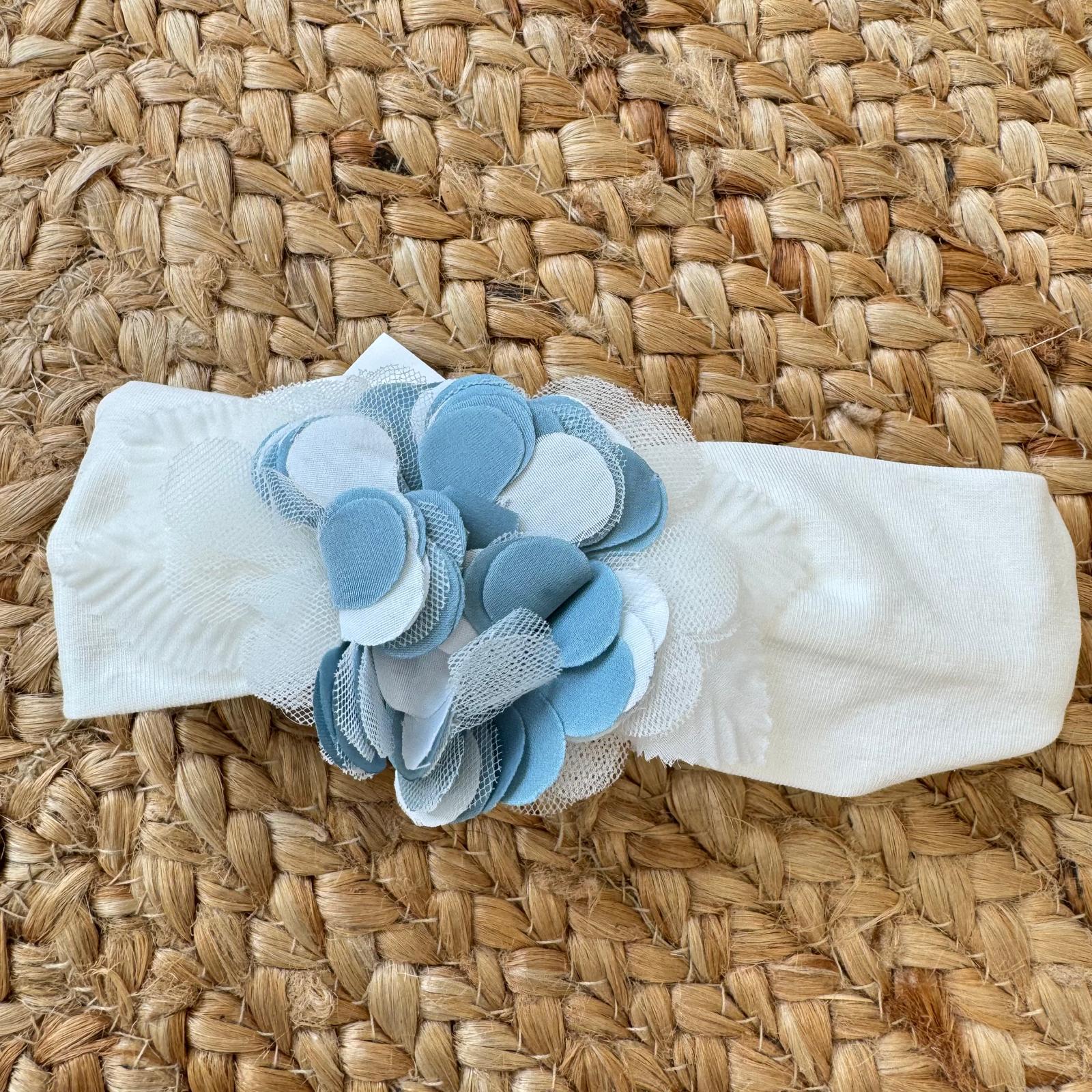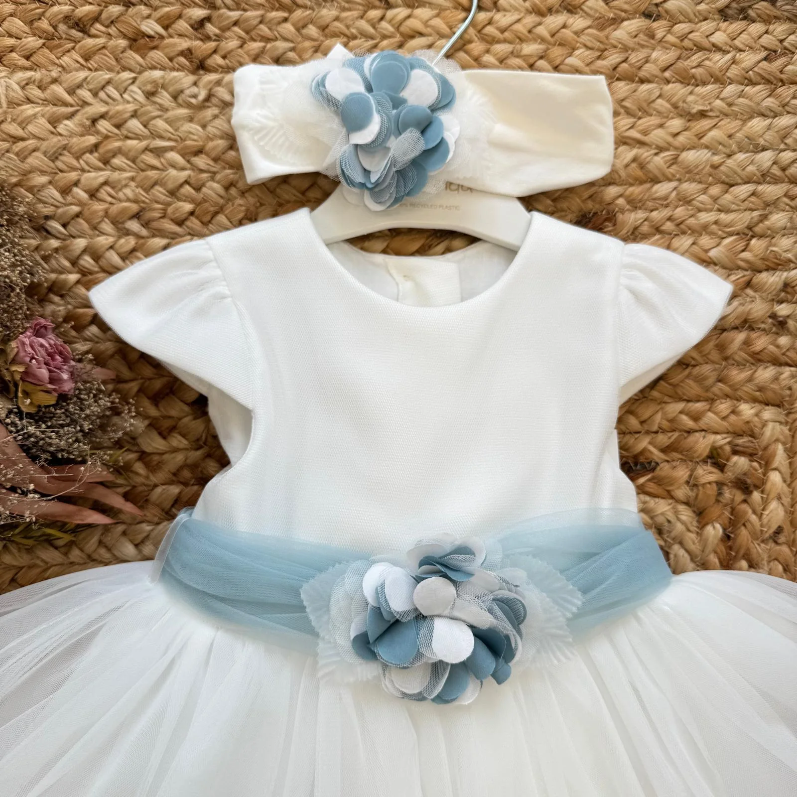 Abito battesimo bimba con tulle e fascia azzurro polvere