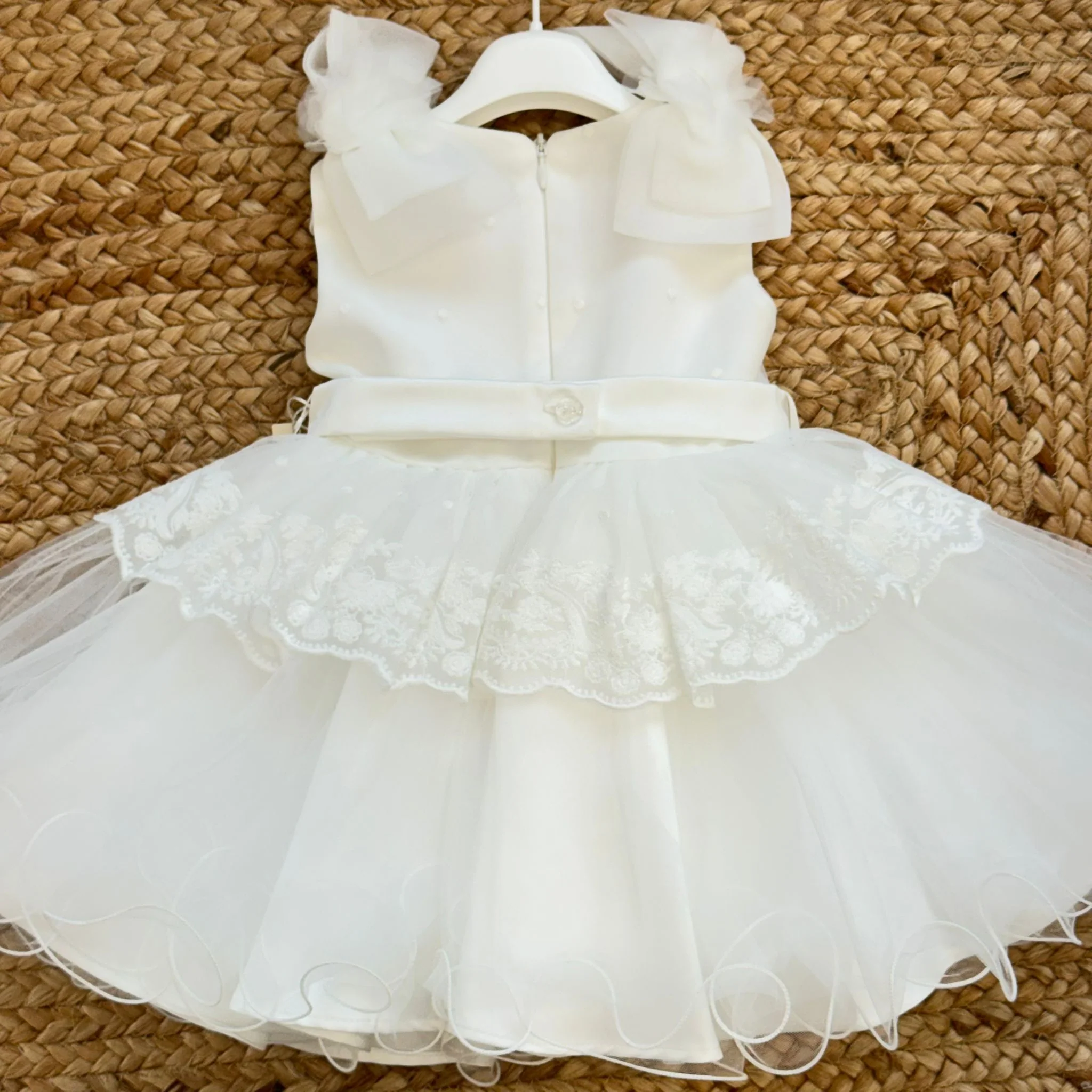Abito battesimo bimba con tulle ricamato e fiocchi sulle spalle