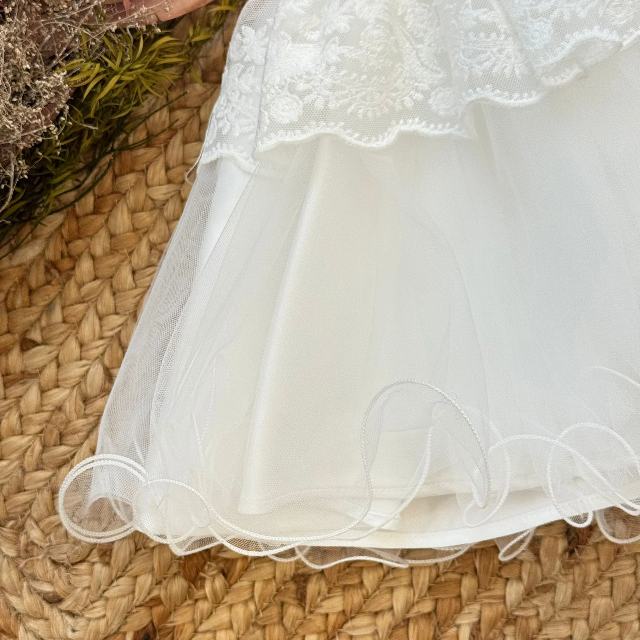 La gonna ampia in tulle leggero è arricchita da un raffinato volant ricamato con motivo floreale che crea movimento e leggerezza. Il bordo della gonna con onde morbide in tulle dona ulteriore volume e rende questo vestito perfetto per fotografie e momenti indimenticabili.