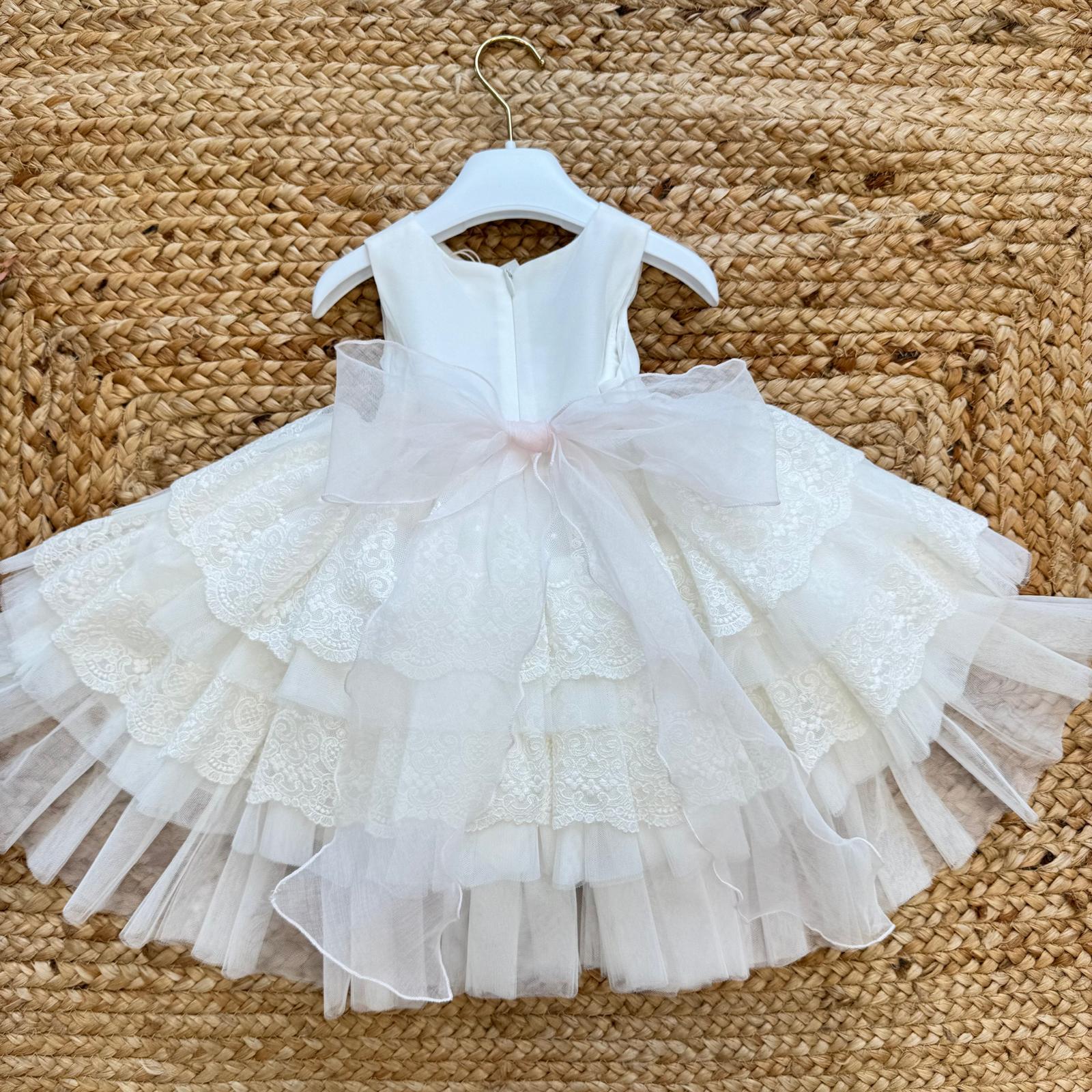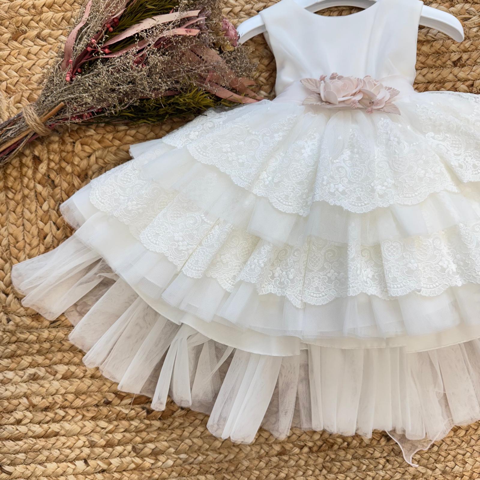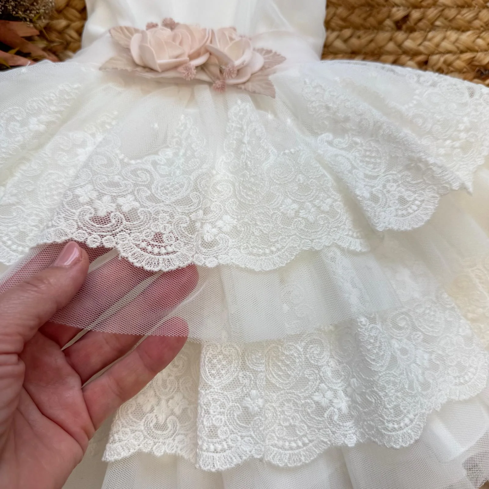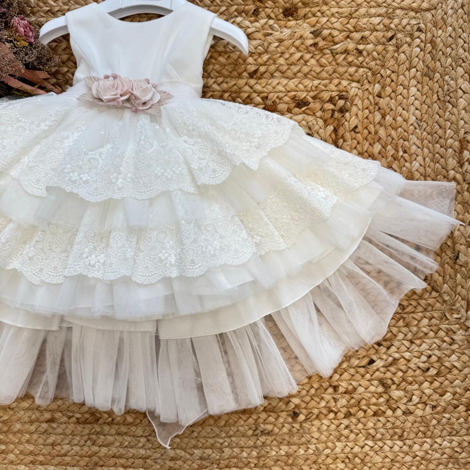 Un abito che sembra uscito da una fiaba. Strati leggeri di tulle, balze in pizzo ricamato e un delicato bouquet di rose cipria in vita rendono questo vestito da Battesimo un piccolo capolavoro di eleganza. Pensato per illuminare la tua bimba nel giorno più emozionante e per farla sentire speciale anche al suo primo compleanno.