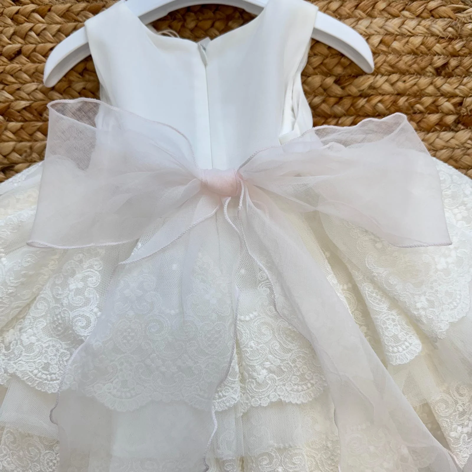 Abito battesimo bimba con pizzo ricamato e fiocco