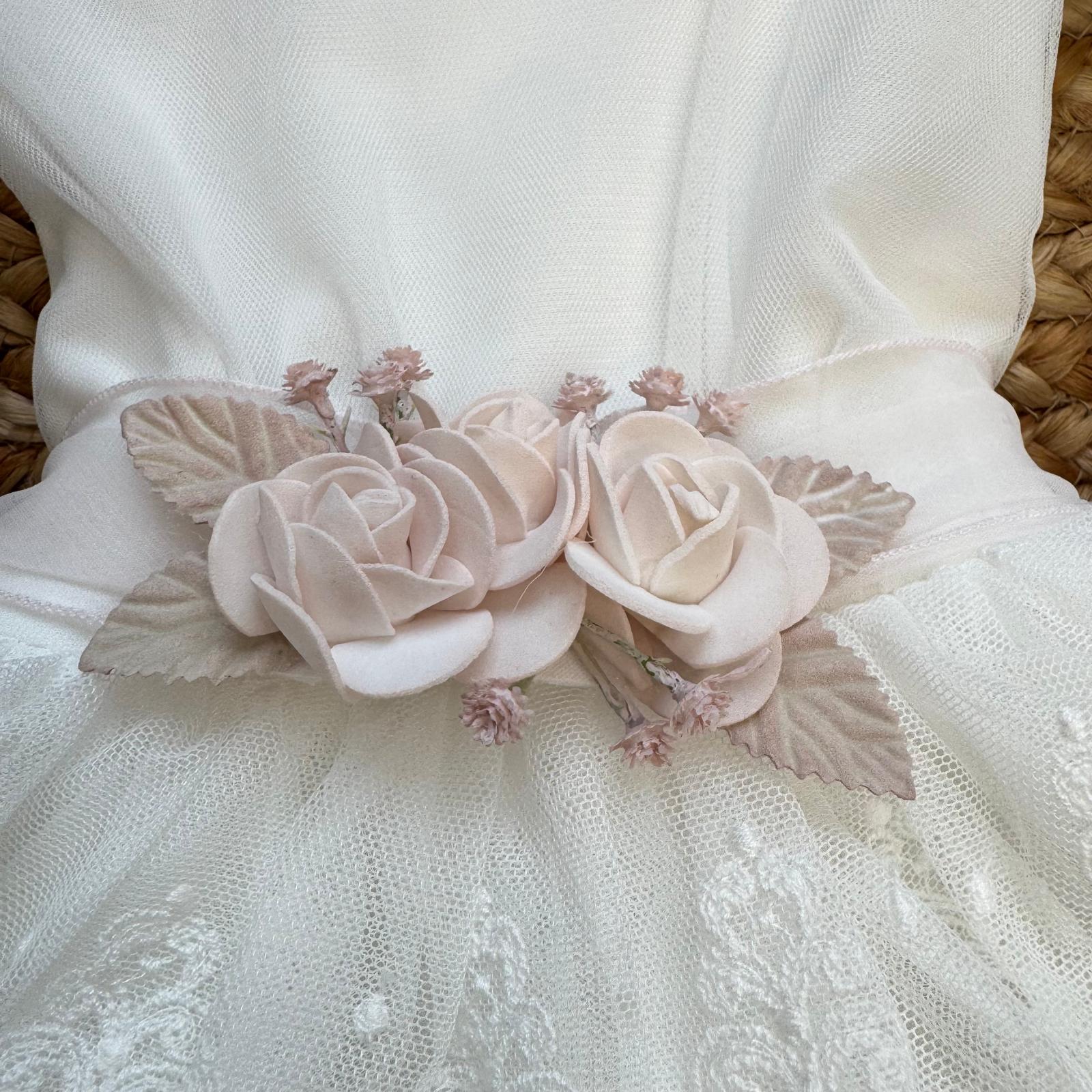 Abito battesimo bimba con ricamo floreale e cintura rosa cipria