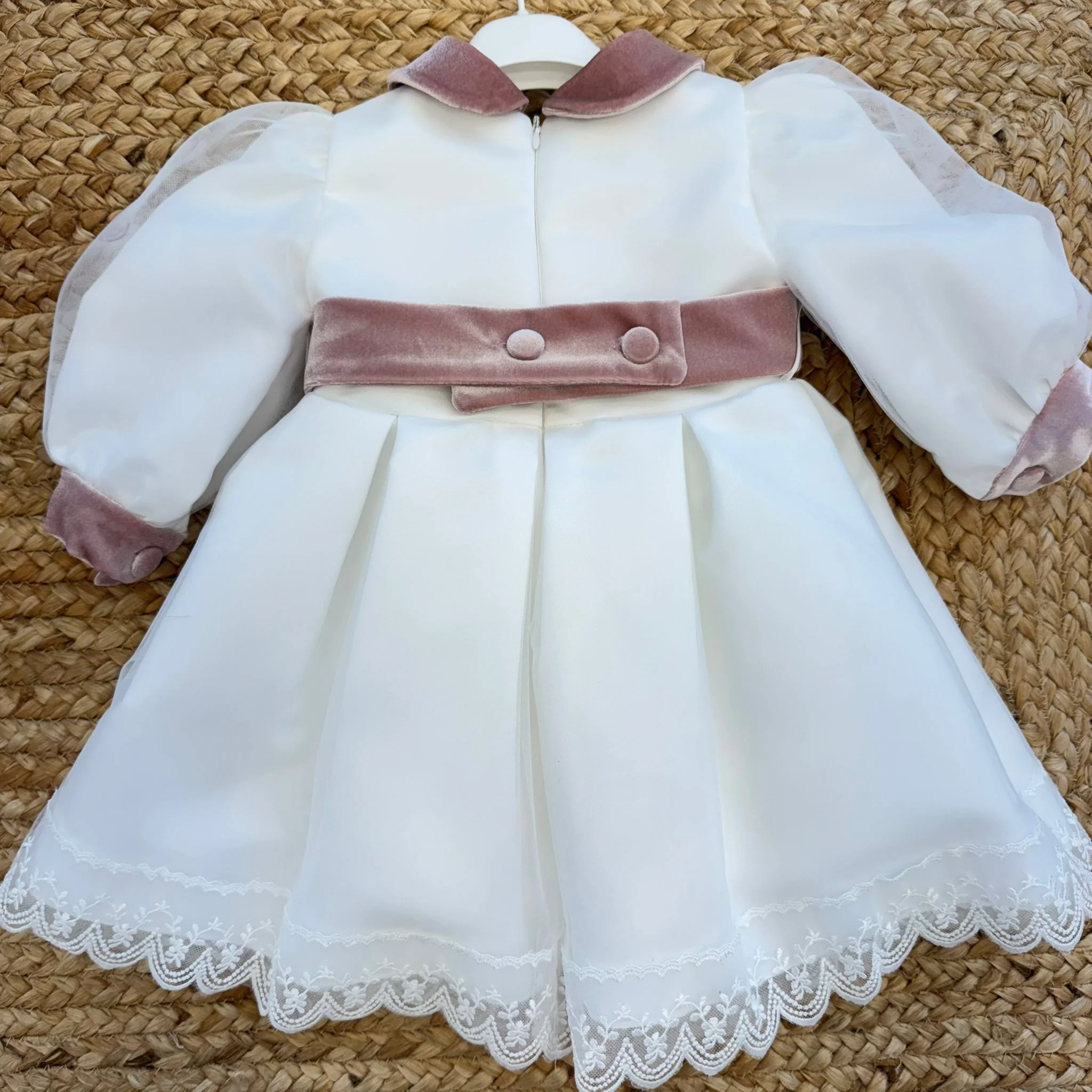 Elegante abito battesimo per bimba autunno/inverno, realizzato in raso con dettagli in velluto rosa antico su colletto, cintura e polsini. Il punto vita è arricchito da applicazione floreale tono su tono, mentre l’orlo è rifinito con delicato pizzo ricamato. Le maniche lunghe lo rendono ideale per la stagione fredda. Un capo raffinato e prezioso per un giorno indimenticabile.