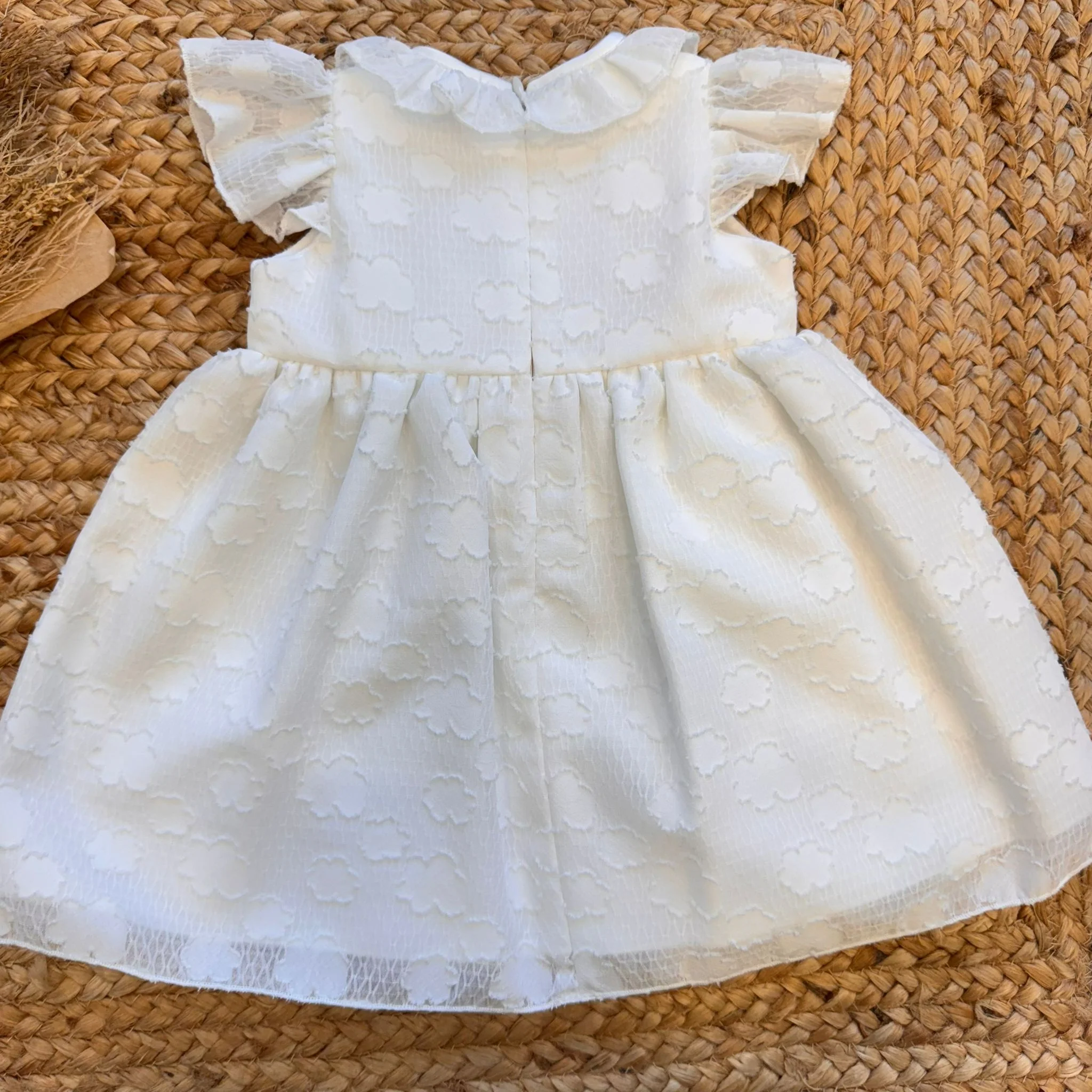 Un abito da battesimo dolce e raffinato per vestire la tua bambina con eleganza. Realizzato in leggero cotone con motivo a rilievo, ha un delizioso colletto tondo e maniche arricciate in tulle, che donano volume e leggerezza. Sul punto vita, tre fiori applicati in organza tono su tono aggiungono un tocco poetico. Il design senza tempo e la cura nei dettagli lo rendono perfetto per una cerimonia che parla di amore e semplicità.
