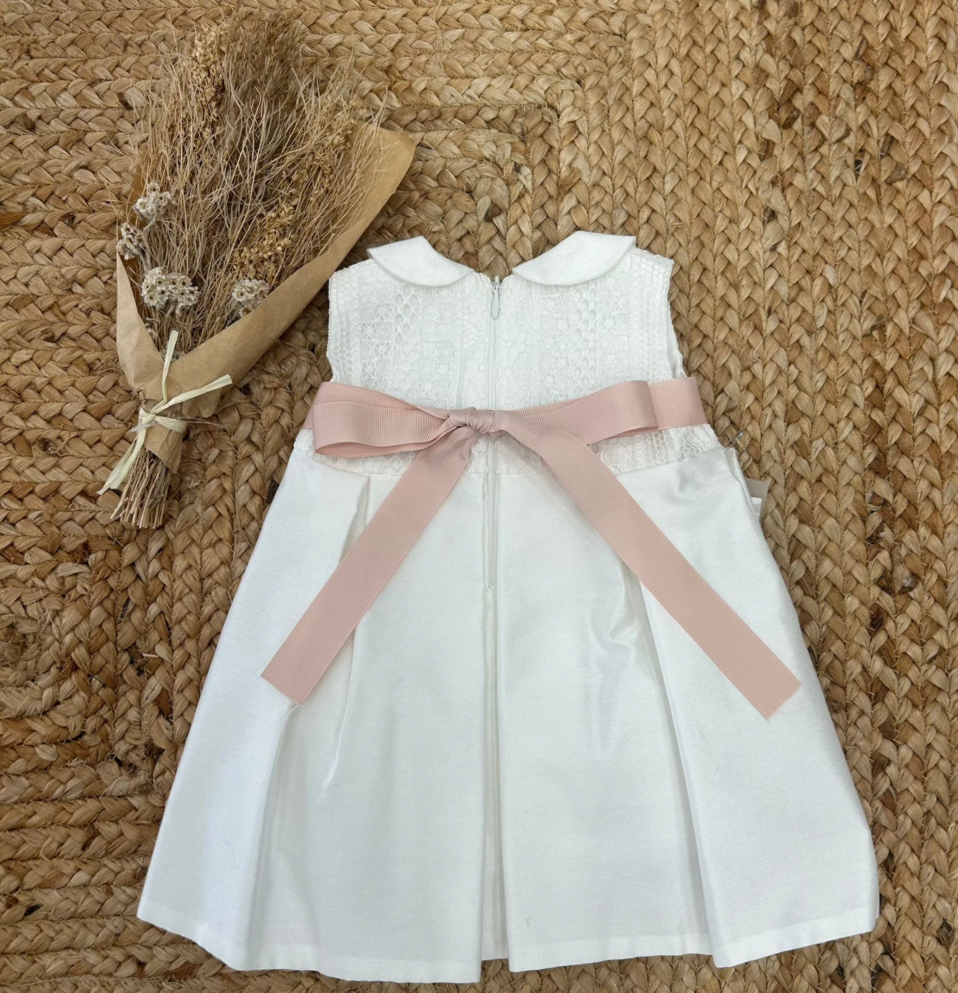 Abito da battesimo in tessuto lucido avorio, con corpino in pizzo, colletto tondo in raso e cinturina in gros grain rosa decorata da tre rose cipria. Gonna ampia con pieghe e chiusura posteriore con fiocco e zip. Raffinato e romantico, perfetto per battesimi, prime cerimonie e foto indimenticabili.