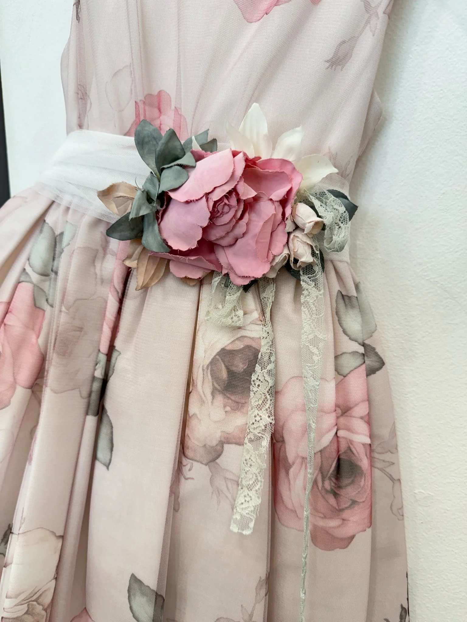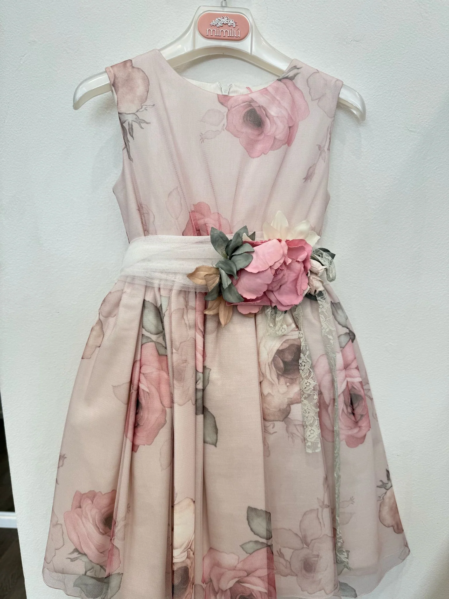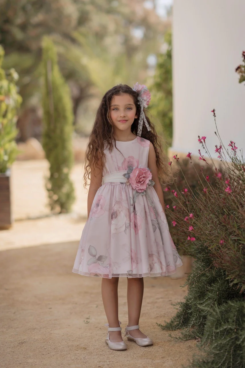 Raffinato abito da cerimonia per bambina, realizzato in delicato tulle stampato con motivi floreali nei toni pastello, perfetto per matrimoni, battesimi e altre occasioni eleganti. La gonna svasata in tulle conferisce volume e leggerezza, mentre il corpetto senza maniche presenta un design pulito ed essenziale che esalta la linea del vestito. La vita è arricchita da una cintura decorata con un’applicazione floreale tridimensionale, che aggiunge un tocco romantico e sofisticato. Un abito pensato per far sentire ogni bambina speciale, unendo stile e comfort.