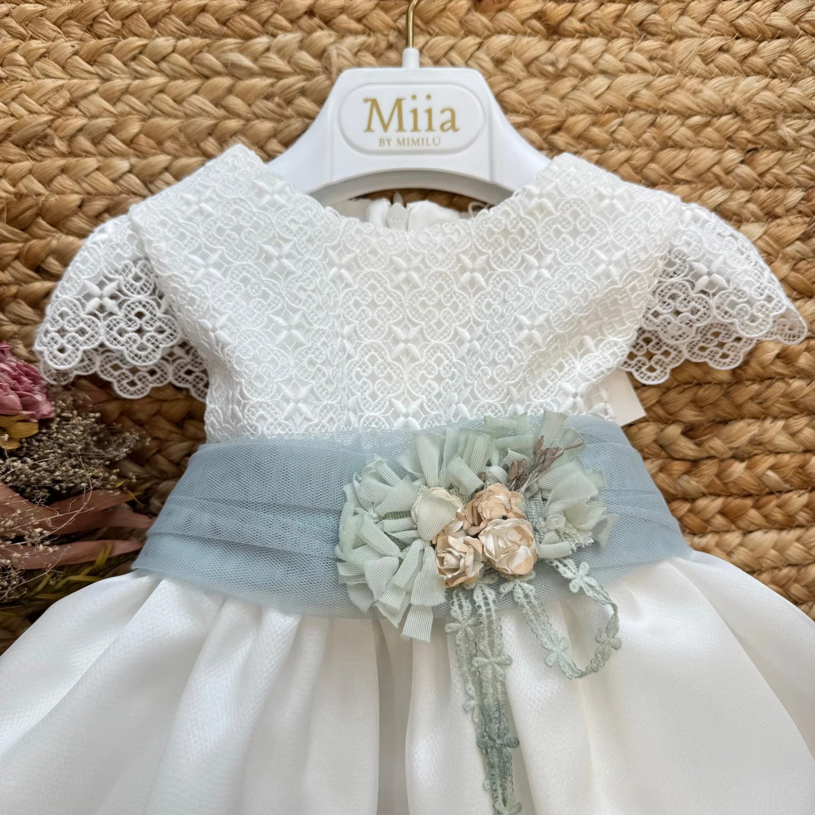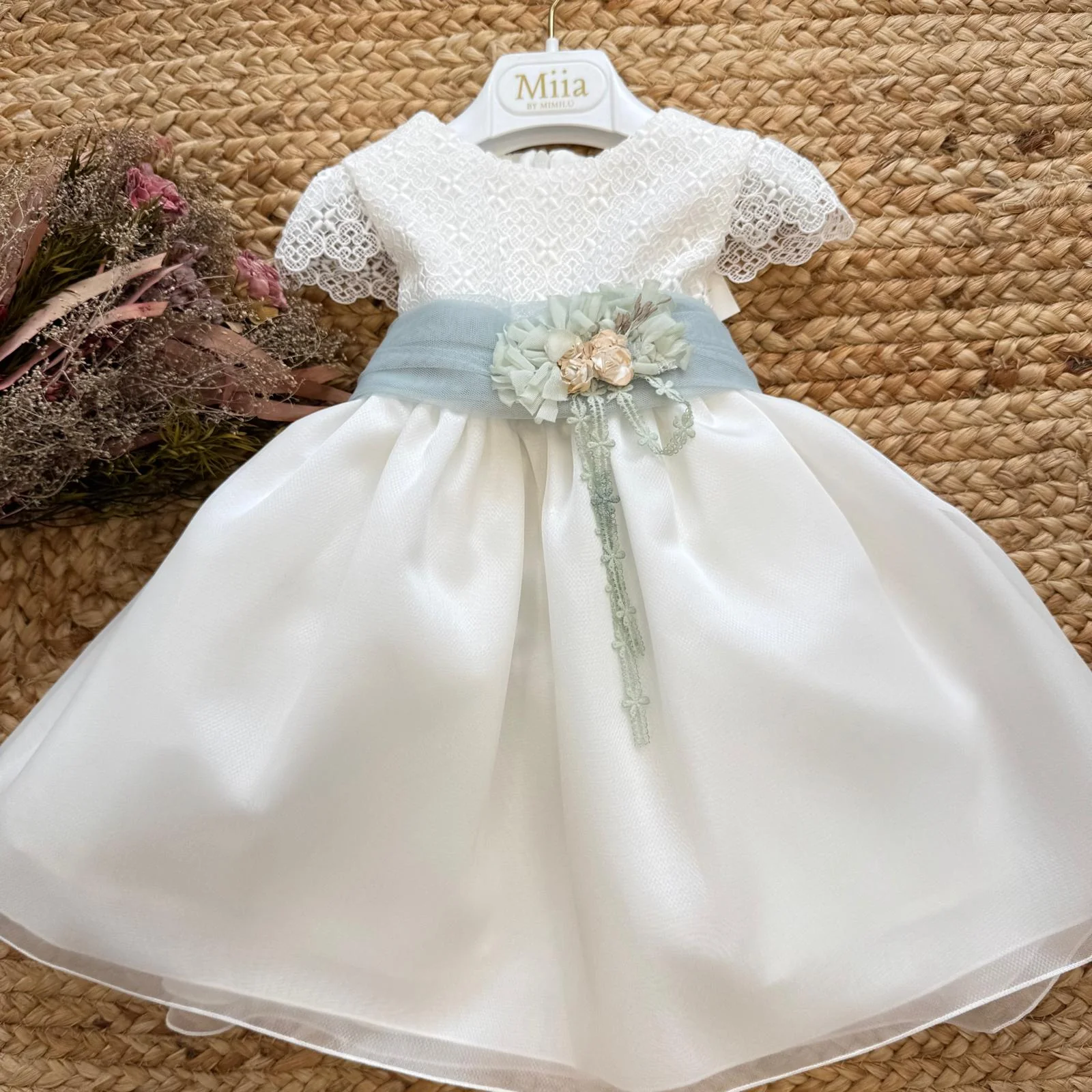Il corpino è interamente lavorato in pizzo ricamato tono su tono, con maniche corte in pizzo traforato. La cintura in tulle verde salvia, arricchita da fiori tridimensionali e piccoli dettagli decorativi, definisce il punto vita con grazia. Sul retro, un maxi fiocco in tulle crea un effetto scenografico armonioso.