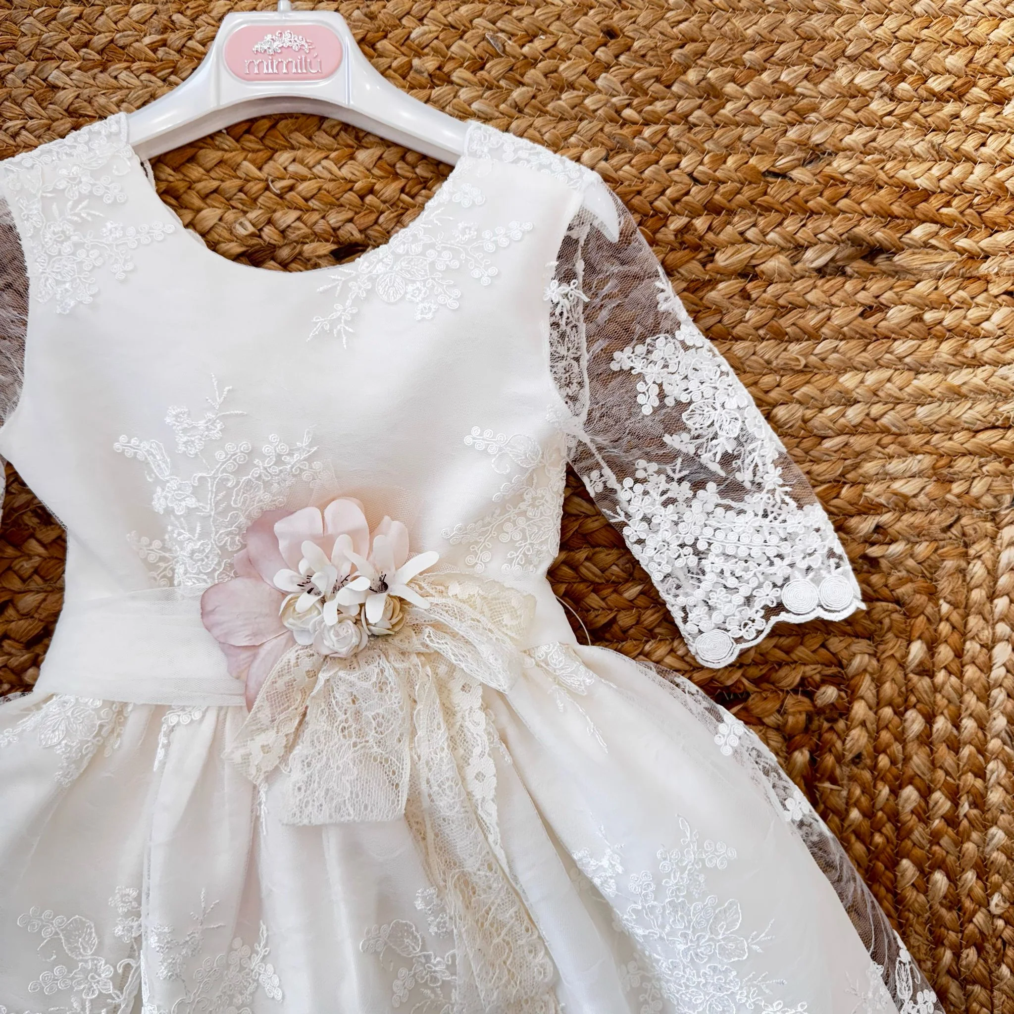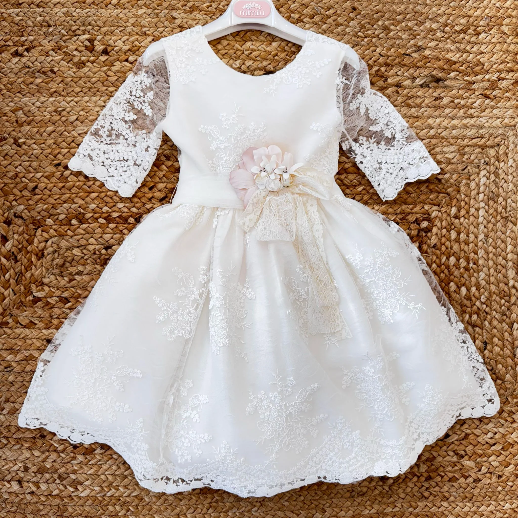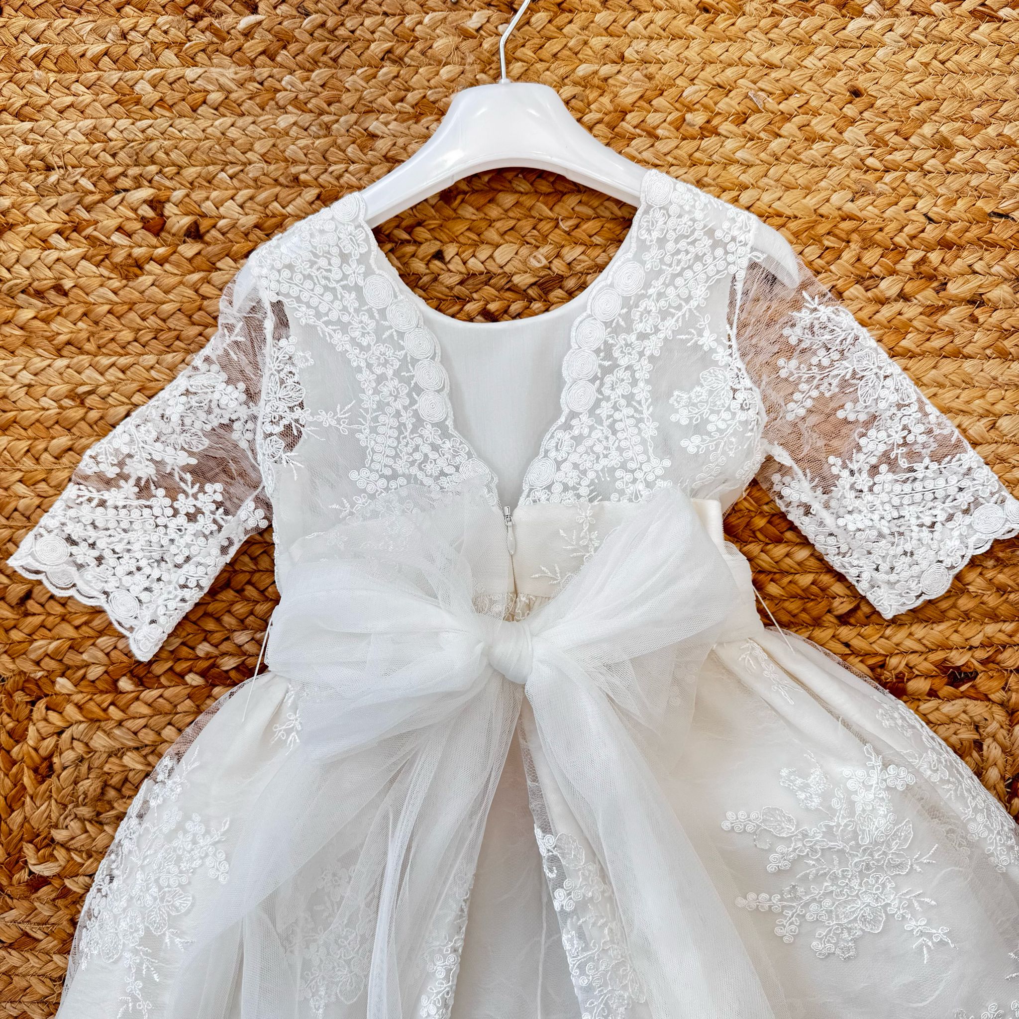 Un abito da cerimonia da vera principessa, perfetto per occasioni speciali come matrimoni, comunioni e battesimi. Il design raffinato con pizzo ricamato e dettagli floreali dona un’eleganza senza tempo.