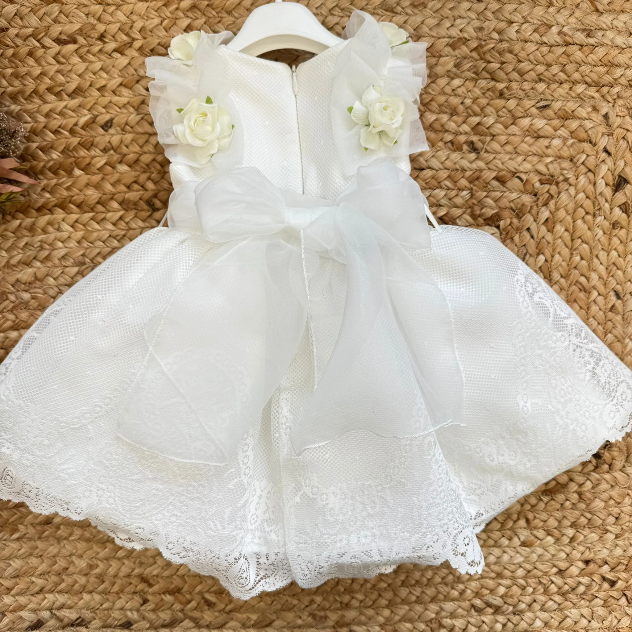 La vita è definita da una fascia morbida in organza, leggera e ariosa, che dona armonia all’insieme. La gonna ampia è realizzata in tessuto lavorato con sovrapposizione di pizzo ricamato sul fondo, creando un effetto ricco e raffinato perfetto per le fotografie del Battesimo.