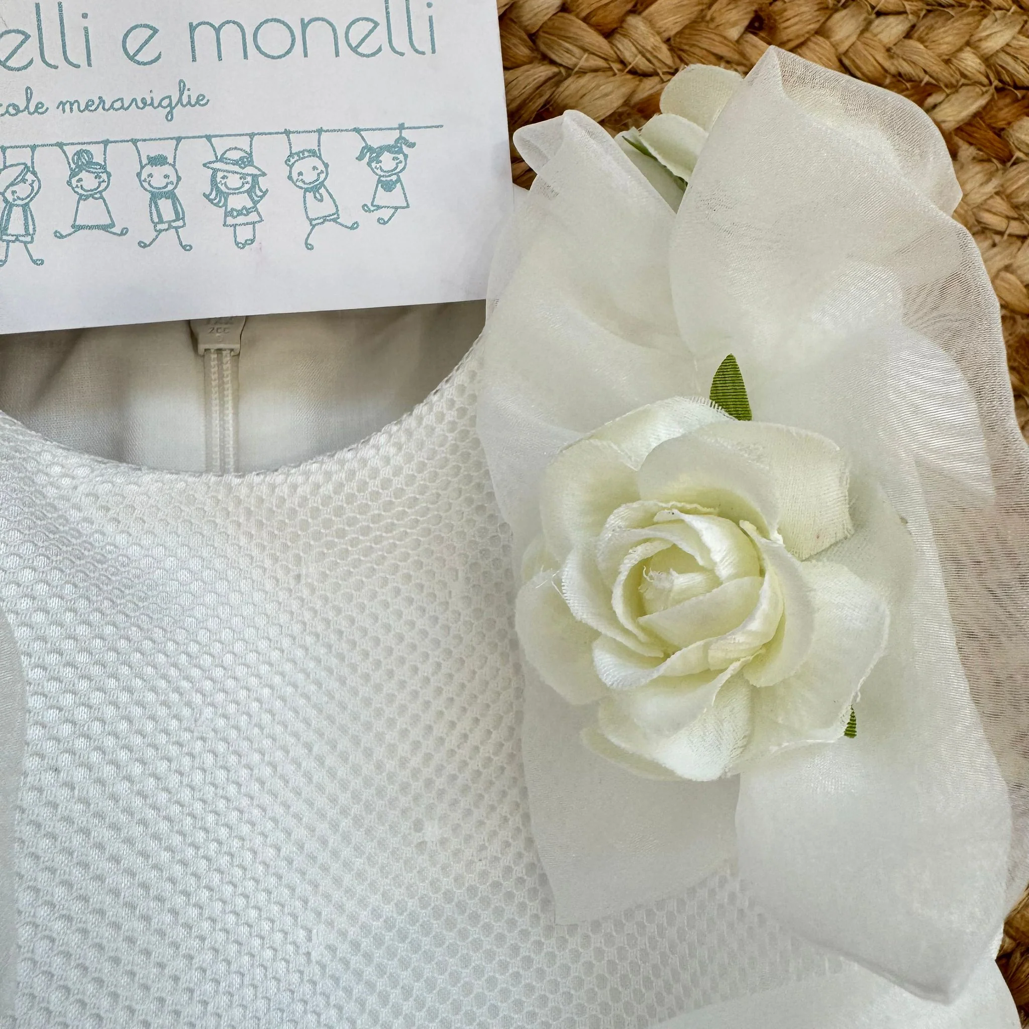 Il corpino strutturato in tessuto lavorato tono su tono dona eleganza e sostegno alla linea, valorizzando la silhouette con sobrietà. Sulle spalle, romantiche balze in organza incorniciano il volto della bambina, impreziosite da applicazioni di rose avorio tridimensionali che aggiungono volume e dolcezza.