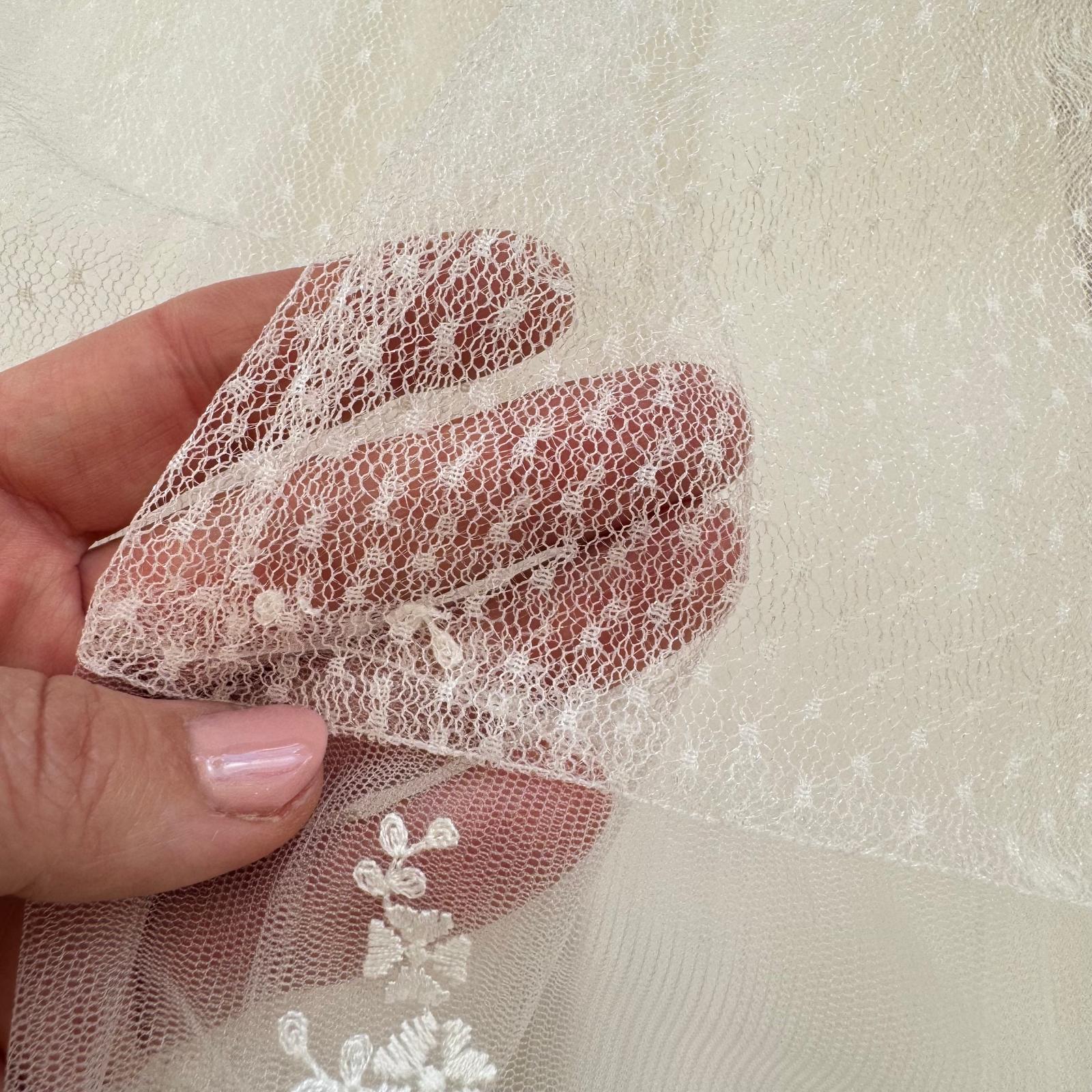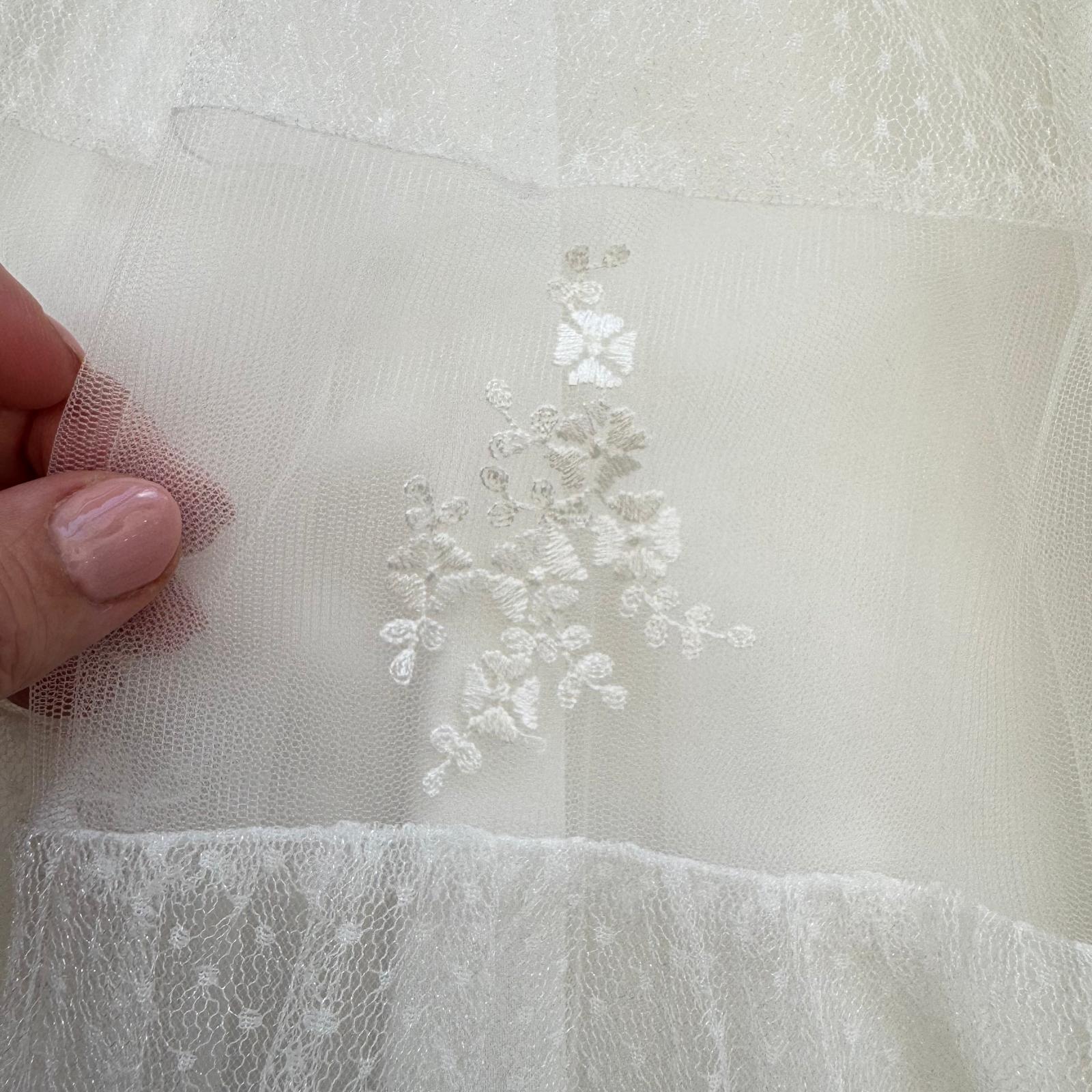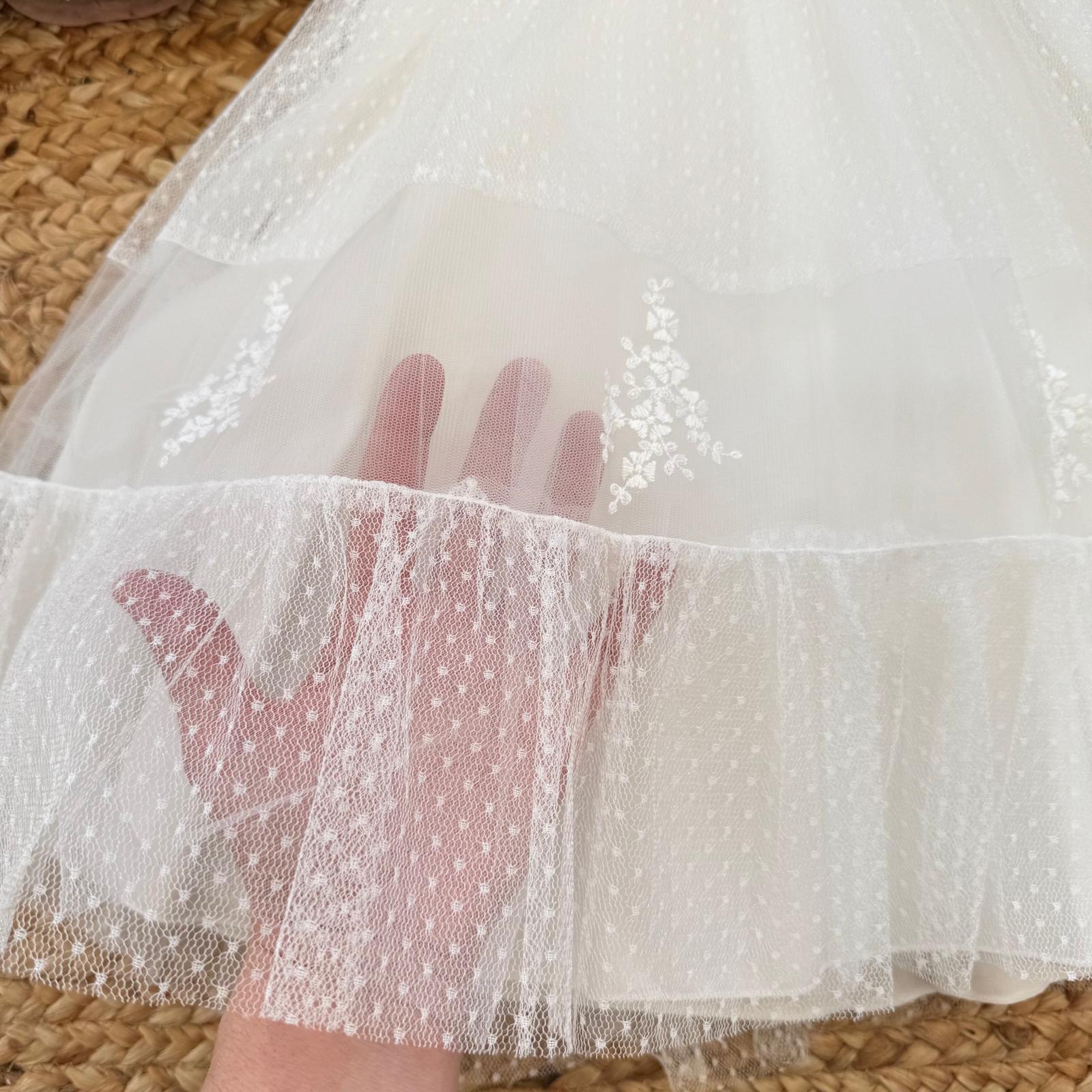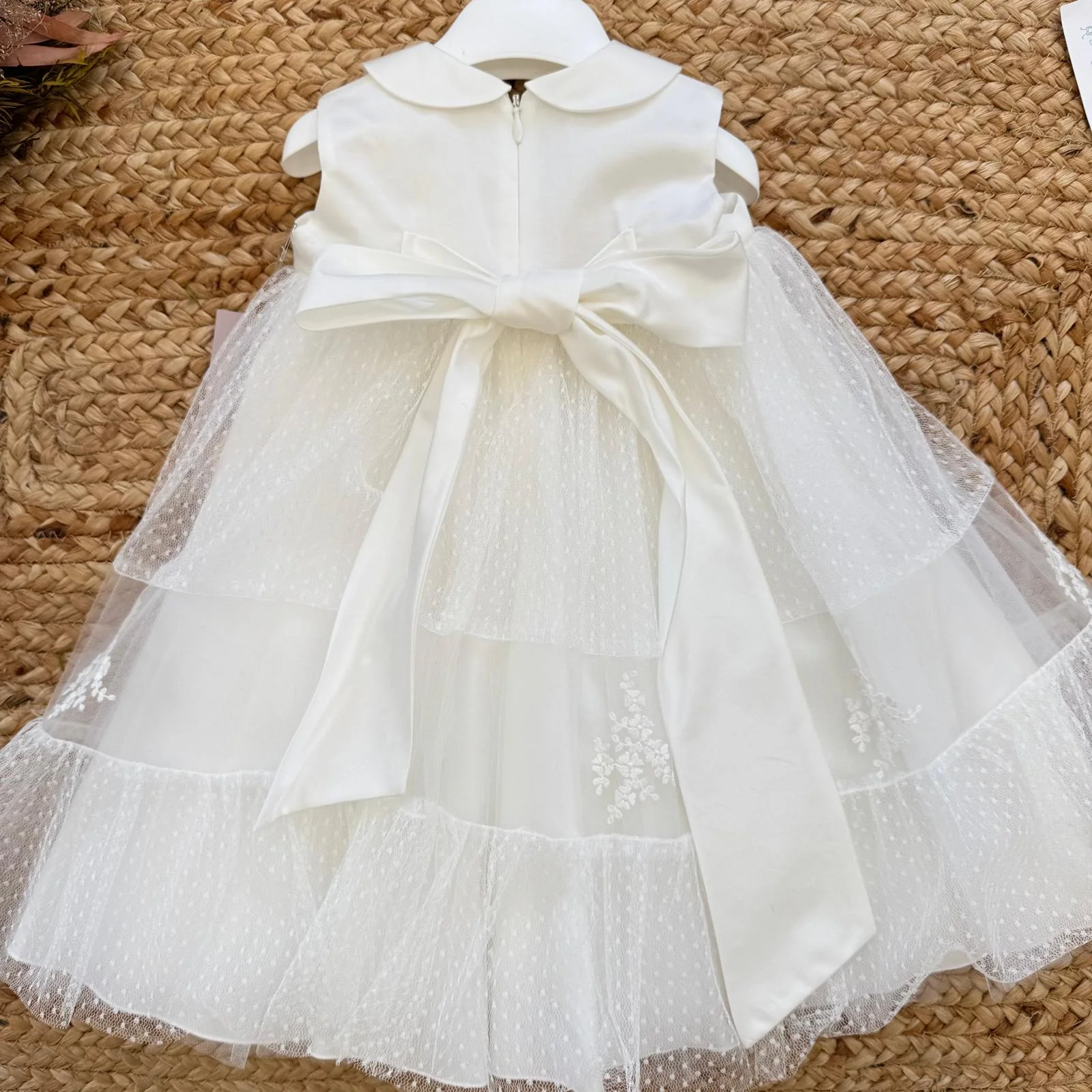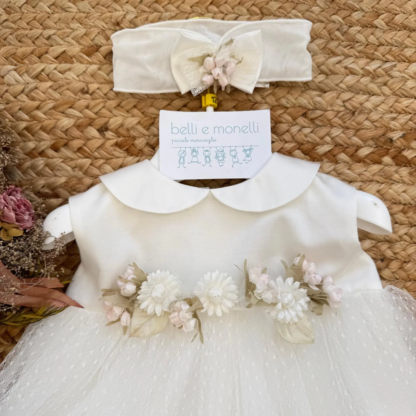 Un abito da battesimo da bimbina che racchiude purezza, dolcezza e raffinatezza sartoriale in ogni dettaglio. Il delicato colore avorio illumina la silhouette, mentre il tulle ricamato e i piccoli fiori applicati in vita creano un effetto etereo, leggero e prezioso.
