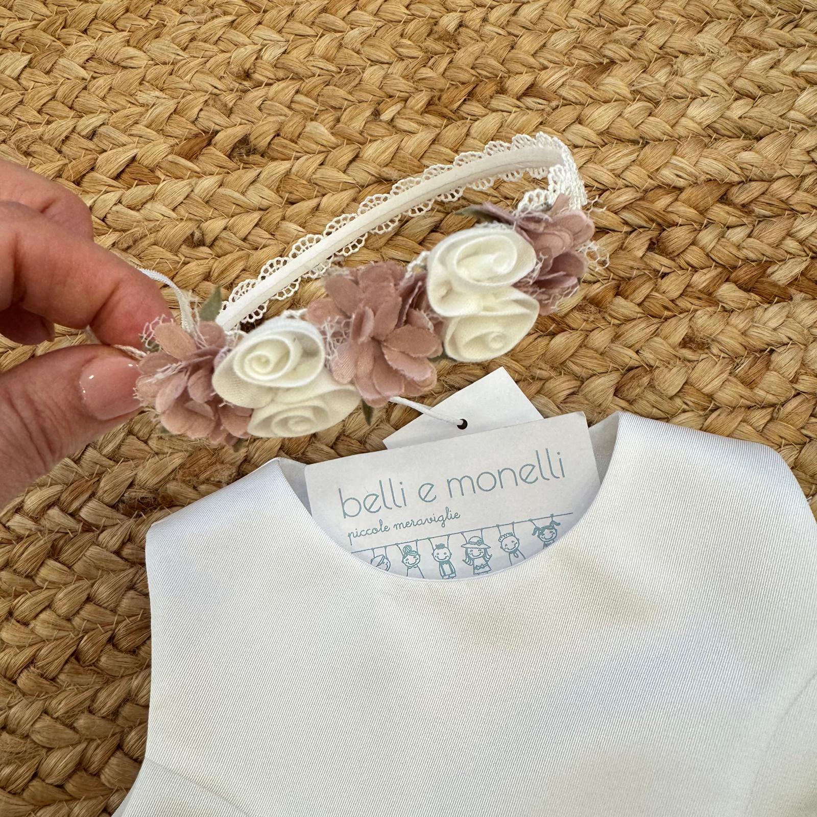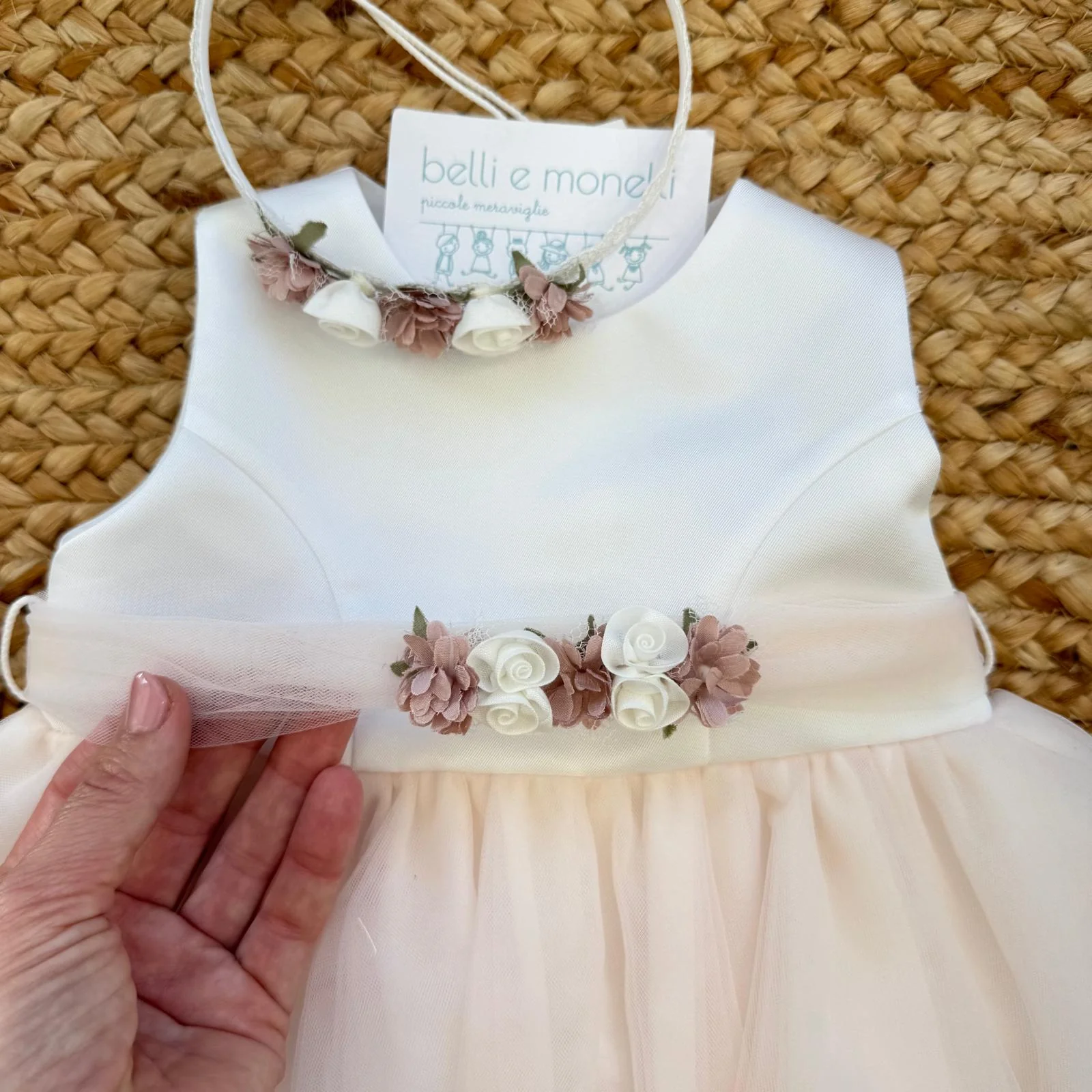 Il contrasto armonioso tra il bianco avorio del corpino e la morbida gonna in tulle color cipria crea un effetto romantico e luminoso, perfetto per una cerimonia importante come il Santo Battesimo.