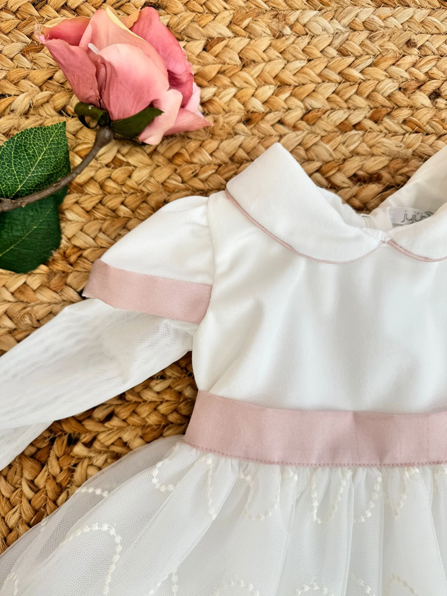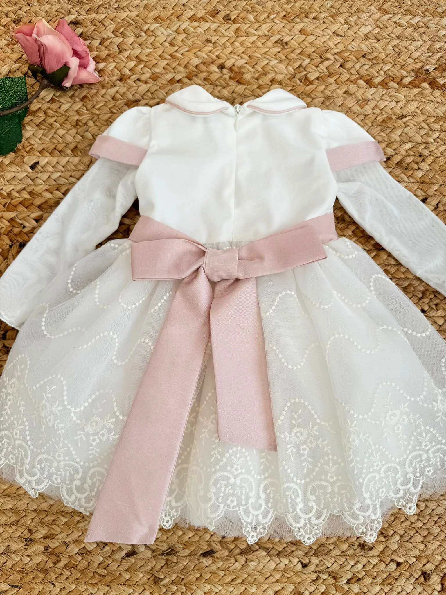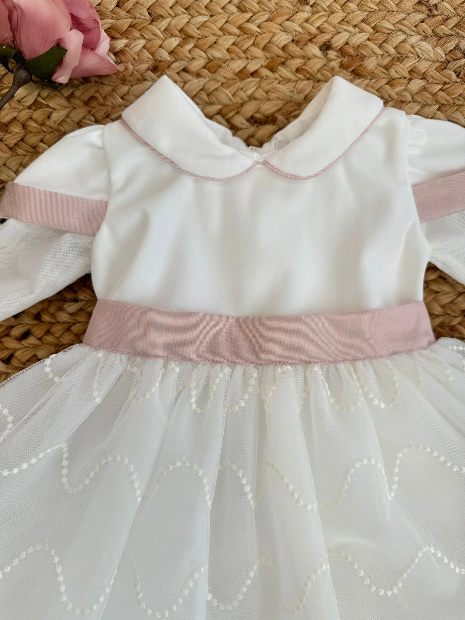 L’abito da battesimo in tulle con colletto è un vero sogno di eleganza, ideale per una bimba. La leggerezza del tulle avvolge delicatamente il piccolo, mentre il colletto aggiunge un tocco di raffinatezza. Ogni dettaglio è pensato per rendere il battesimo un momento indimenticabile, ricco di amore e gioia.
