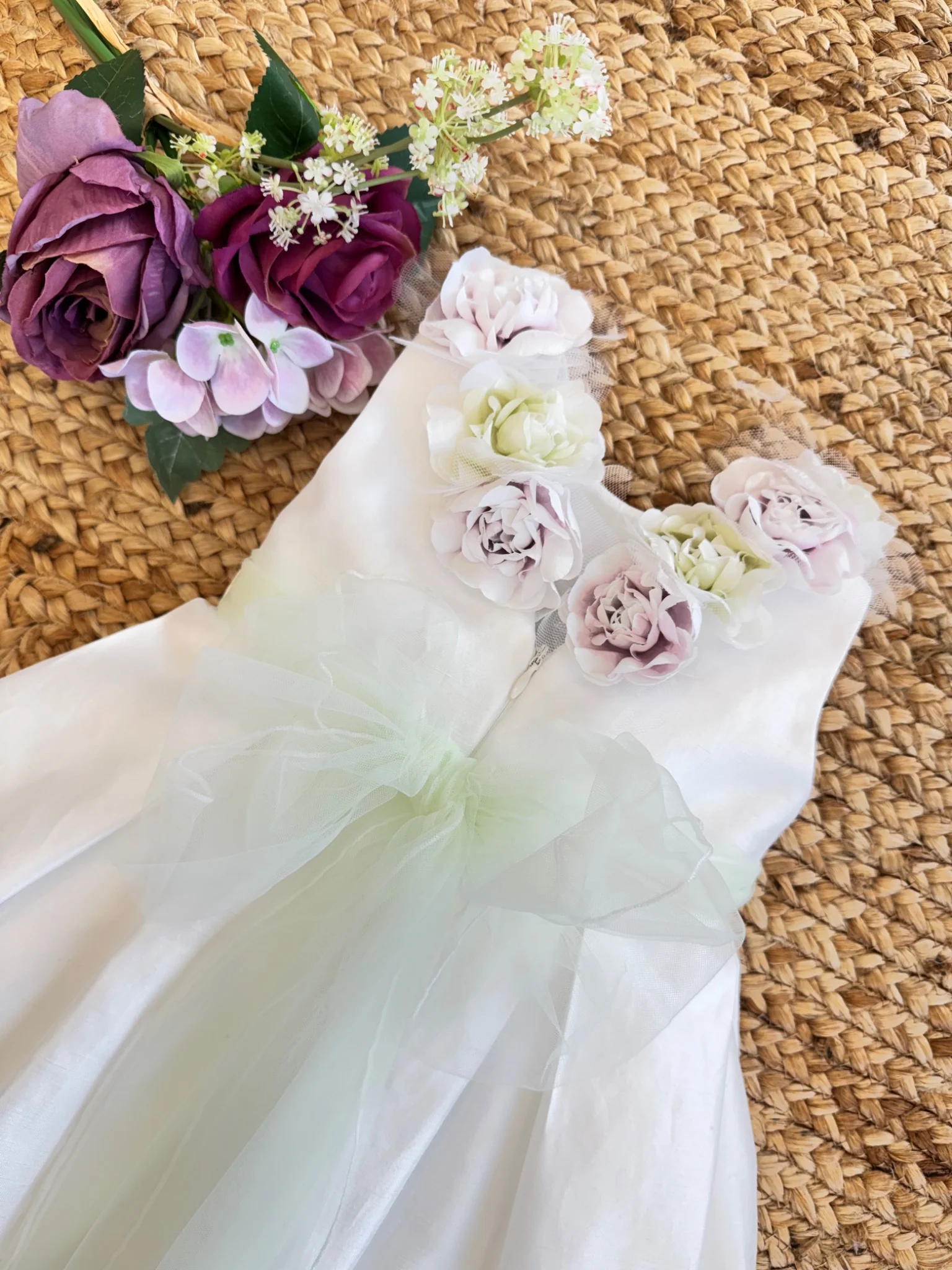 Raffinato abito da Battesimo per bambina, perfetto per una cerimonia elegante. Il modello è realizzato con un corpetto strutturato impreziosito da delicati fiori in tessuto applicati sulle spalle e lungo lo scollo, creando un effetto romantico e sofisticato. La cintura in tulle verde pastello, annodata sul retro con un fiocco vaporoso, aggiunge un tocco di colore raffinato.
