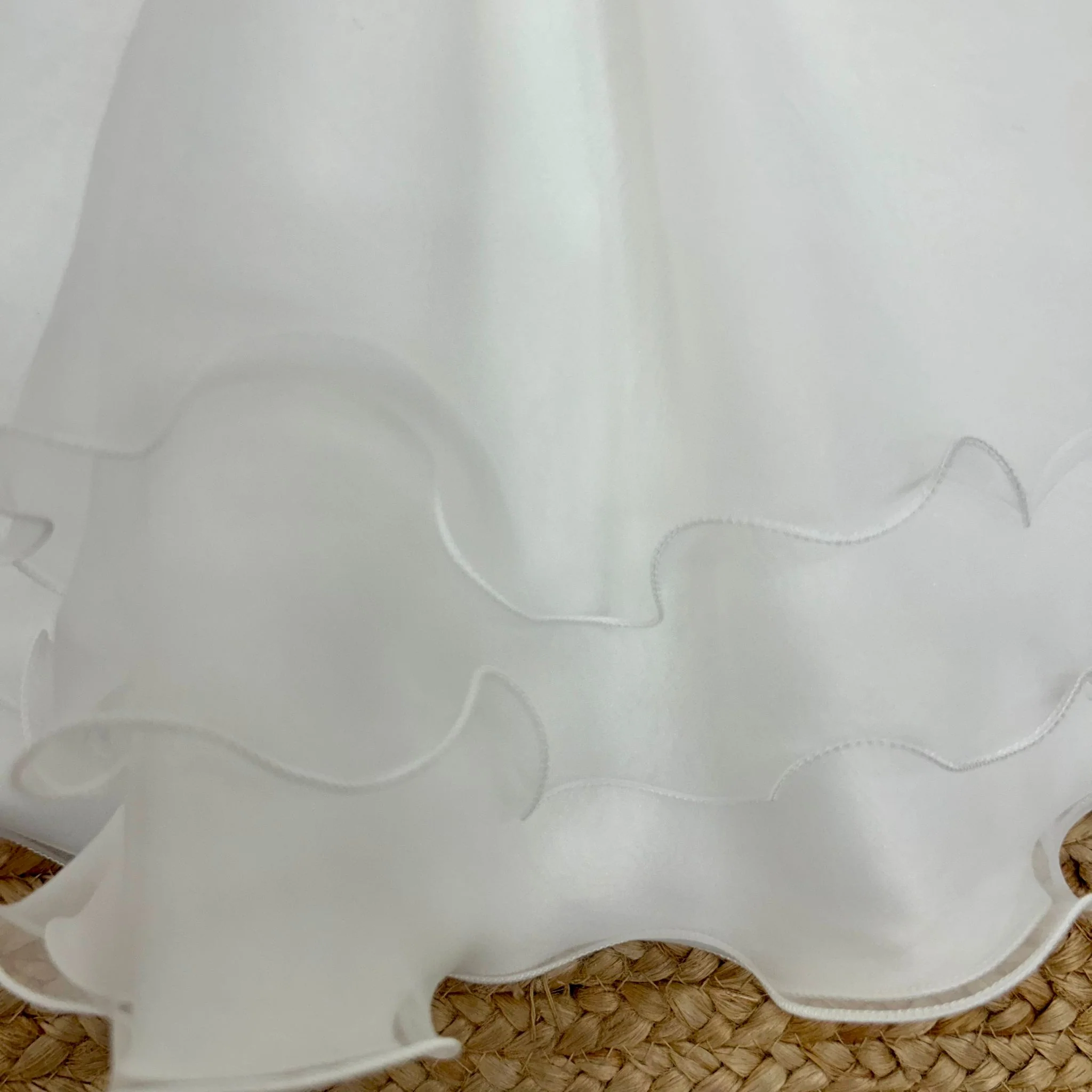 Abito bimba in tessuto panna con maniche a sbuffo e colletto tondo. La gonna ha un doppio strato ondulato che dona movimento, completata da una cintura in raso con fiori tono su tono. Un modello raffinato, ideale per il battesimo o cerimonie speciali.