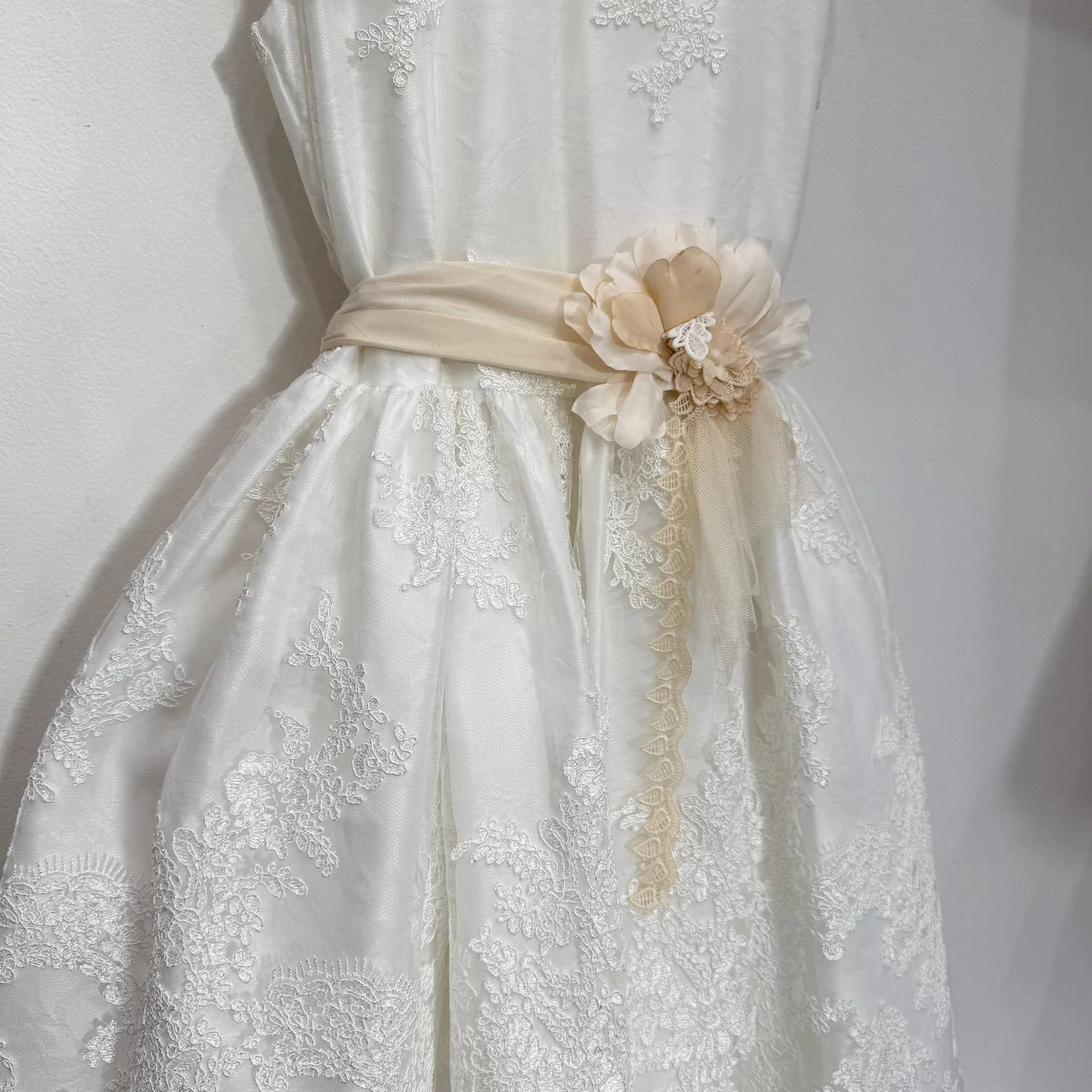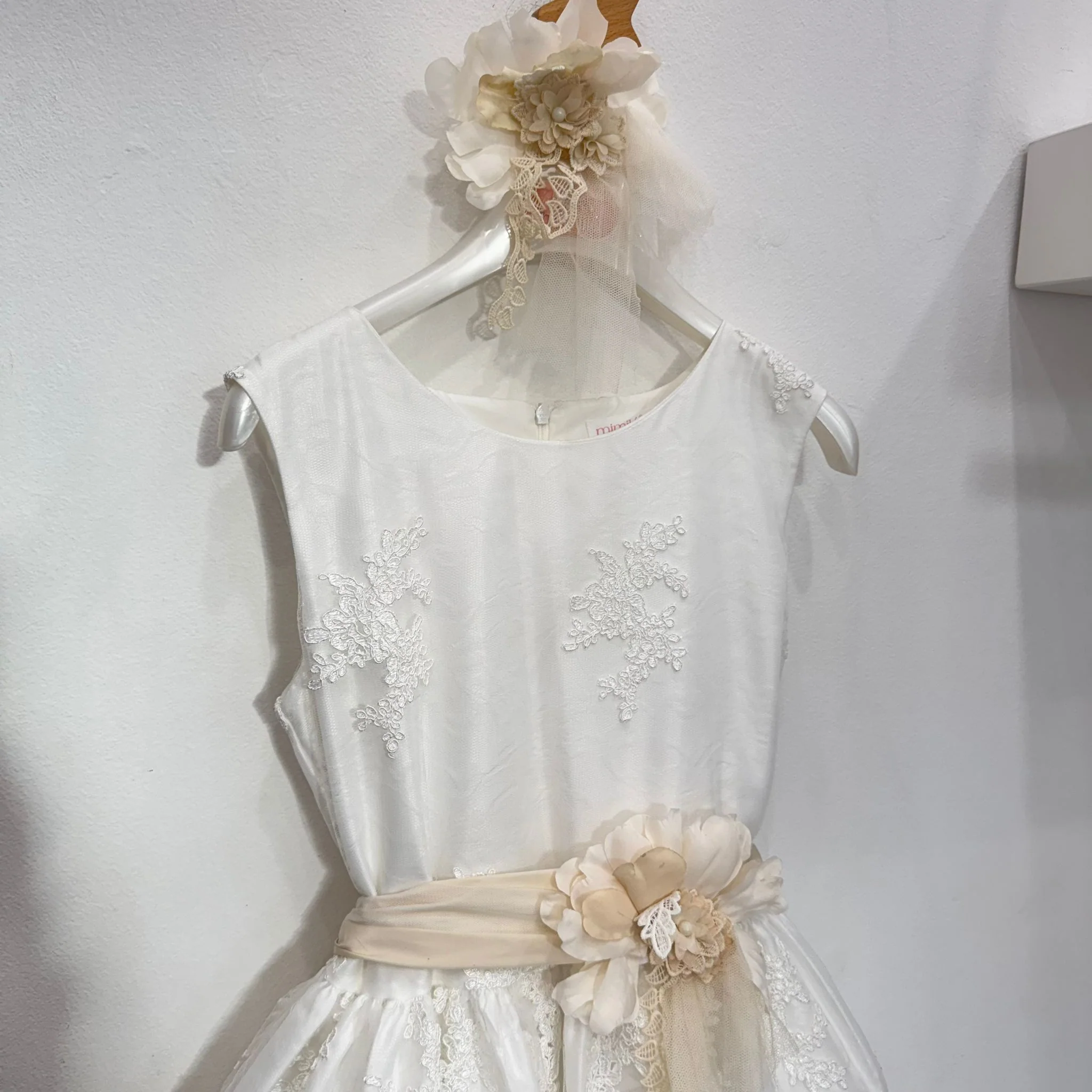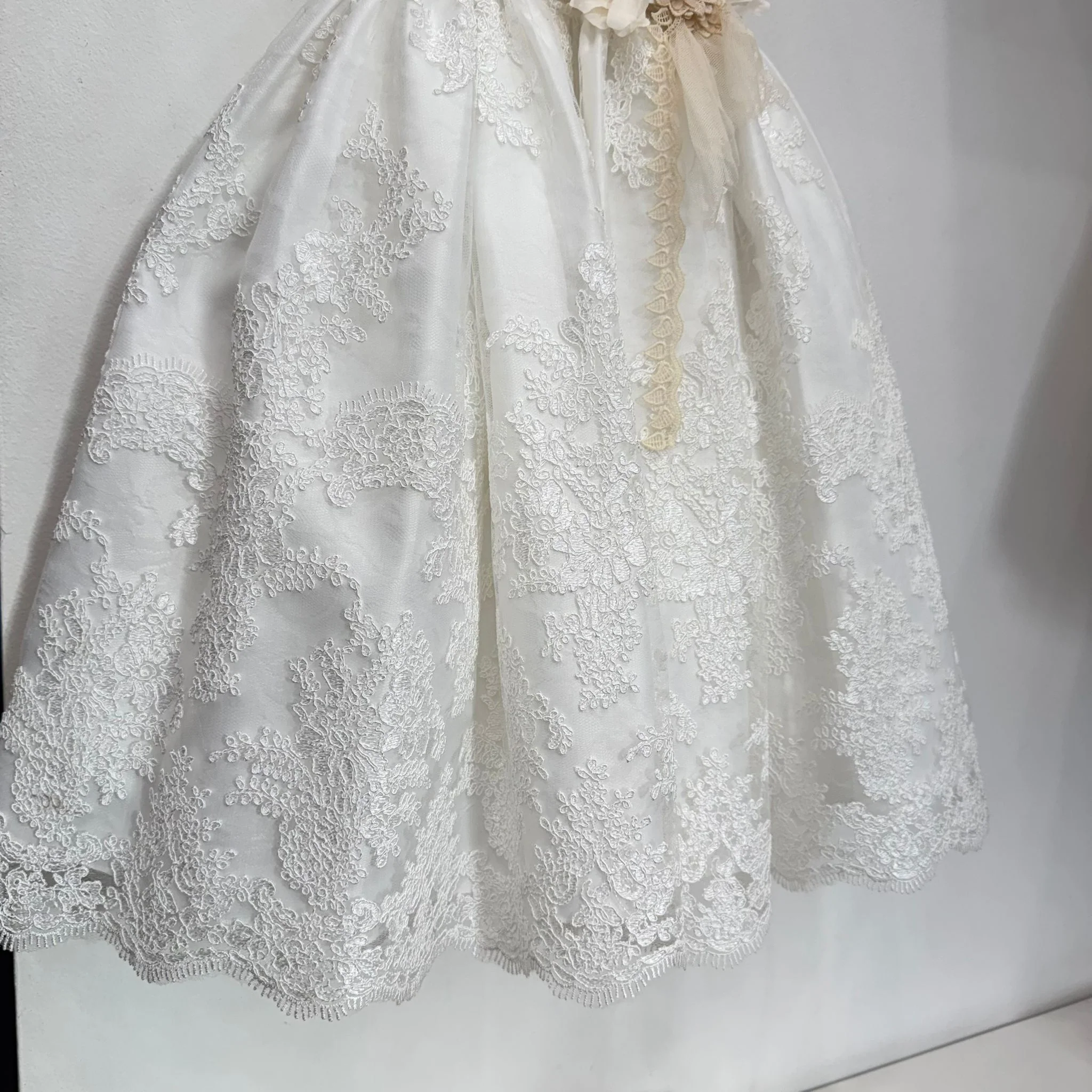 Ci sono abiti che accompagnano momenti destinati a restare nella memoria, scelti per la loro purezza e per l’eleganza senza tempo. Questo abito in pizzo Mimilú è pensato per la Prima Comunione, quando semplicità e raffinatezza devono convivere in perfetto equilibrio.