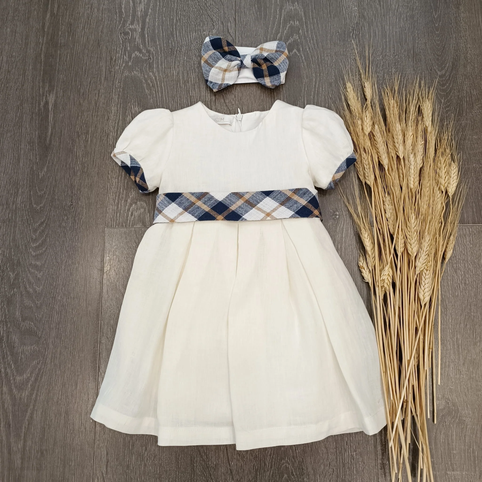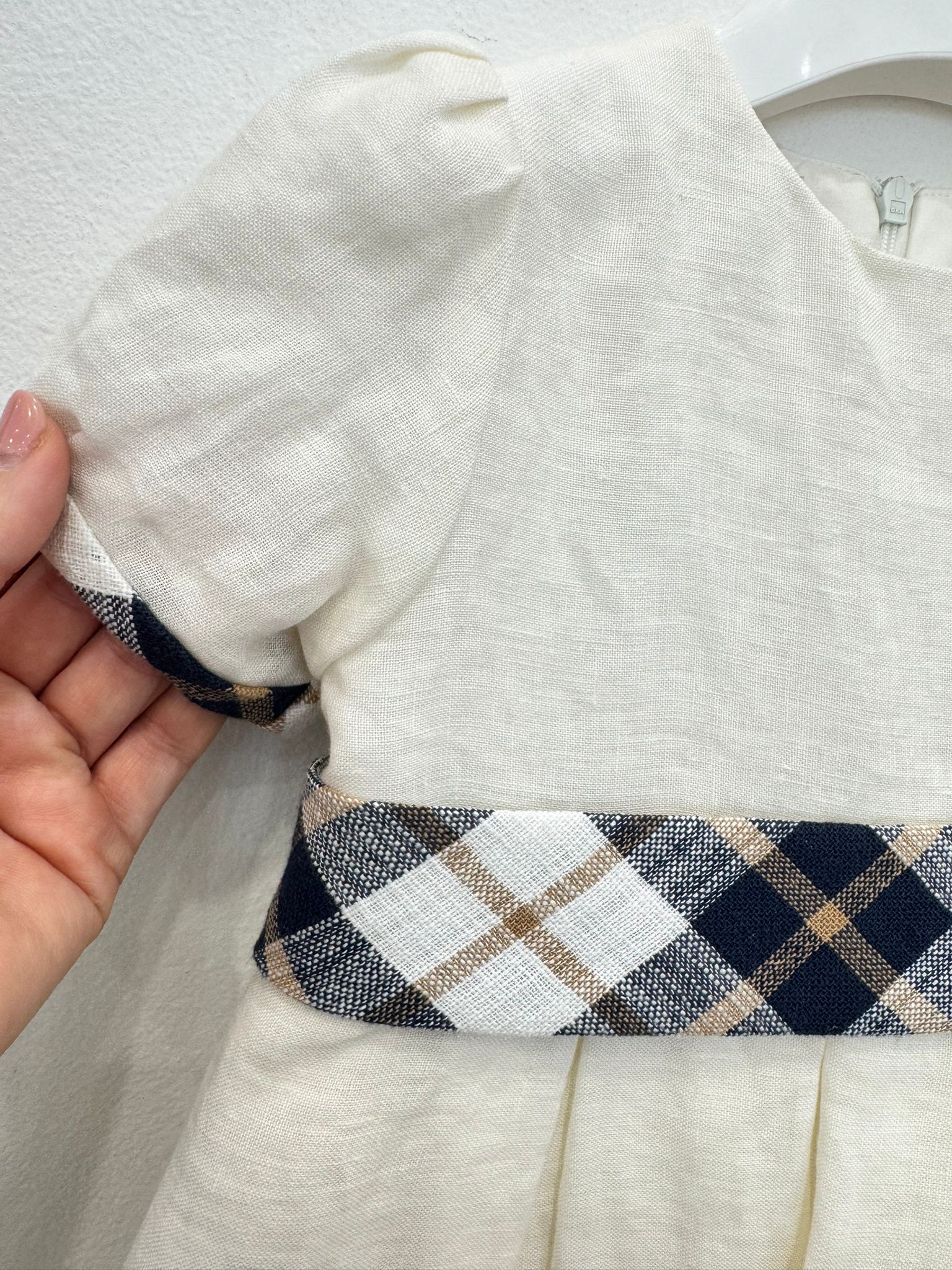 Elegante abito per bambina realizzato in pregiato lino color panna, perfetto per cerimonie ed eventi speciali. Il design raffinato è arricchito da una cintura a quadretti nei toni del blu e beige, che dona un tocco di stile classico e intramontabile. Le maniche corte con dettagli coordinati e le morbide pieghe della gonna aggiungono movimento e delicatezza al capo. Questo abito, disponibile fino alla taglia 30 mesi, garantisce freschezza e comfort grazie alla qualità del tessuto naturale, ideale per le stagioni calde.