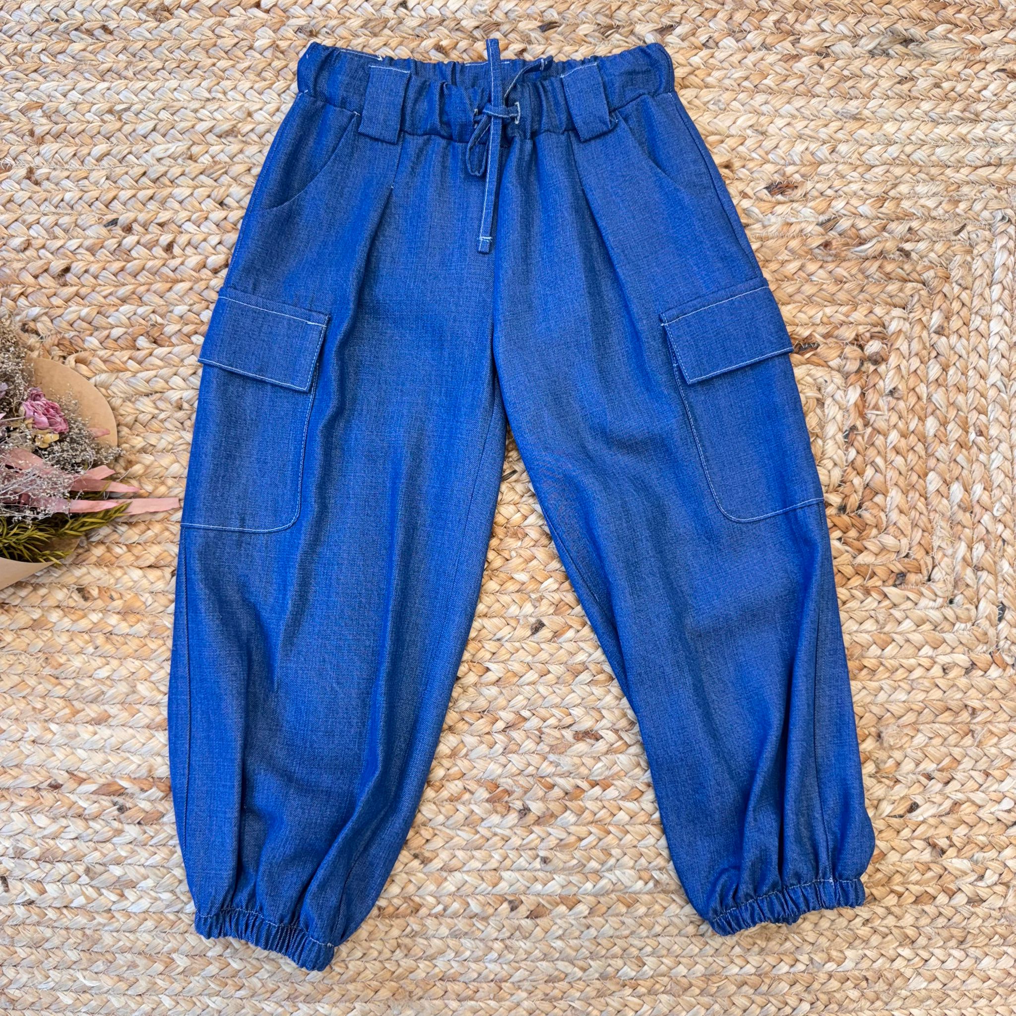 Un completo fresco e moderno: top con fiore applicato e schiena elasticizzata, abbinato a pantaloni cargo in chambray con coulisse e tasconi. Perfetto per look grintosi ma comodi.
