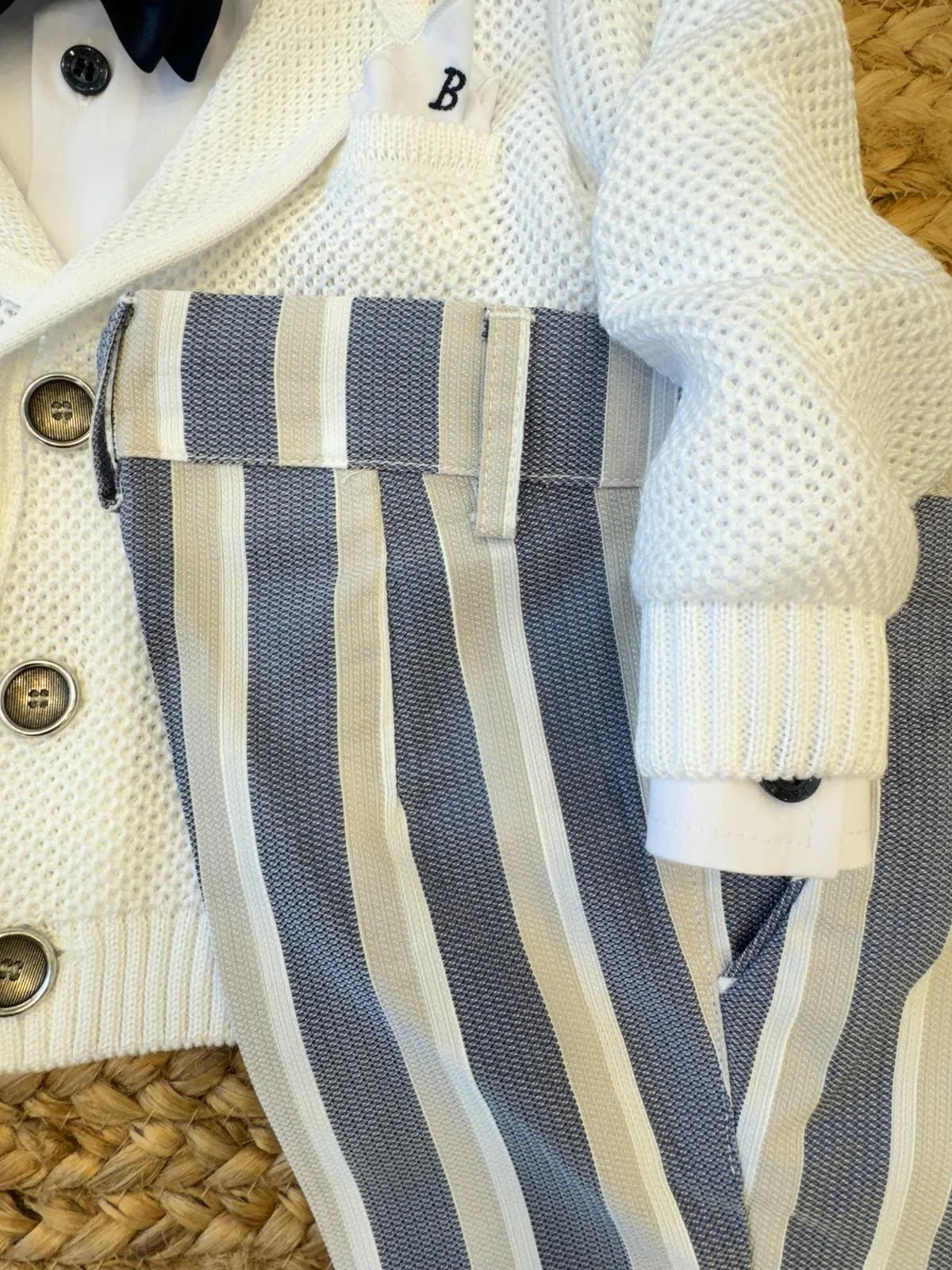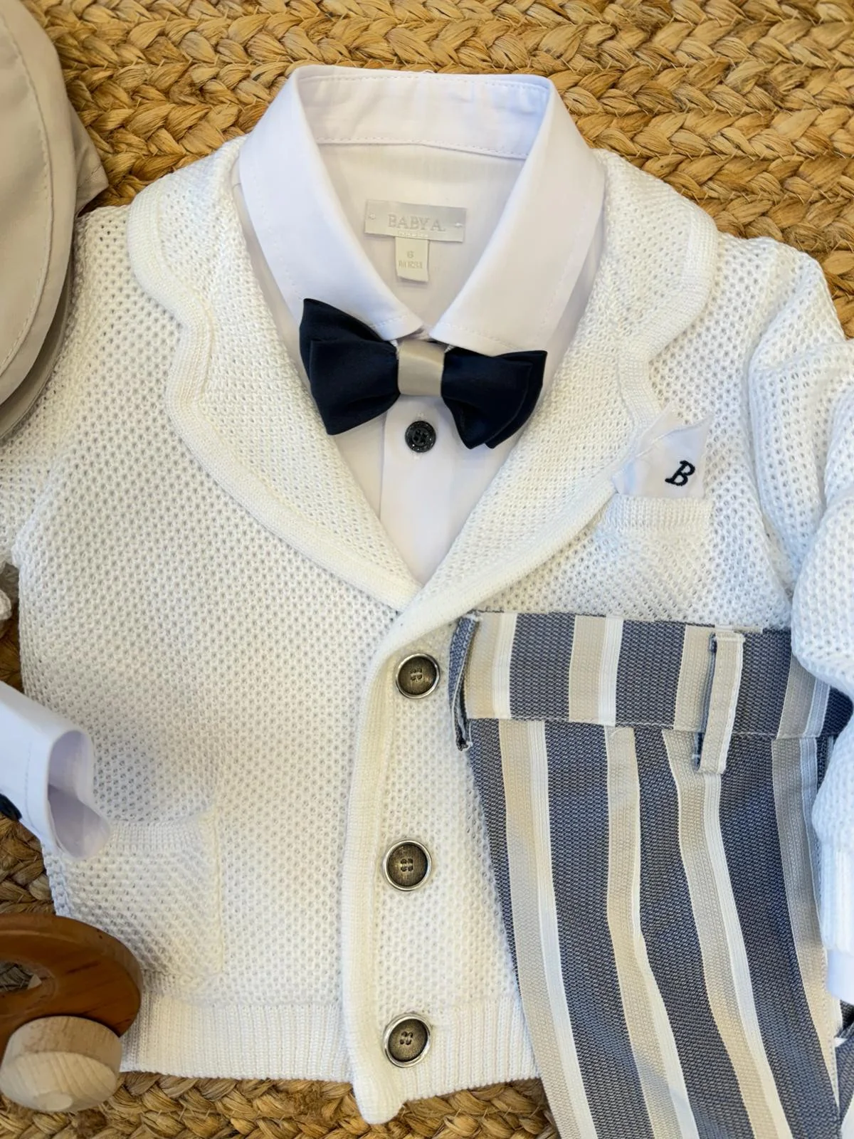 Un look elegante e raffinato per il battesimo del tuo bimbo! Questo completo da battesimo è l’ideale per le cerimonie primaverili ed estive. Il cardigan bianco in maglia traforata con bottoni e taschino si abbina perfettamente ai pantaloni a righe blu e beige per un outfit sofisticato. Il tocco finale è dato dalla camicia bianca con papillon bicolore, per un look elegante e senza tempo.