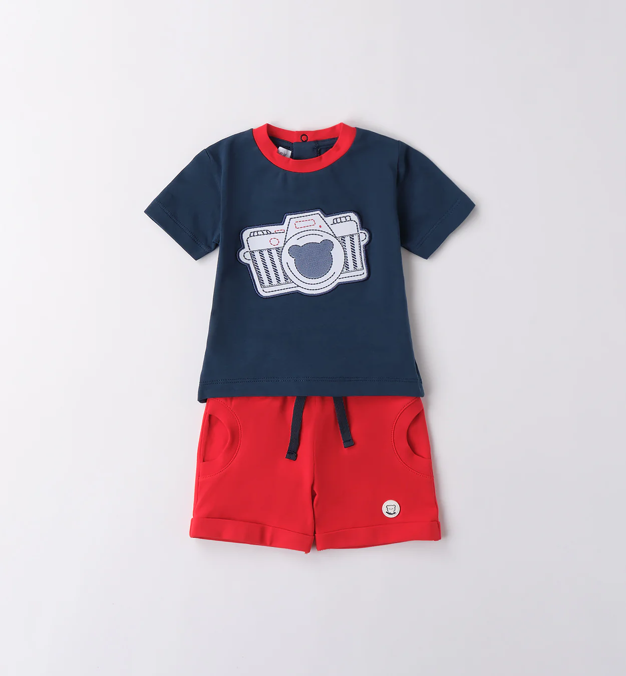 Dinamico completo estivo per neonato, perfetto per un look vivace. Composto da t-shirt blu con ricamo fotocamera e pantaloncini rossi con coulisse regolabile. Realizzato in cotone morbido, offre il massimo comfort nelle giornate più calde.