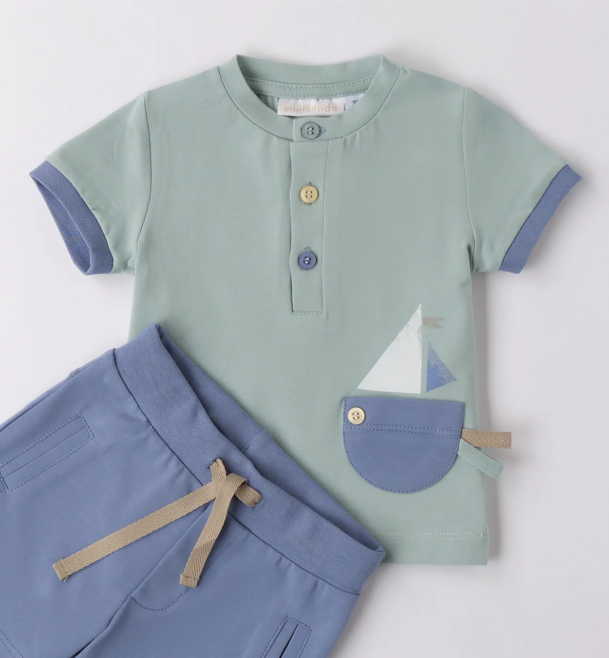 Fresco completo estivo per neonato, perfetto per i giorni più caldi. Composto da una t-shirt verde salvia con ricamo barca a vela e pantaloncini blu con coulisse regolabile. Il tessuto in cotone leggero assicura massimo comfort per il tuo bimbo.