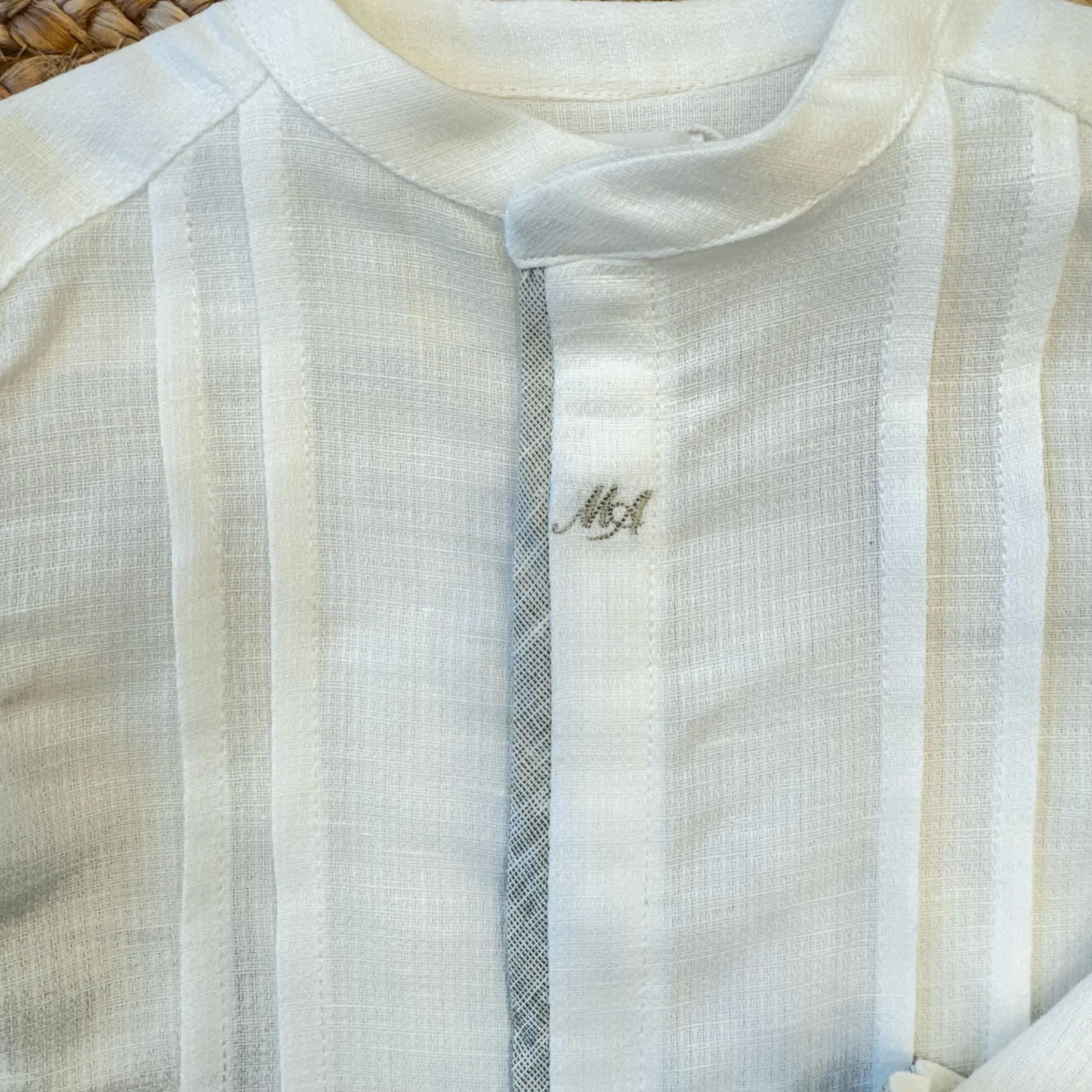 Elegante completo in lino color verde salvia, perfetto per cerimonie. La camicia presenta un raffinato collo coreano e dettagli plissettati sul davanti, con un bordo a contrasto tono su tono. Il pantalone ha una fascia decorativa in vita e risvolto finale, donando un tocco curato e sofisticato. Ideale per eventi speciali.