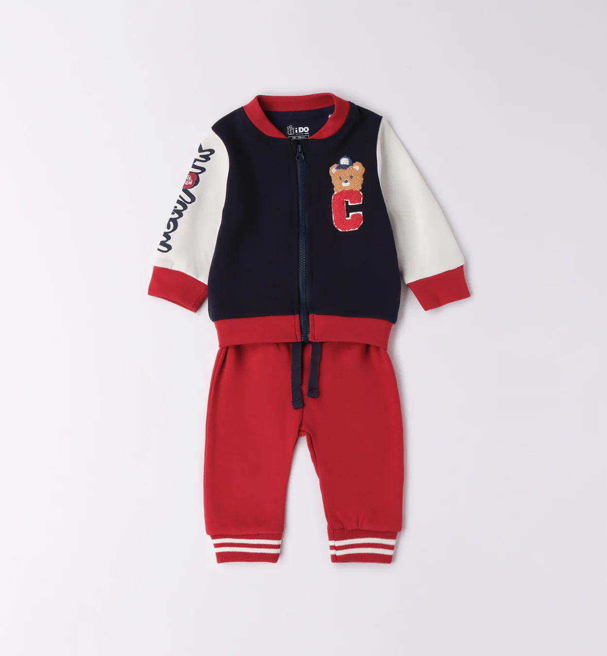 Completo sportivo neonato in morbido cotone, composto da giacca con zip blu navy e maniche bianche con dettagli rossi, decorata con applicazione orsetto e lettera ricamata. Pantaloni rossi con coulisse regolabile e fondo a coste elasticizzate. Un look pratico e confortevole per ogni giorno.