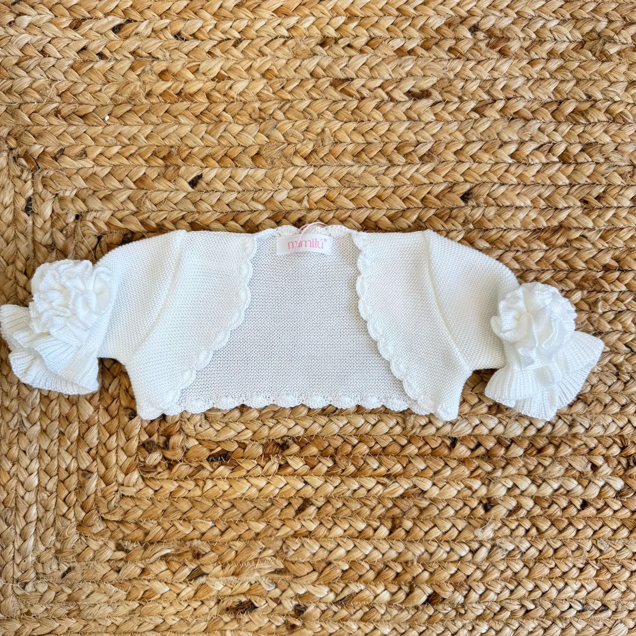 Aggiungi un tocco di raffinatezza ed eleganza al look della tua bimba con questo coprispalle in maglia biancolatte , perfetto per battesimi, cerimonie e occasioni speciali. Il design corto e aderente si abbina perfettamente agli abiti eleganti, mentre i dettagli arricciati e il fiore applicato sulle maniche donano un tocco romantico e sofisticato.