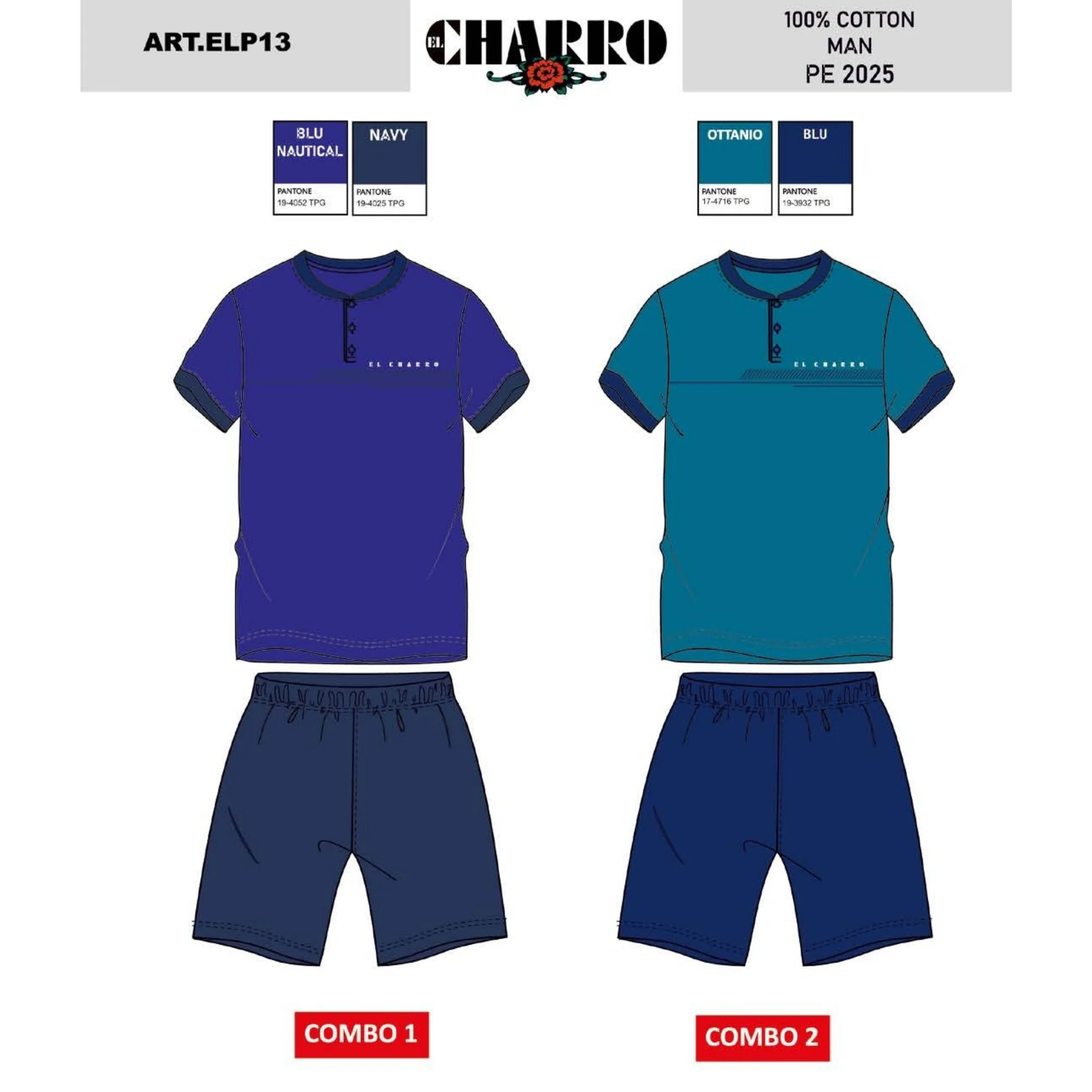 El Charro Estate Pigiama Serafino Uomo Corto Mezza Manica Puro Cotone Con Stampa Art. Elp13