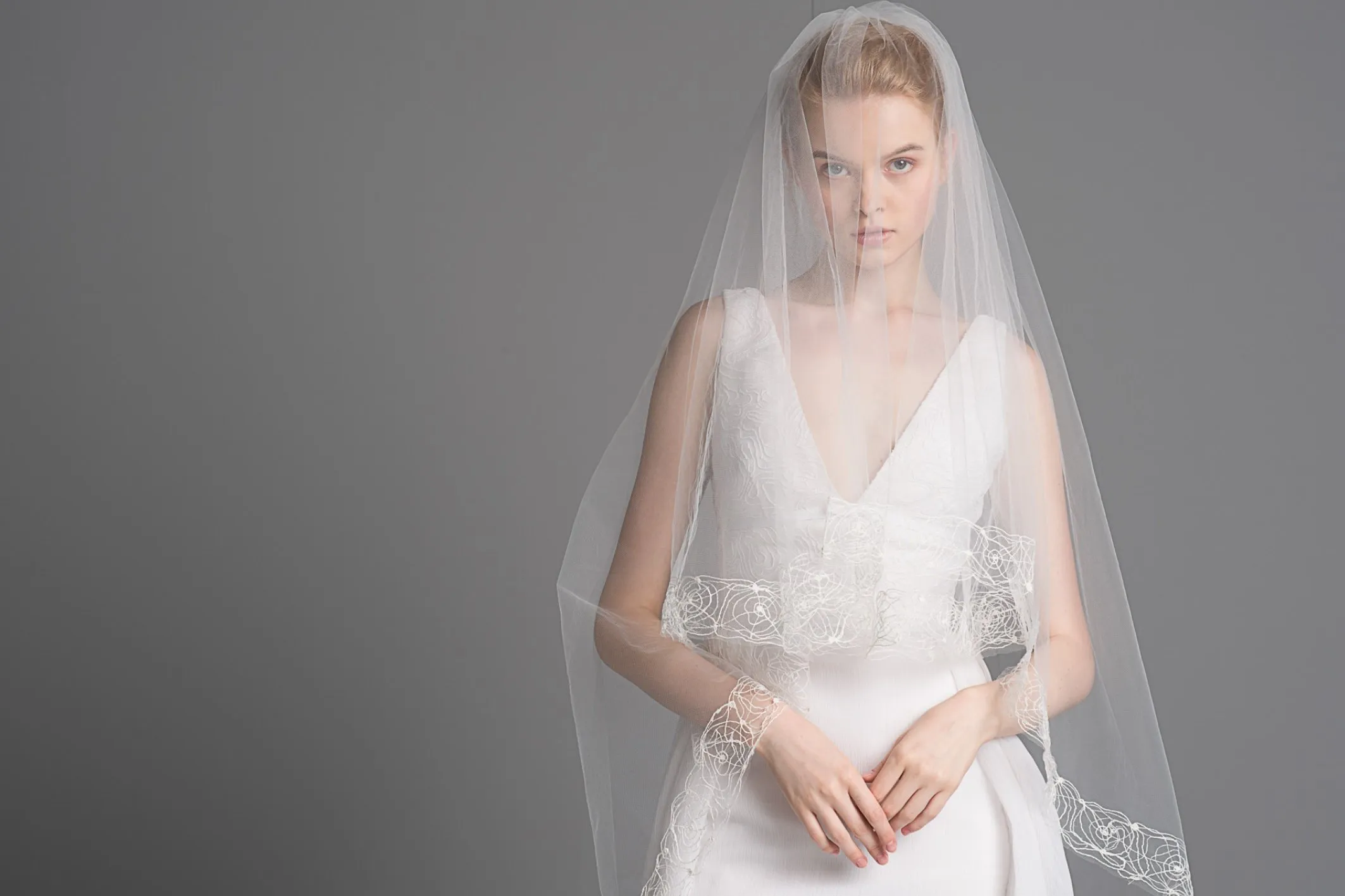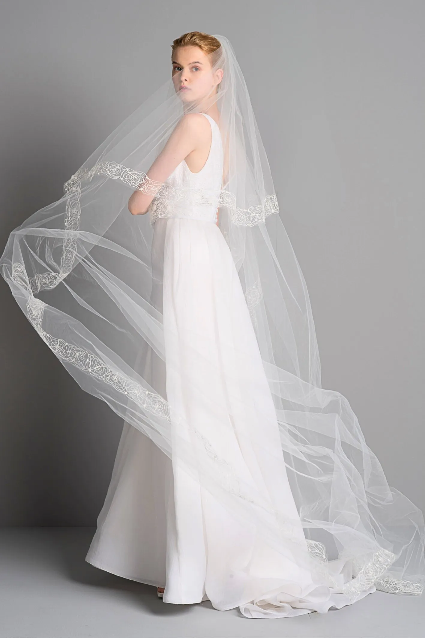Georgia V 101 è un velo da sposa con calata, elegante e senza tempo. Il prezioso ricamo su centina lo rende etereo e particolare, perfetto anche con gli abiti dallo stile più minimale.