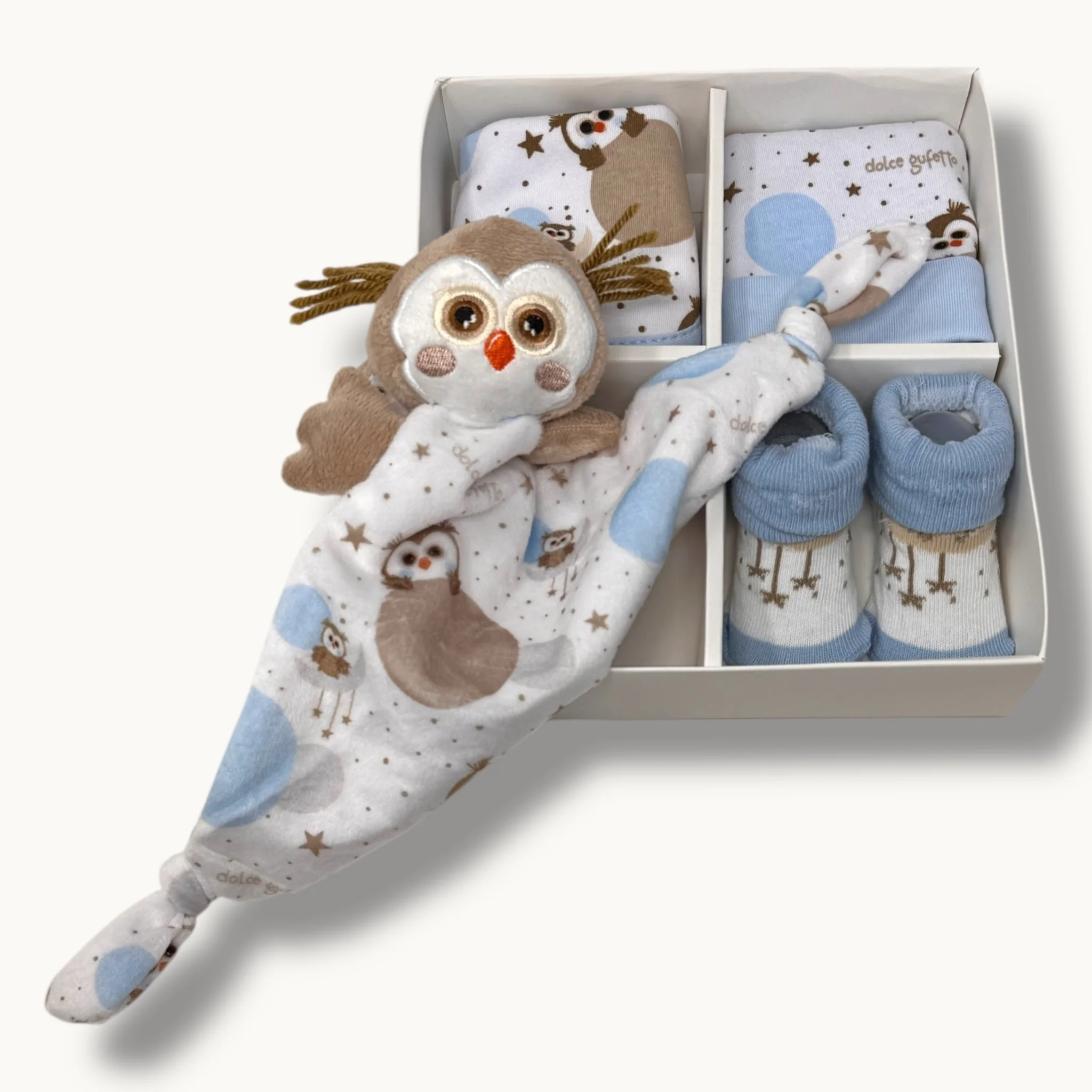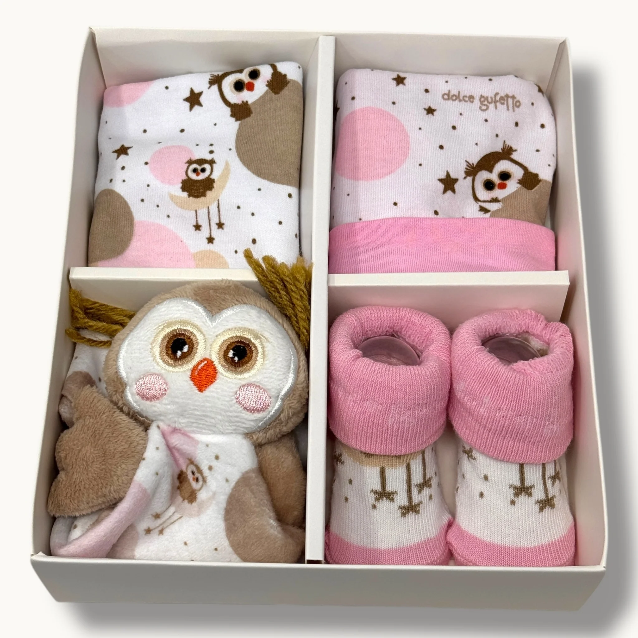 Ir1242 Gufetto – Irge Baby Set Regalo Gufetto Baby 4 Pezzi (1 Cappellino +1 Dou Dou + 1 Bavetta + 1 Paio Calzini)