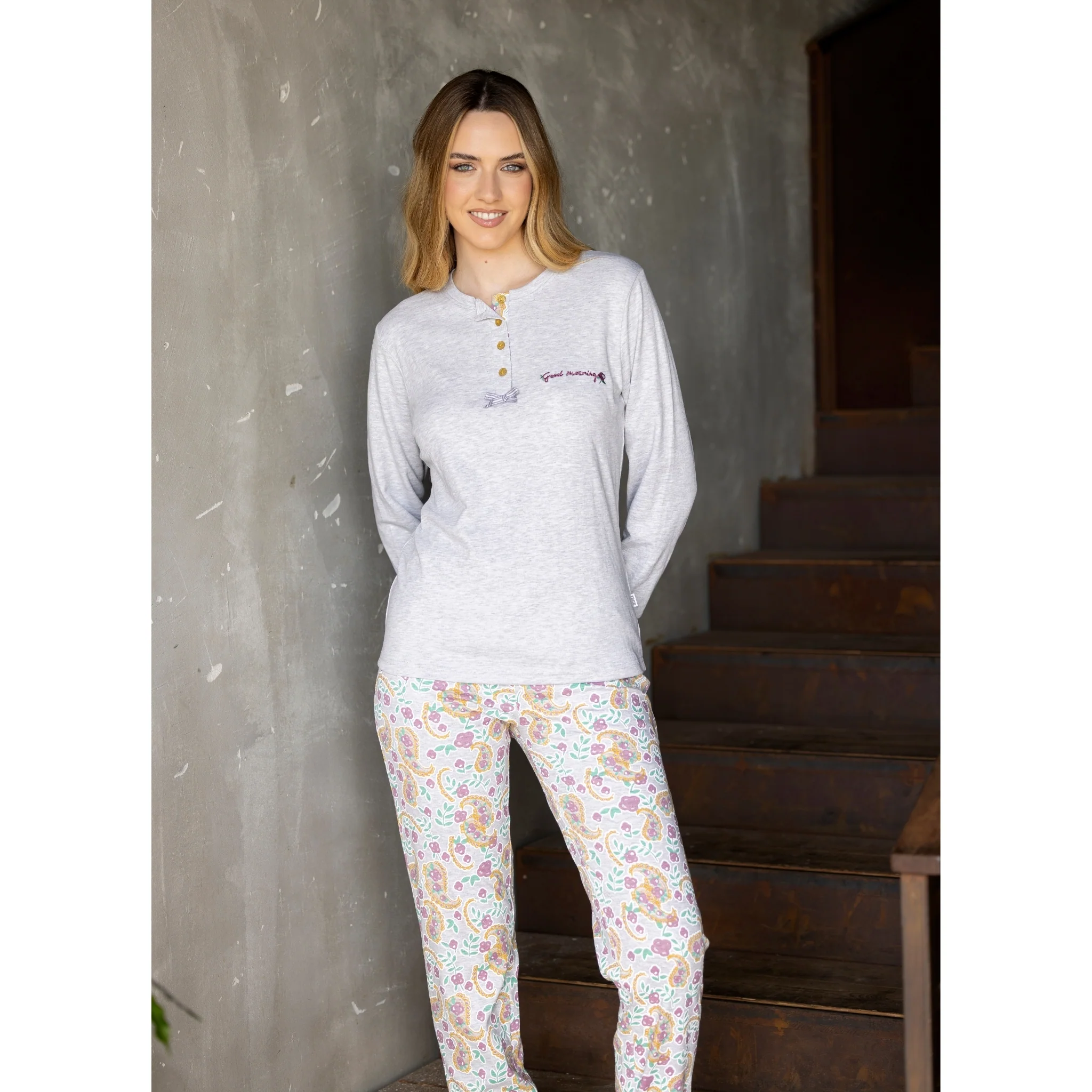 Mii2422 – Irge Inverno Donna Pigiama Serafino 4 Bottoni In Caldo Cotone 100% Pantalone Fantasy