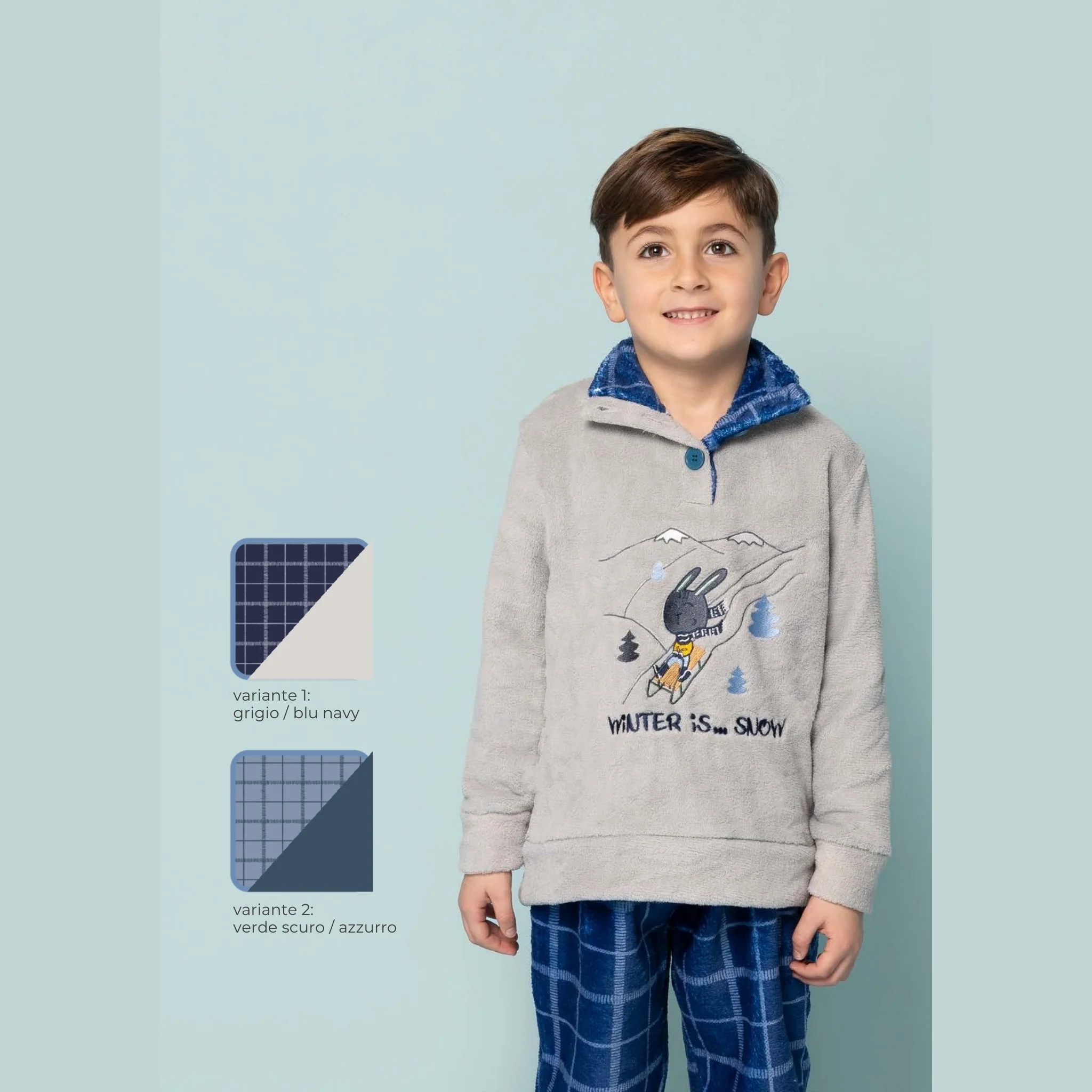 ikc430 Pig – -irge Linea Inverno- Pigiama Bimbo Lupetto 3 Bottoni In Coral Con Ricamo E Pantalone Fantasia
