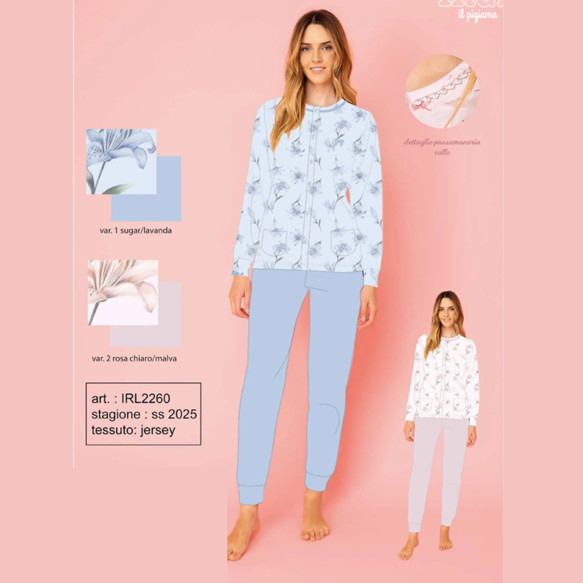 Irl2260 Pig – -irge Primavera- Pigiama Donna Lungo Aperto Avanti Fantasia In Puro Cotone Con Tasche