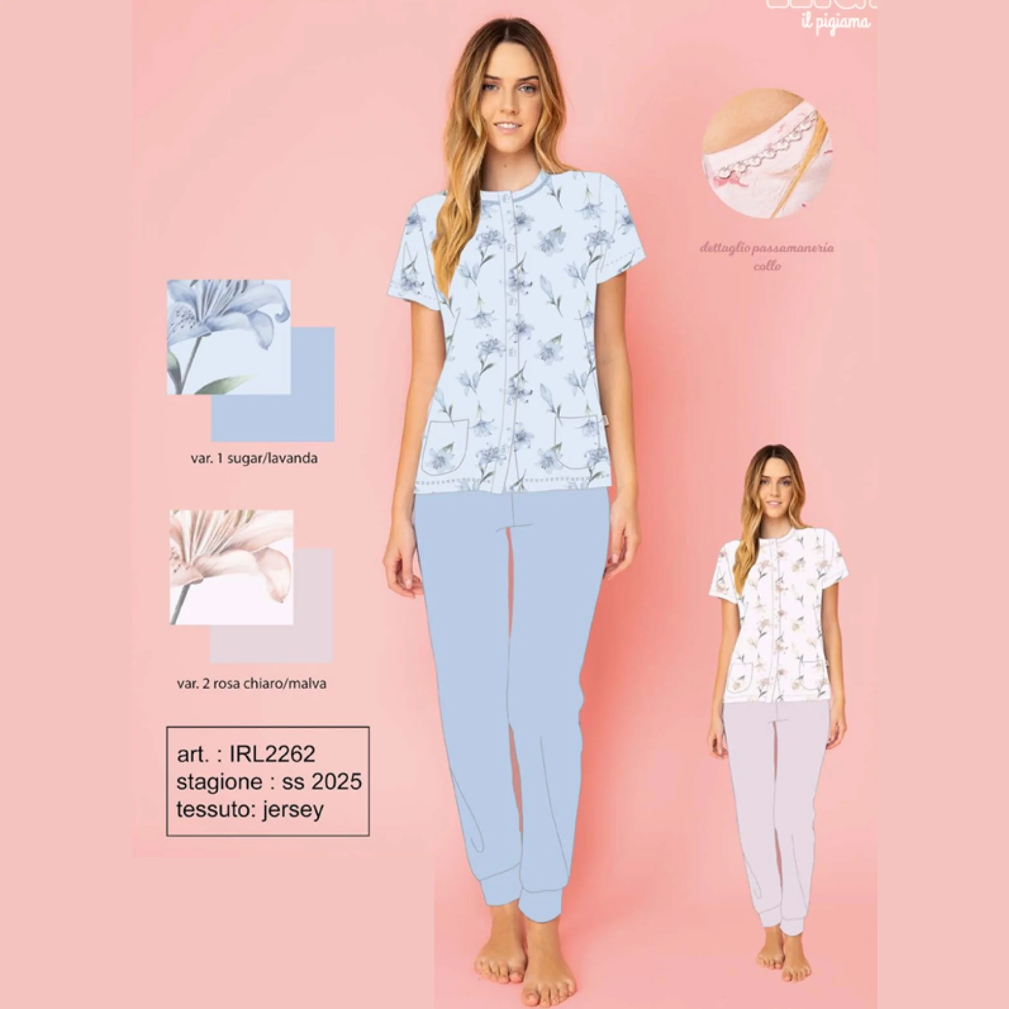 Irl2262 – -irge Primavera- Pigiama Donna (m/manica Pantalone Lungo) Aperto Avanti Fantasia In Puro Cotone