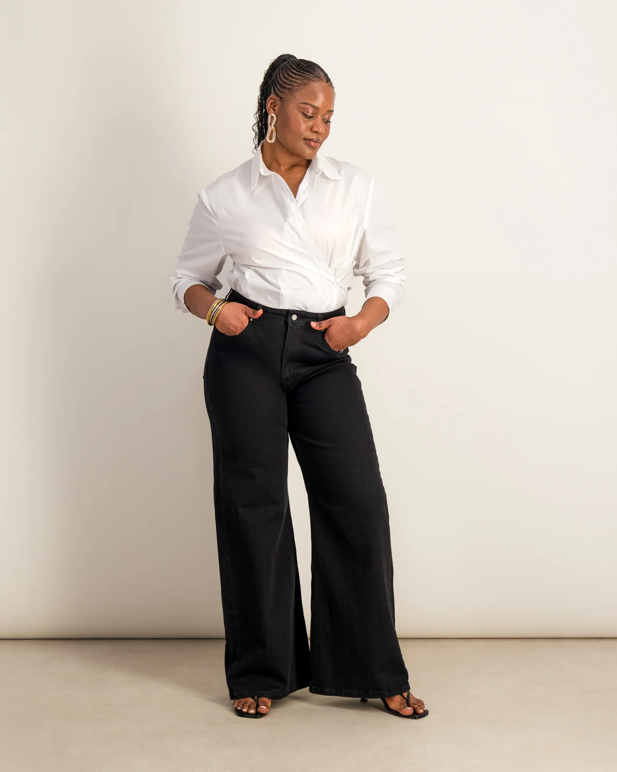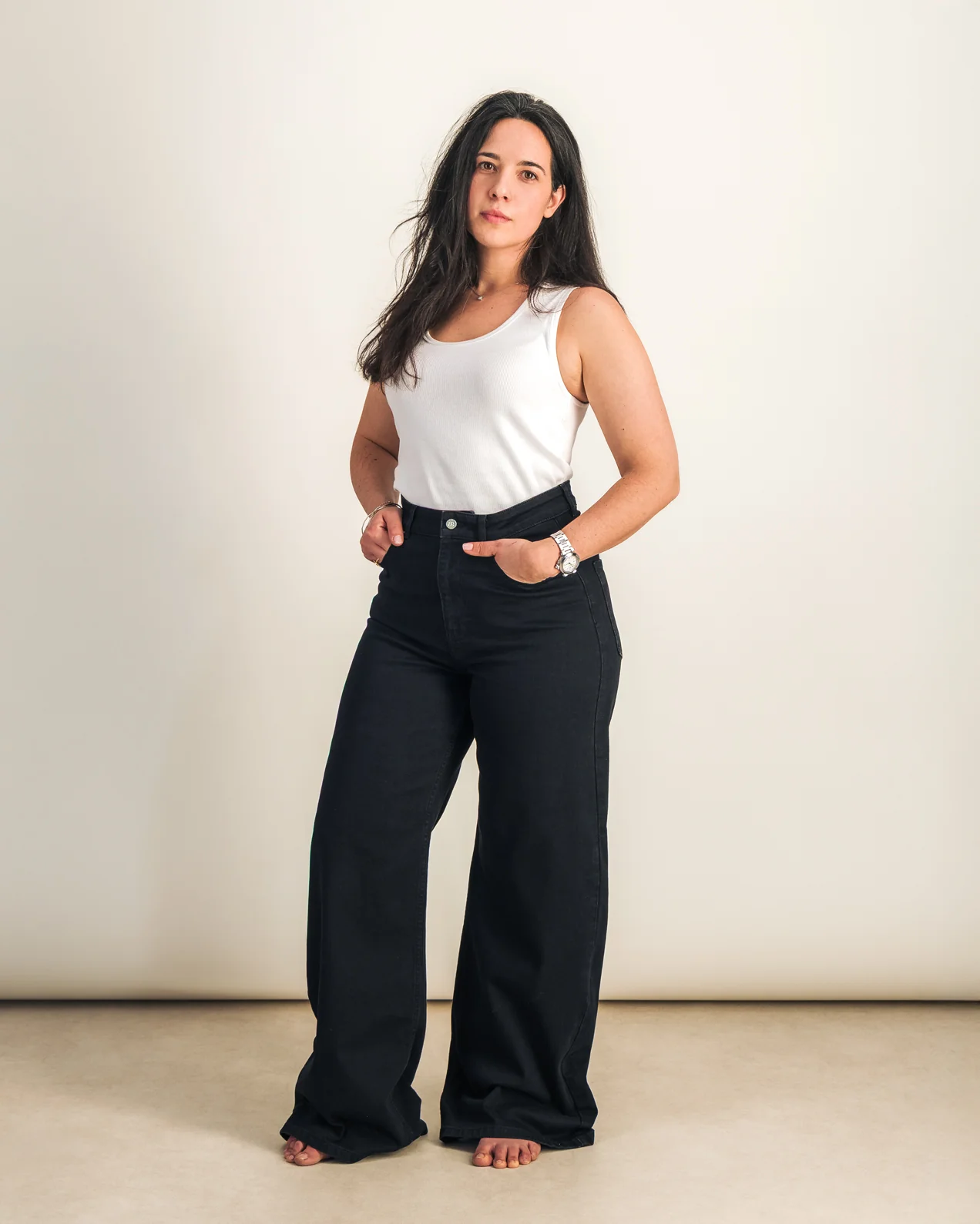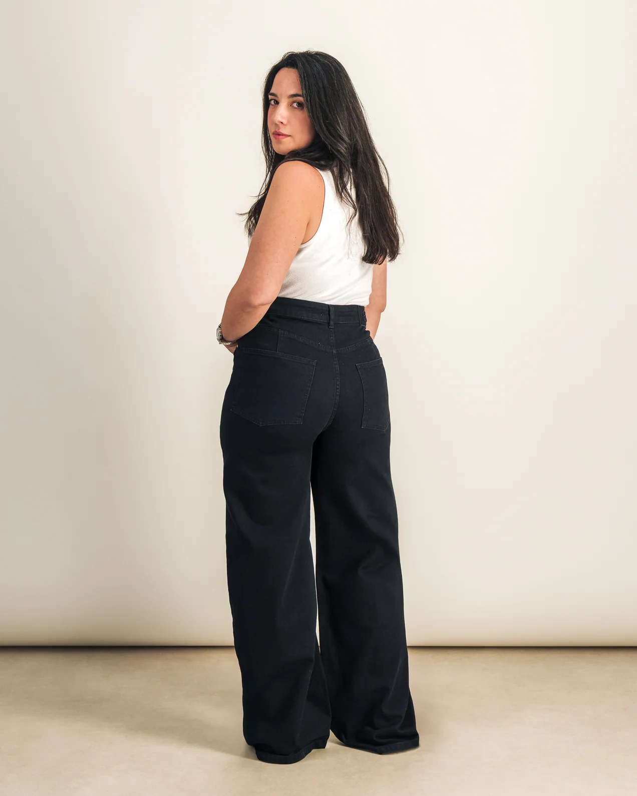 • Jean wide• Jambes amples• Coupe large pour allonger la silhouette• Taille haute• Quatre poches• Fermeture braguette zippée