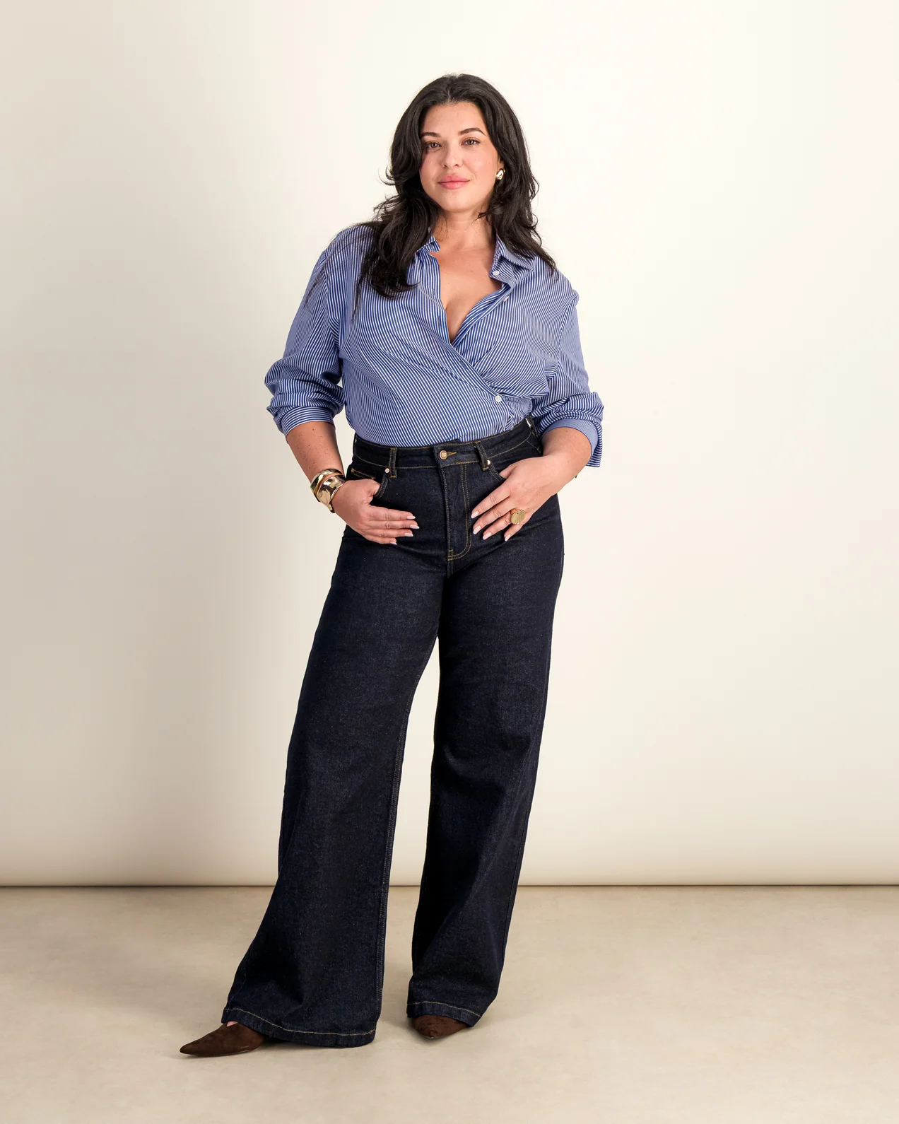 • Jean wide• Jambes amples• Coupe large pour allonger la silhouette• Taille haute• Surpiqûres contrastées de couleur tabac• Quatre poches• Fermeture braguette zippée