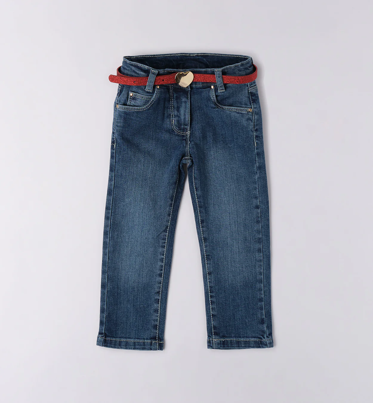 Jeans bimba in denim blu con vestibilità comoda e lineare, perfetti per l’uso quotidiano. Il modello è completato da una cintura rossa glitterata con fibbia a cuore dorata, dettaglio che aggiunge un tocco elegante e divertente ai look di ogni giorno. Tasche funzionali davanti e dietro.
