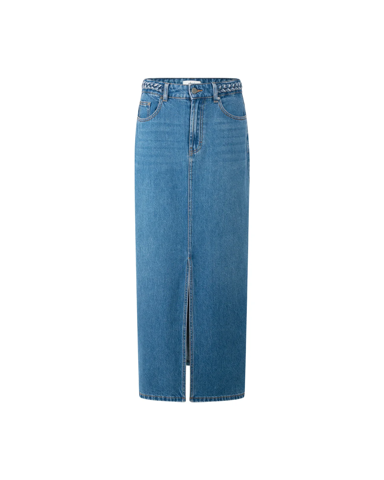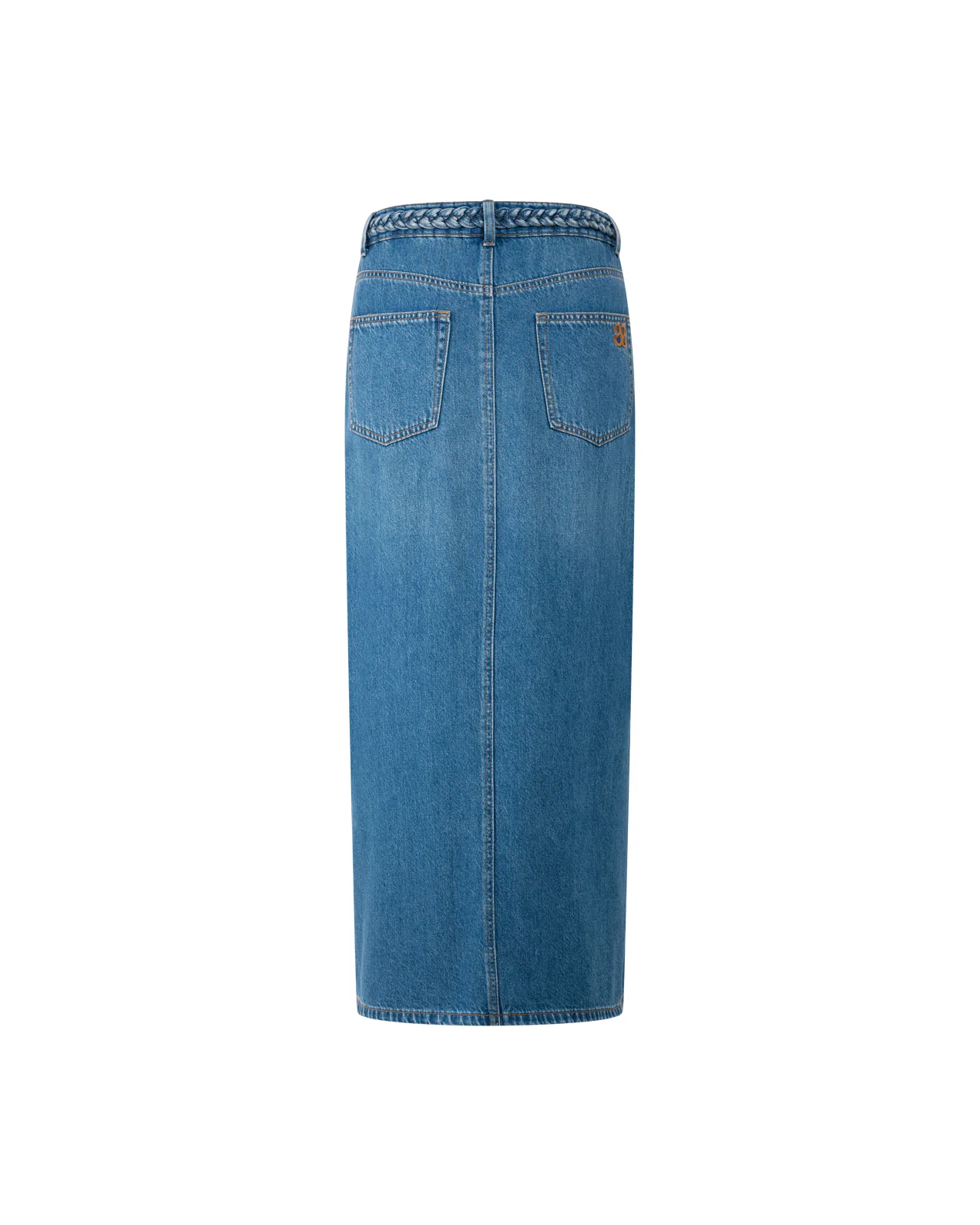 • Jupe droite en jean• Longueur “midi” mi mollet• Ceinture tressée avec passants de ceinture• Fermeture braguette zippée• Cinq poches• Poches plaquées au dos avec logo brodé• Fente milieu devant