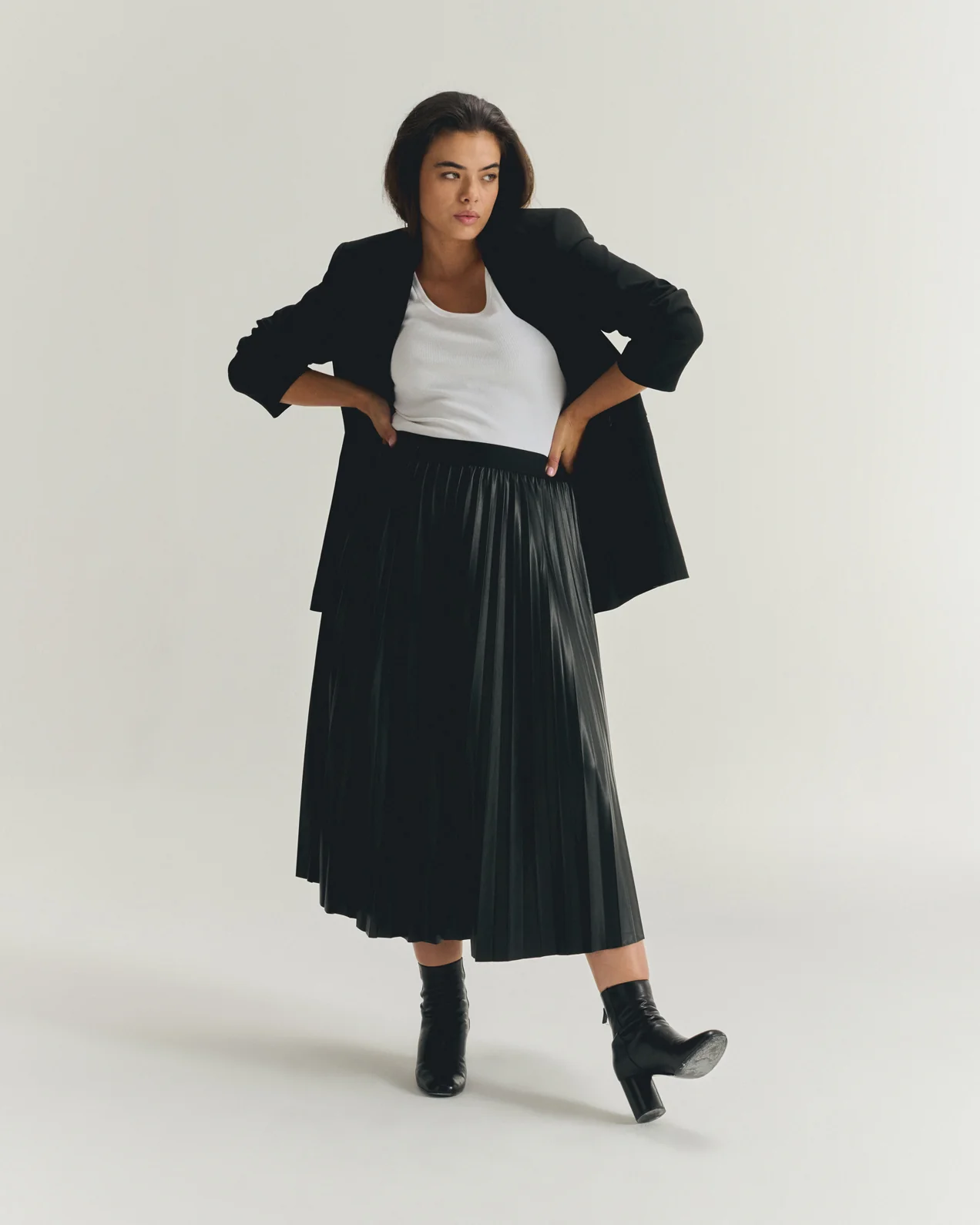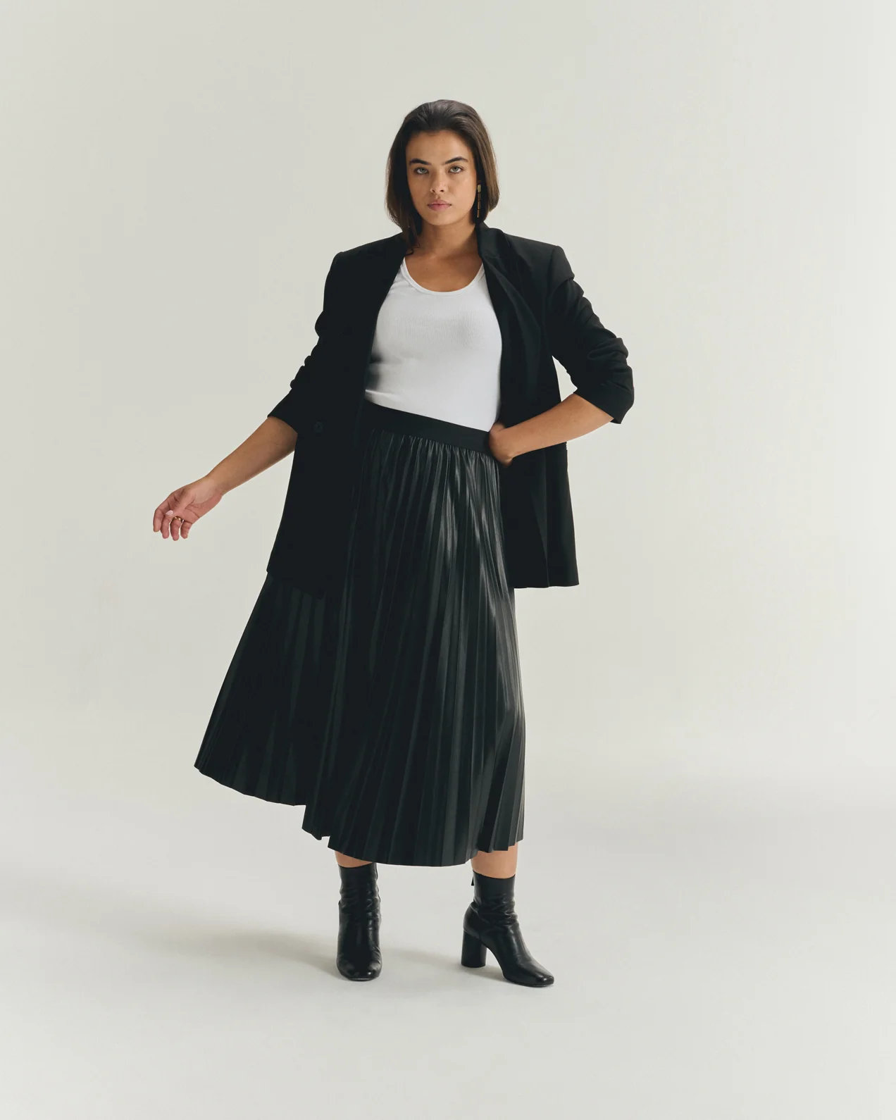 • Jupe plissée• Matière en simili cuir• Longueur “midi” mi mollet• Taille élastiquée