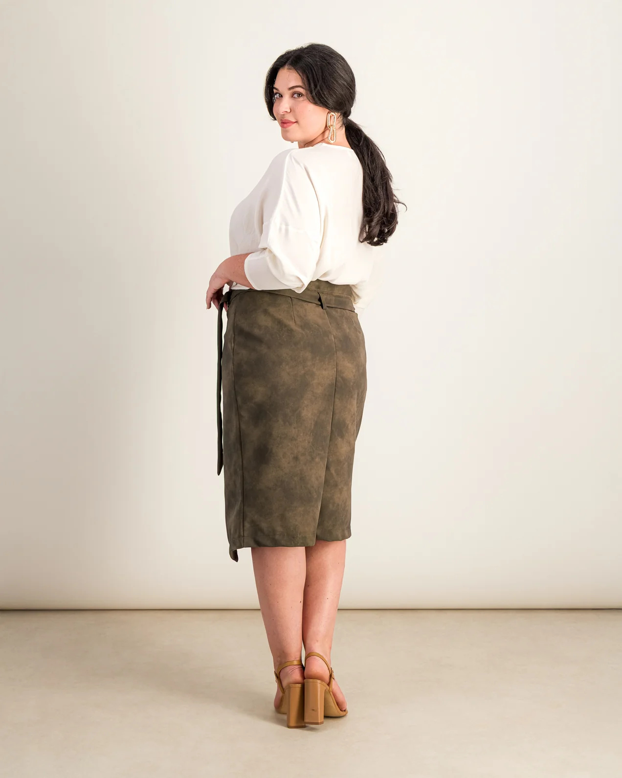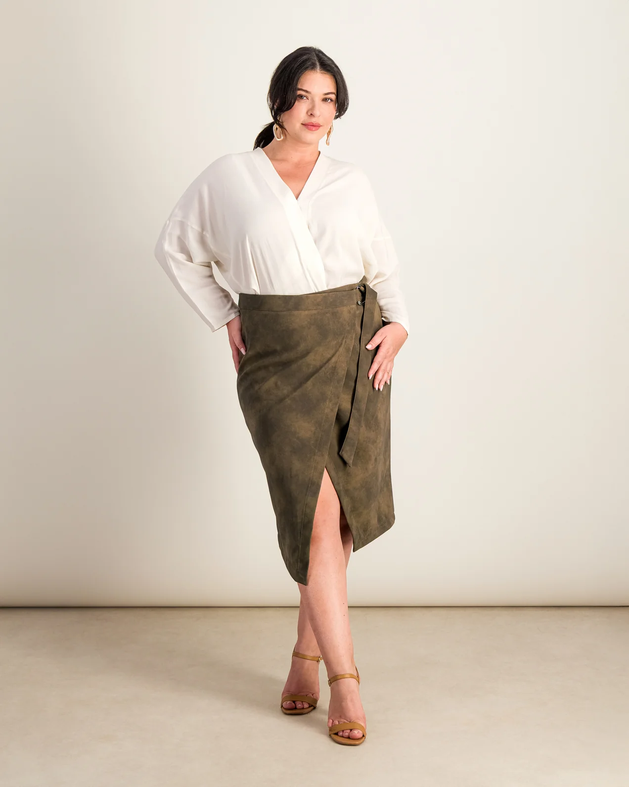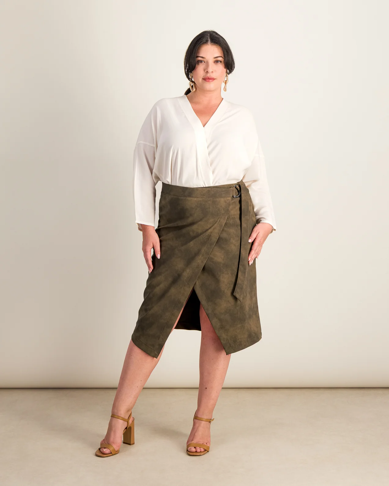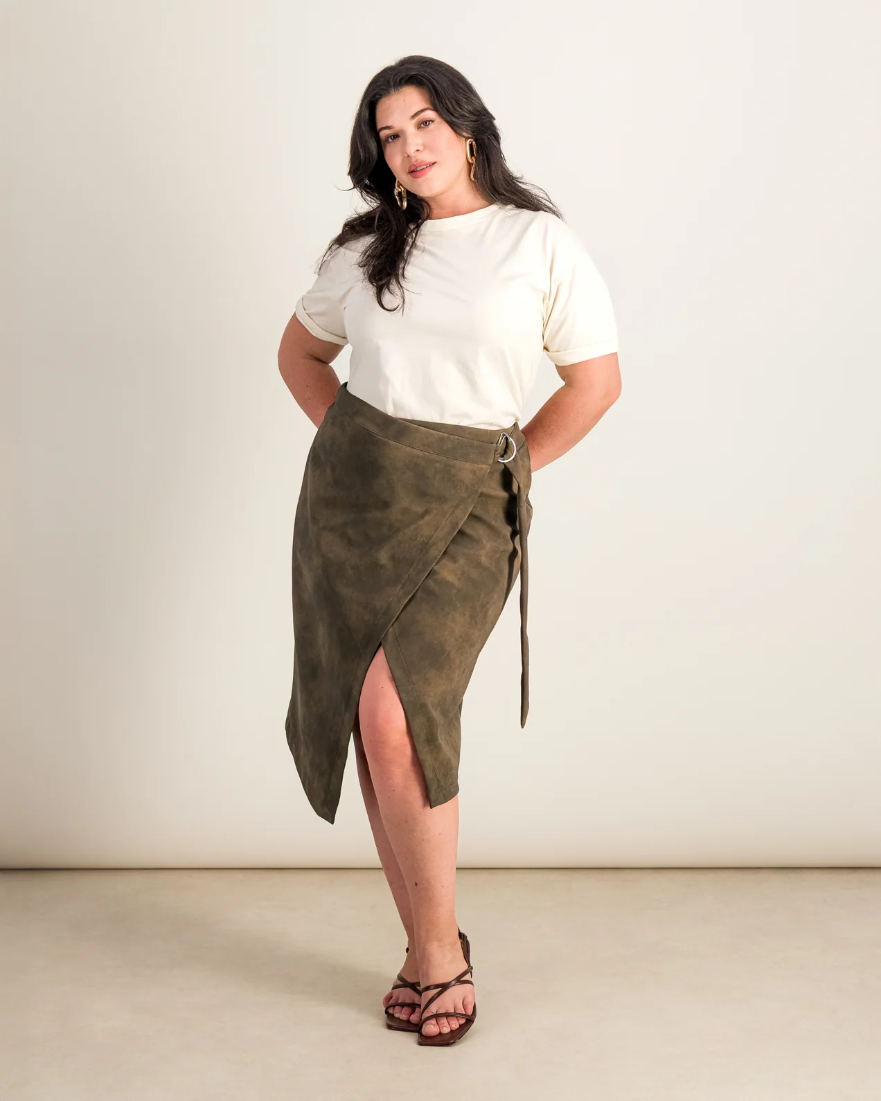 • Jupe portefeuille• Matière simili cuir effet daim• Longueur genou• Ceinture cousue dans la couture latérale