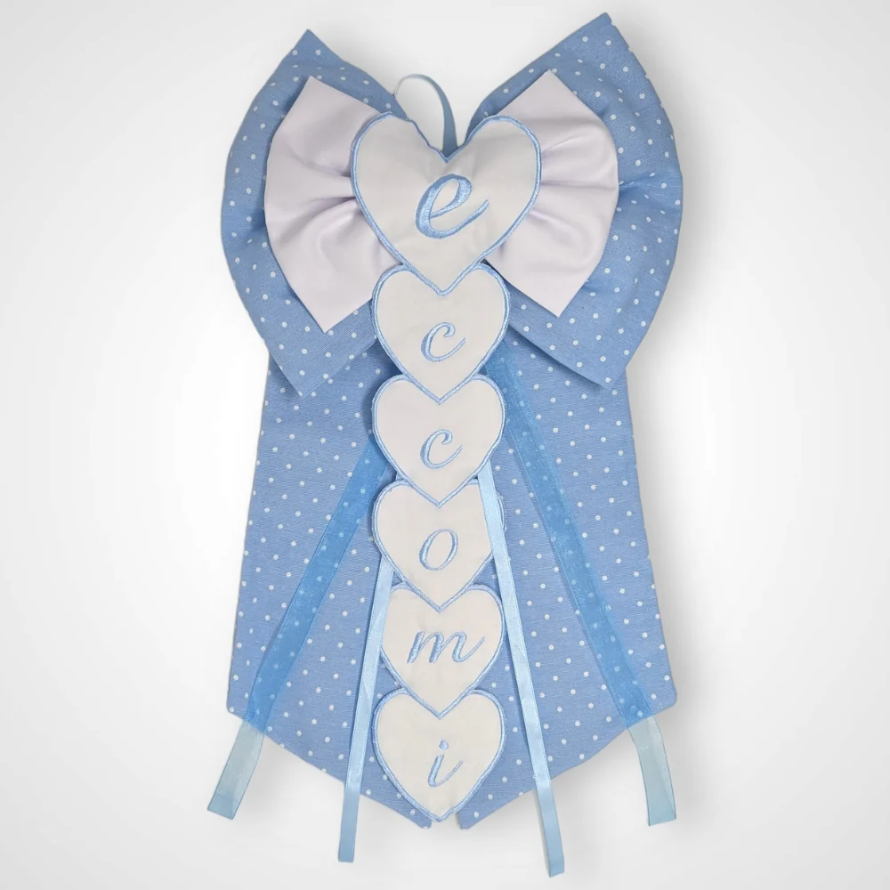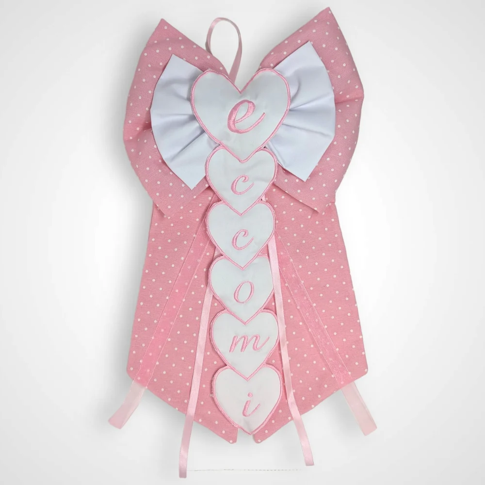 Cocc Eccomi – Coccarda A Forma Di Fiocco Con Ricamo Eccomi Disponibile In Rosa E Celeste E Taglia Media E Grande