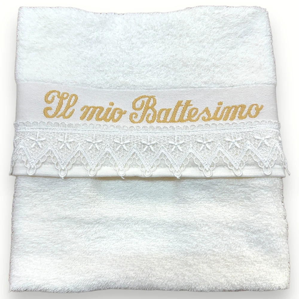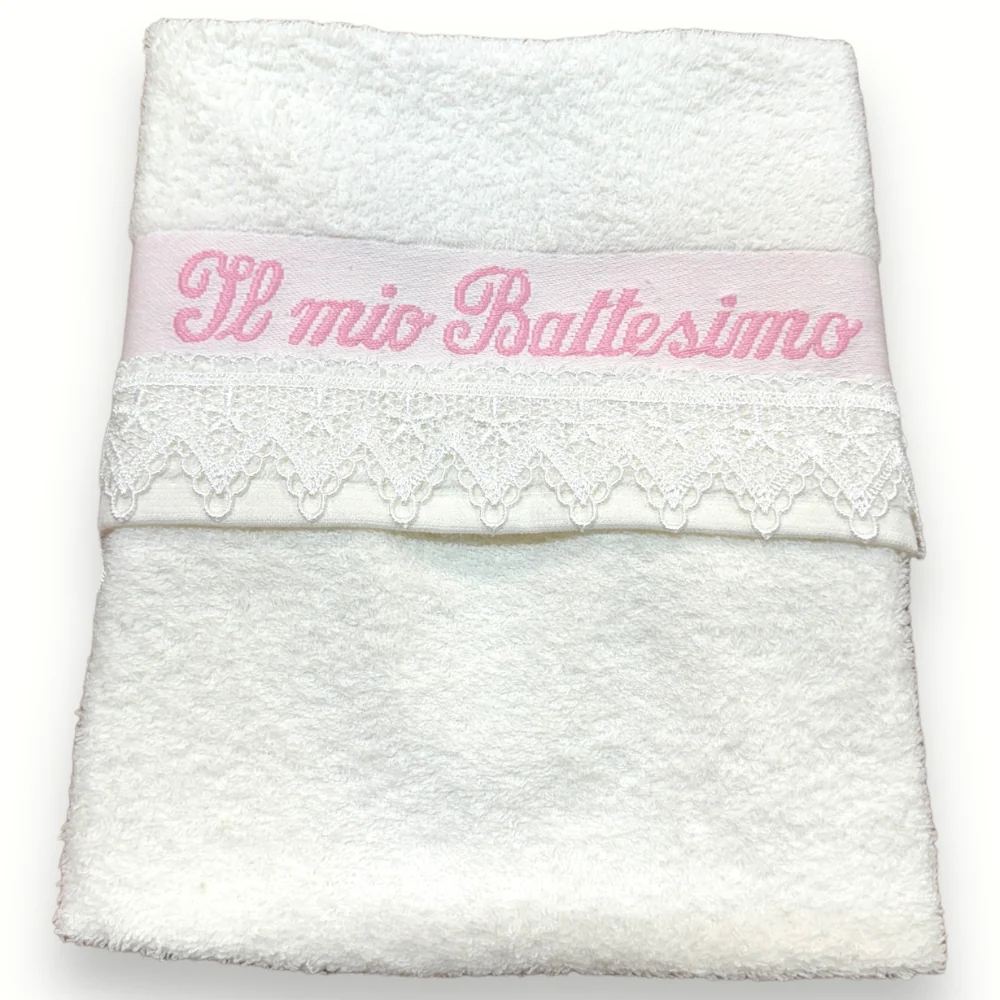 801 Asciug – -nancy Baby- Asciugamano Battesimale Con Pizzo E Ricamo (il Mio Battesimo) In Puro Cotone
